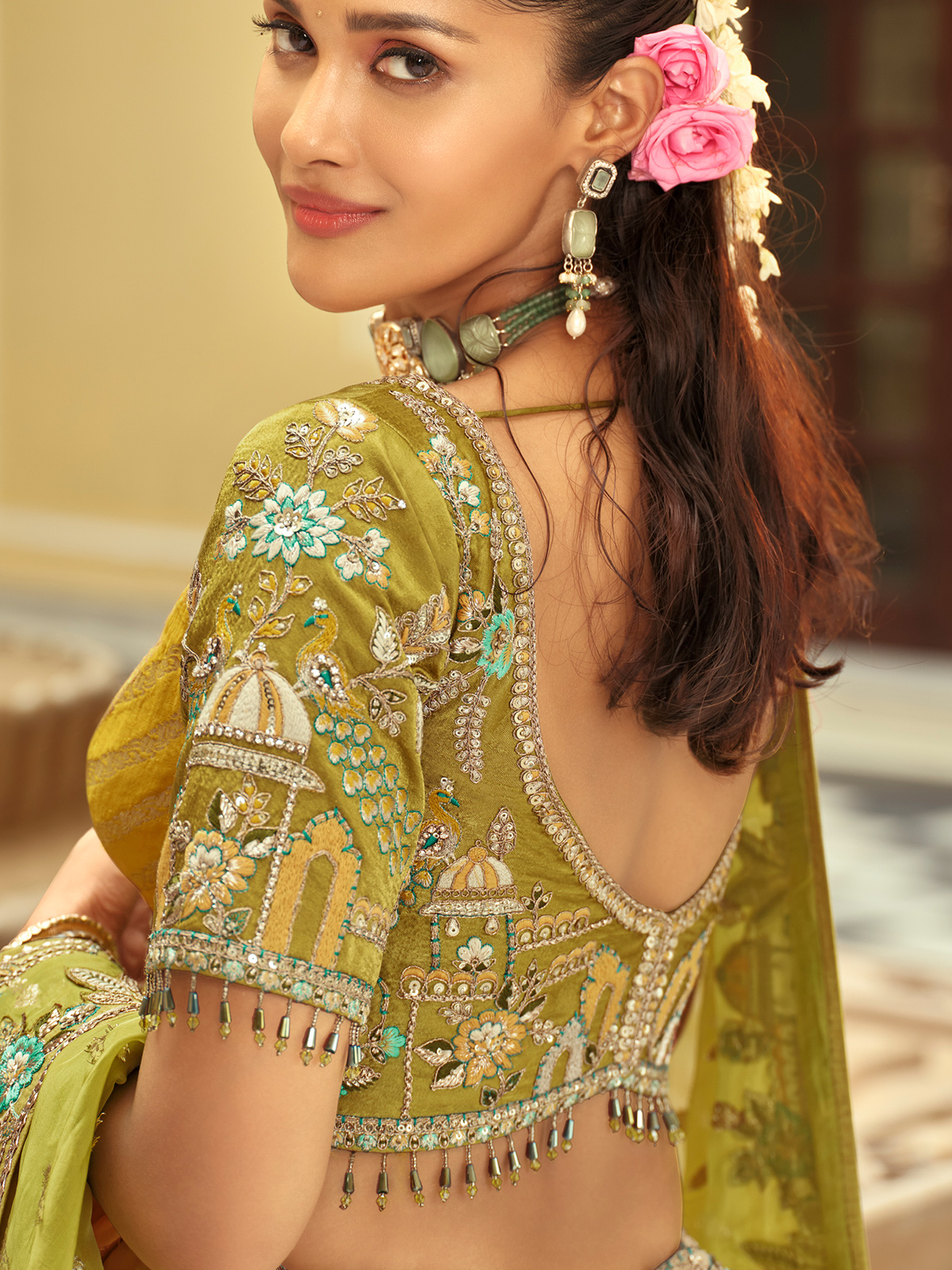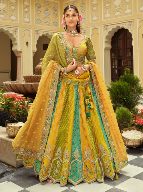 This multicolor silk lehenga pairs beautifully with a jacquard georgette dupatta featuring artistic woven detailing. Enhanced with elegant embellishments, it delivers a vibrant celebratory aura. Designed for haldi, sangeet, and wedding functions, it stands out with its refreshing color play and premium craftsmanship.