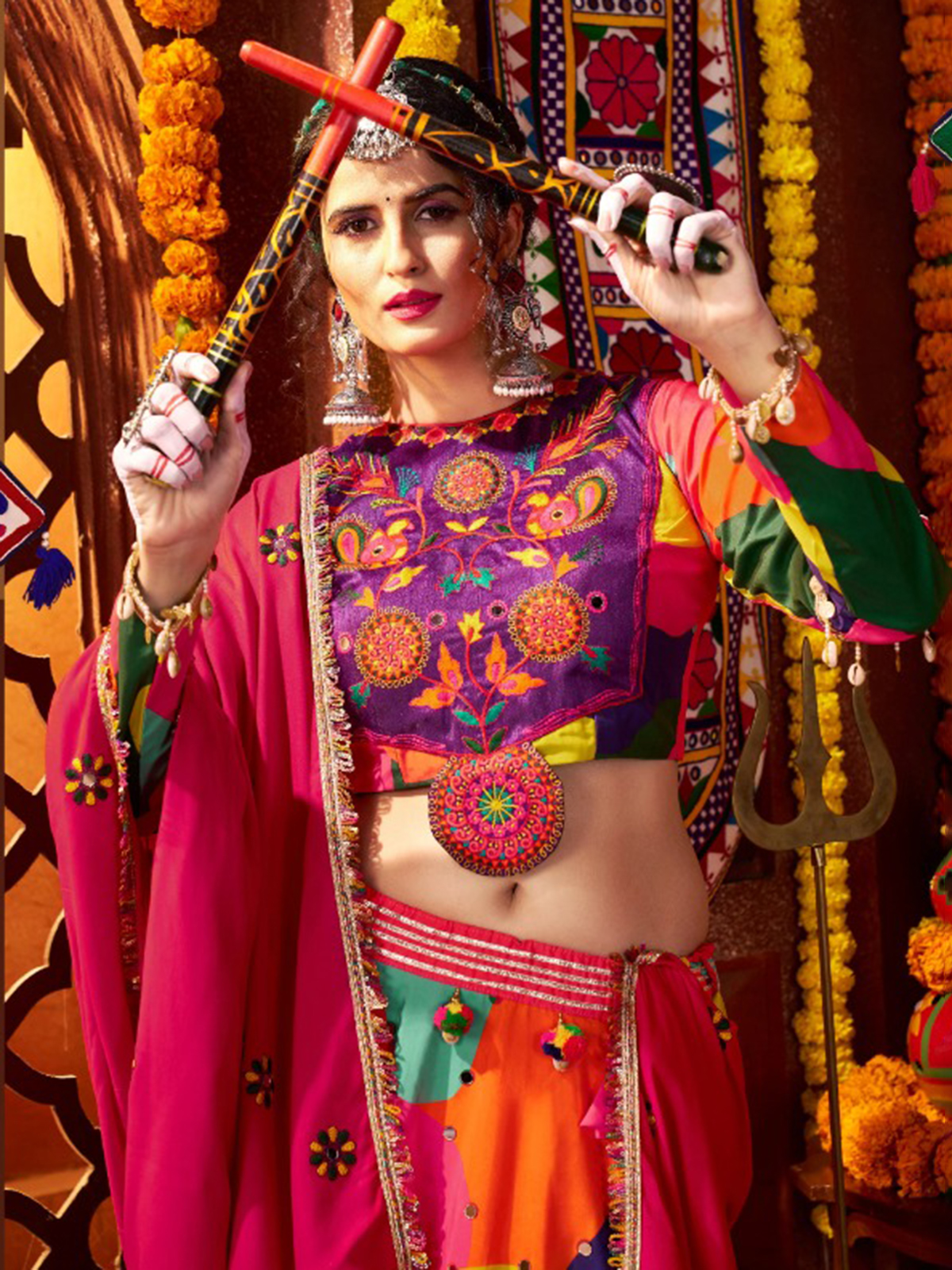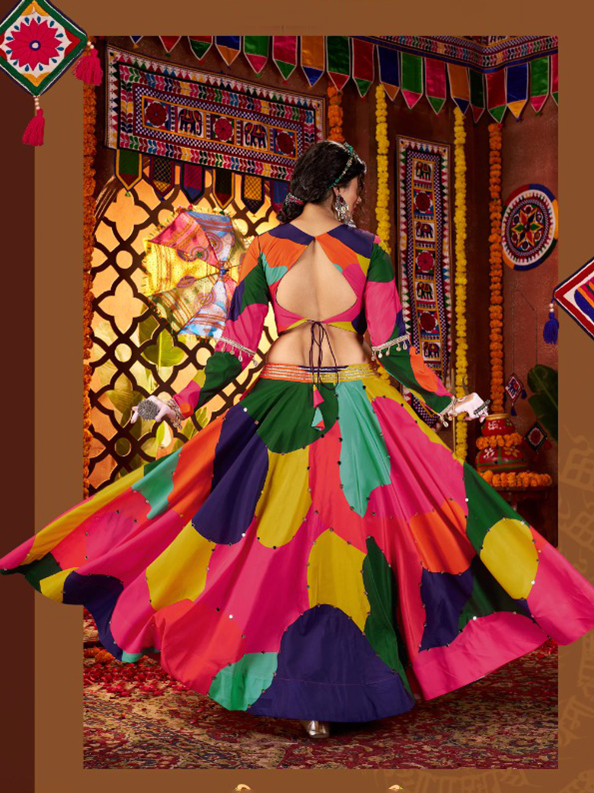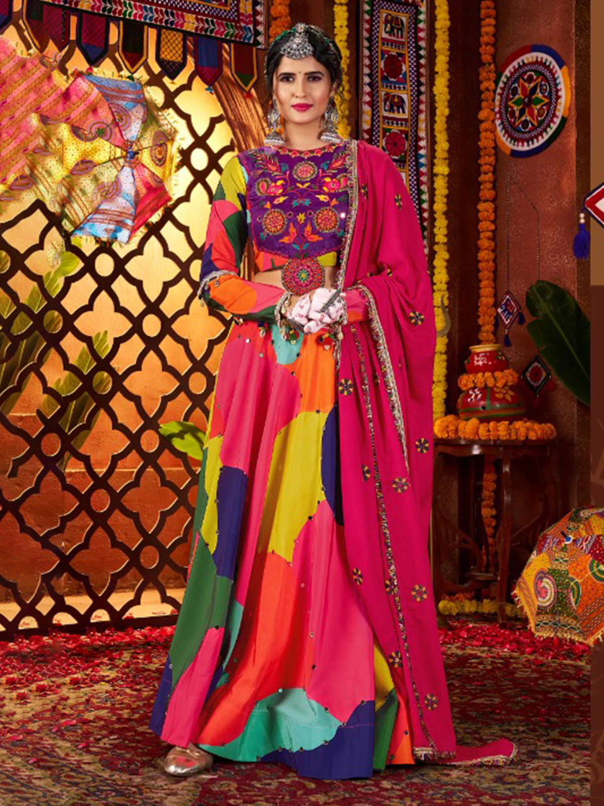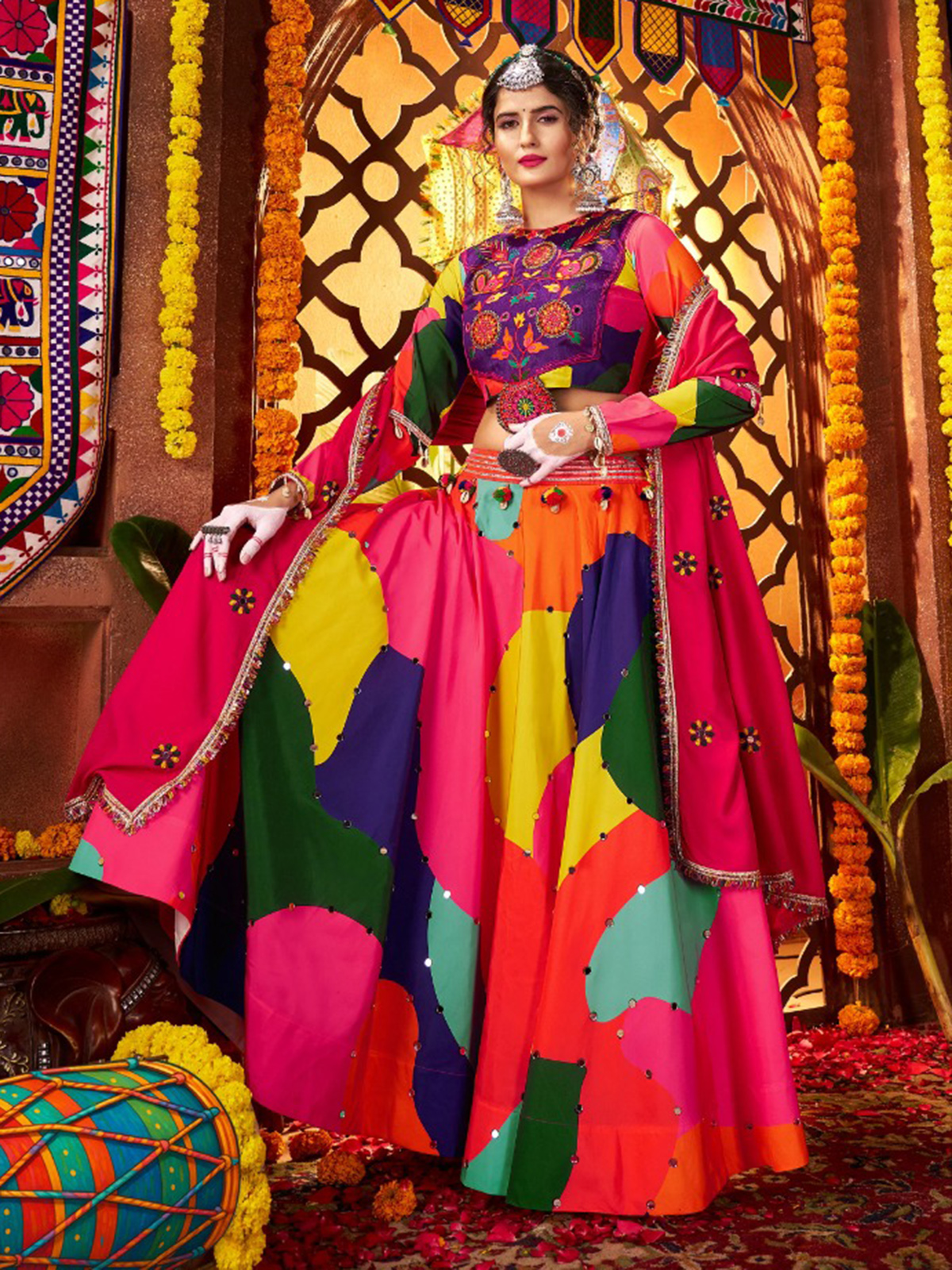 For garba nights, opt for a striking muslin silk lehenga featuring vivid multicolor tones, bandhani motifs, and rich accents of embroidery, gota, and mirror work. It is paired with an ornate muslin silk choli styled with a refined boat neckline and full-length sleeves, and finished with a coordinated dupatta that brings the look together effortlessly.