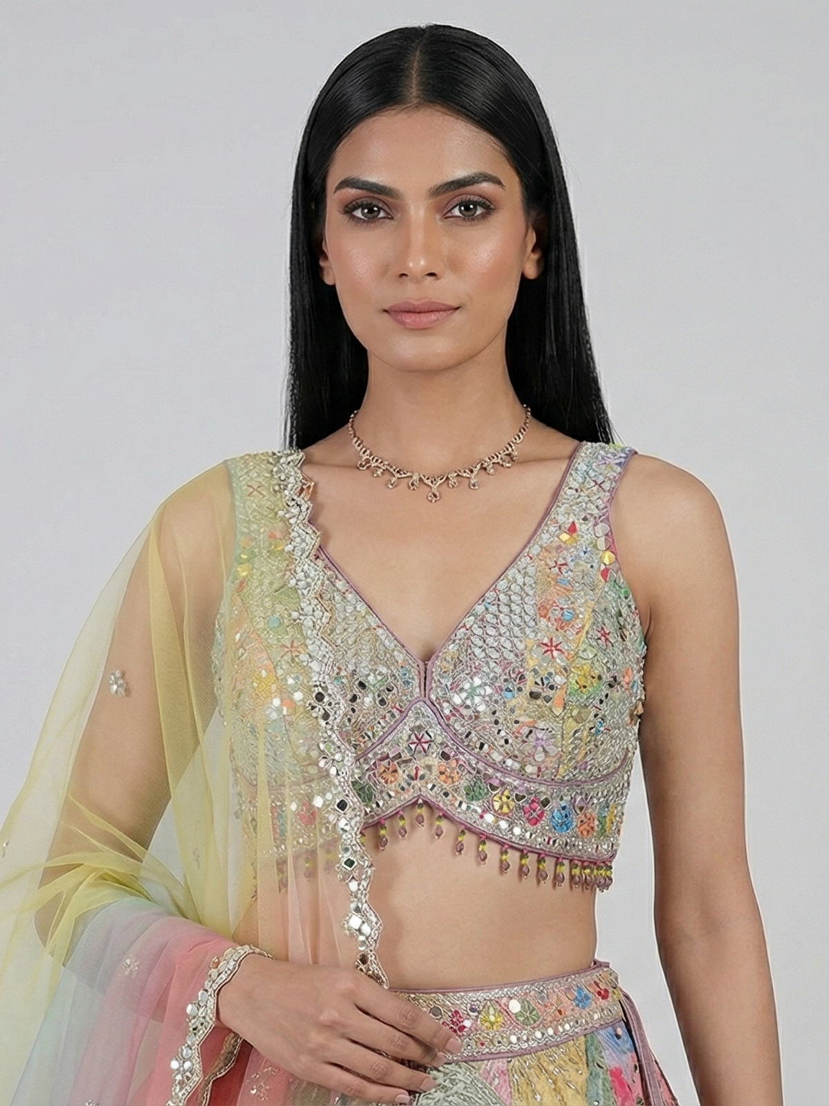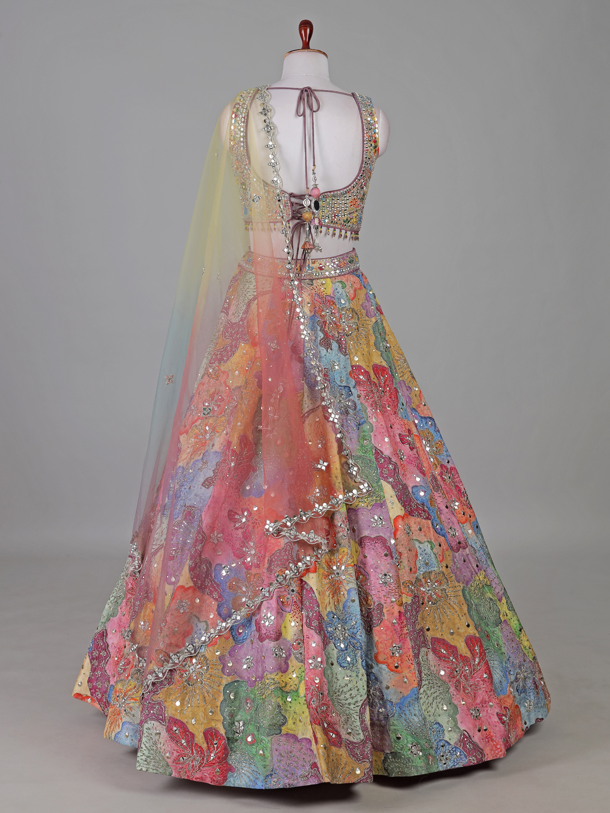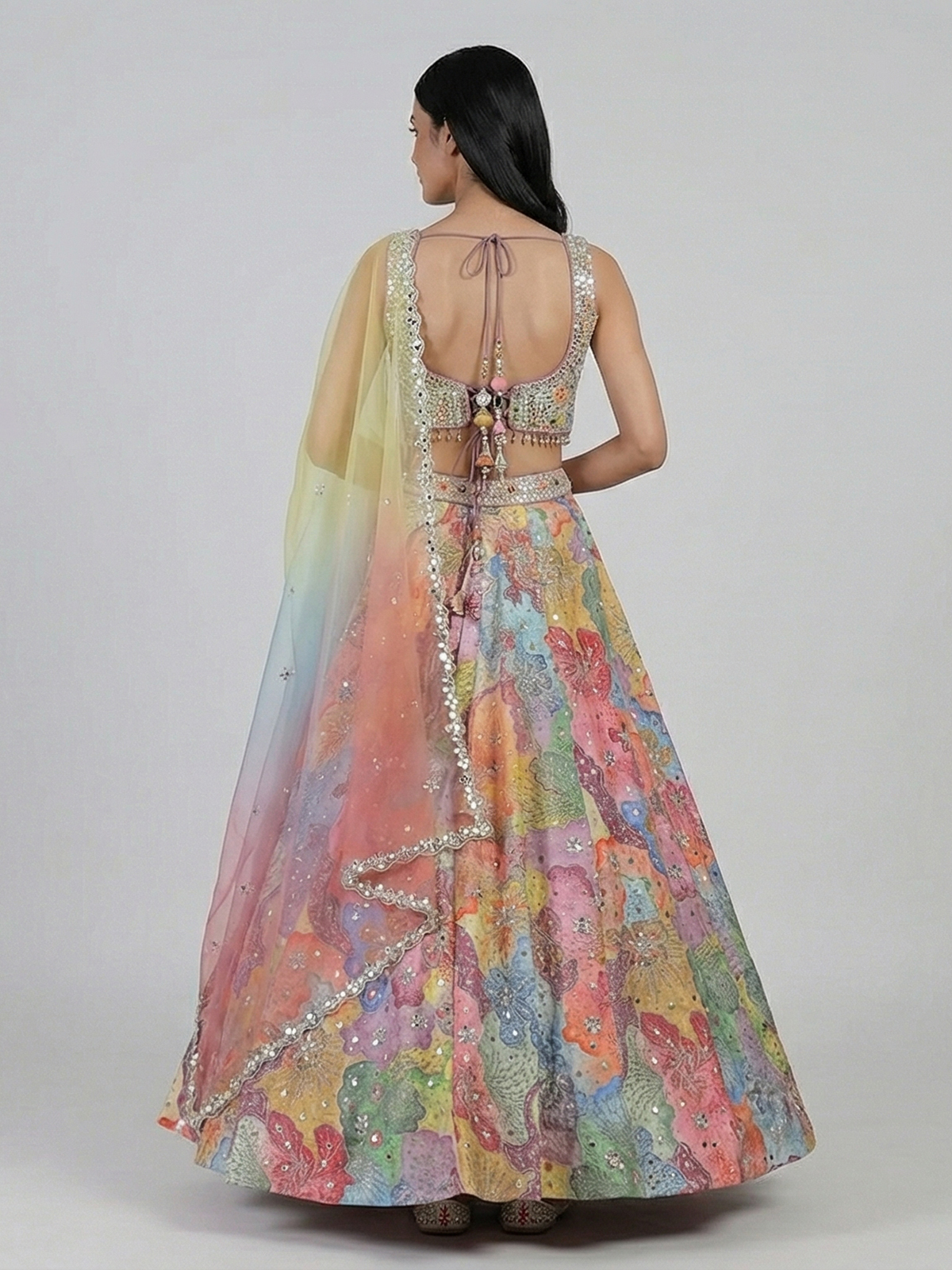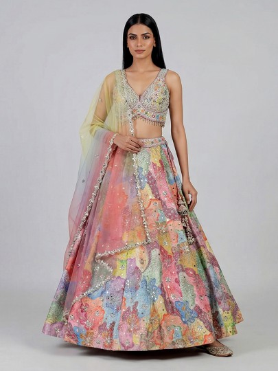 Vibrant multicolor bring artistic elegance to this silk lehenga choli. Designed for grand celebrations. Adorned with aabla, zardosi and sequin detailing. It reflects rich festive craftsmanship. The sweetheart neckline and sleeveless blouse enhance its modern appeal. Paired with a dupatta, this designer ensemble creates a lively and graceful look perfect for weddings, receptions and sangeet.