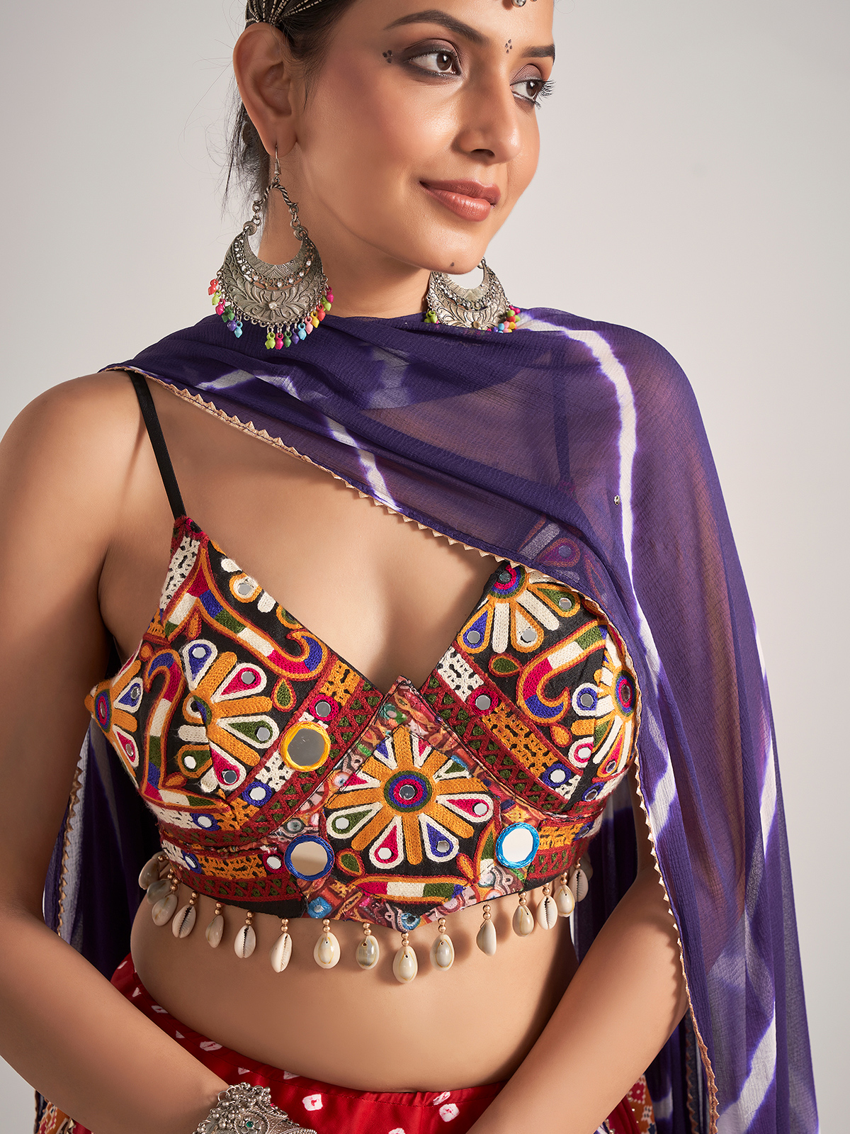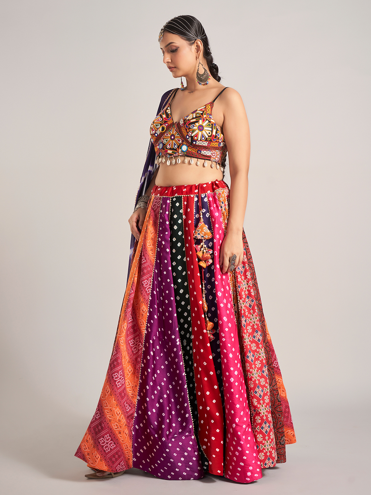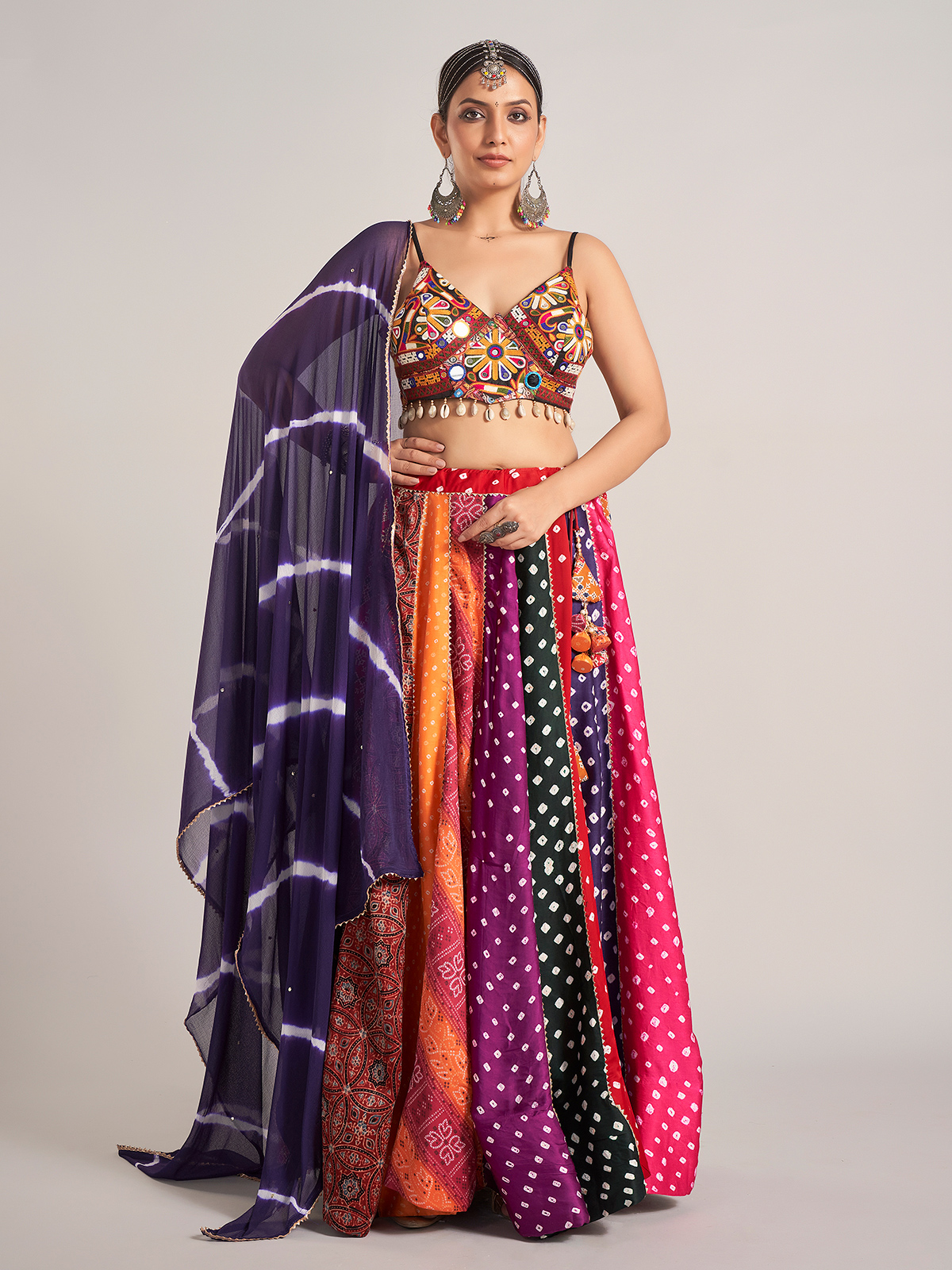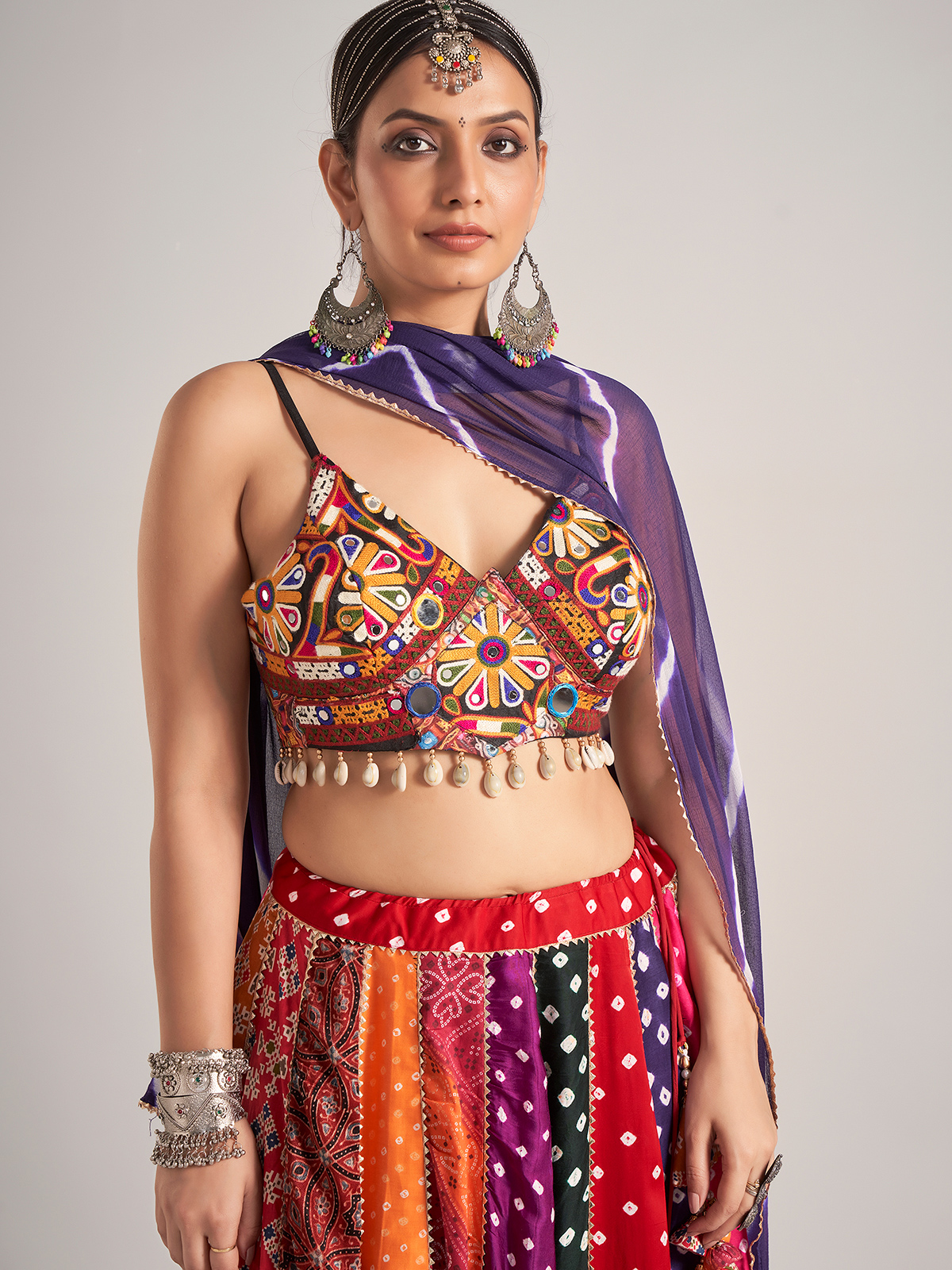 Infuse cultural charm into Navratri with this multi-color printed silk chaniya choli, decorated with mirror, thread, gota, and cowrie shell work. The sweetheart neckline, sleeveless design, and dupatta create a lively festive look.