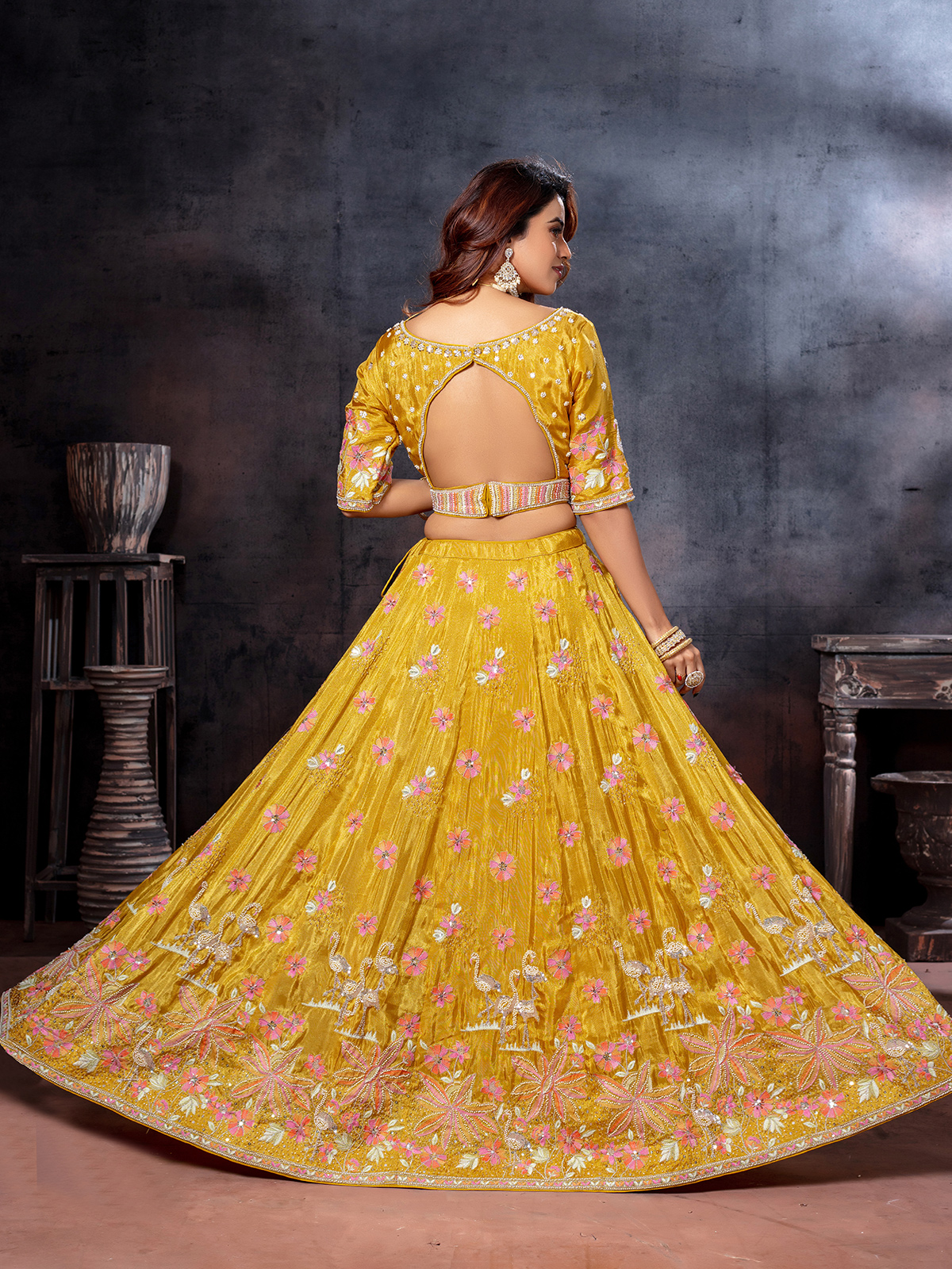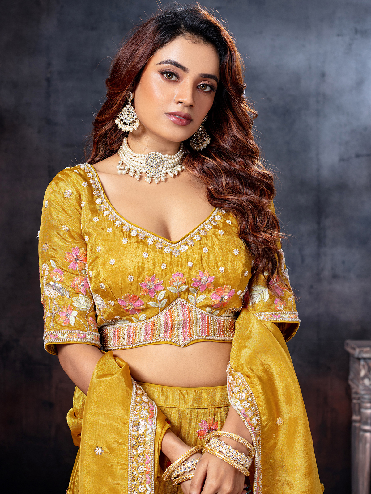 Mustard Yellow Embellished Tissue Silk Bridal Lehenga Choli