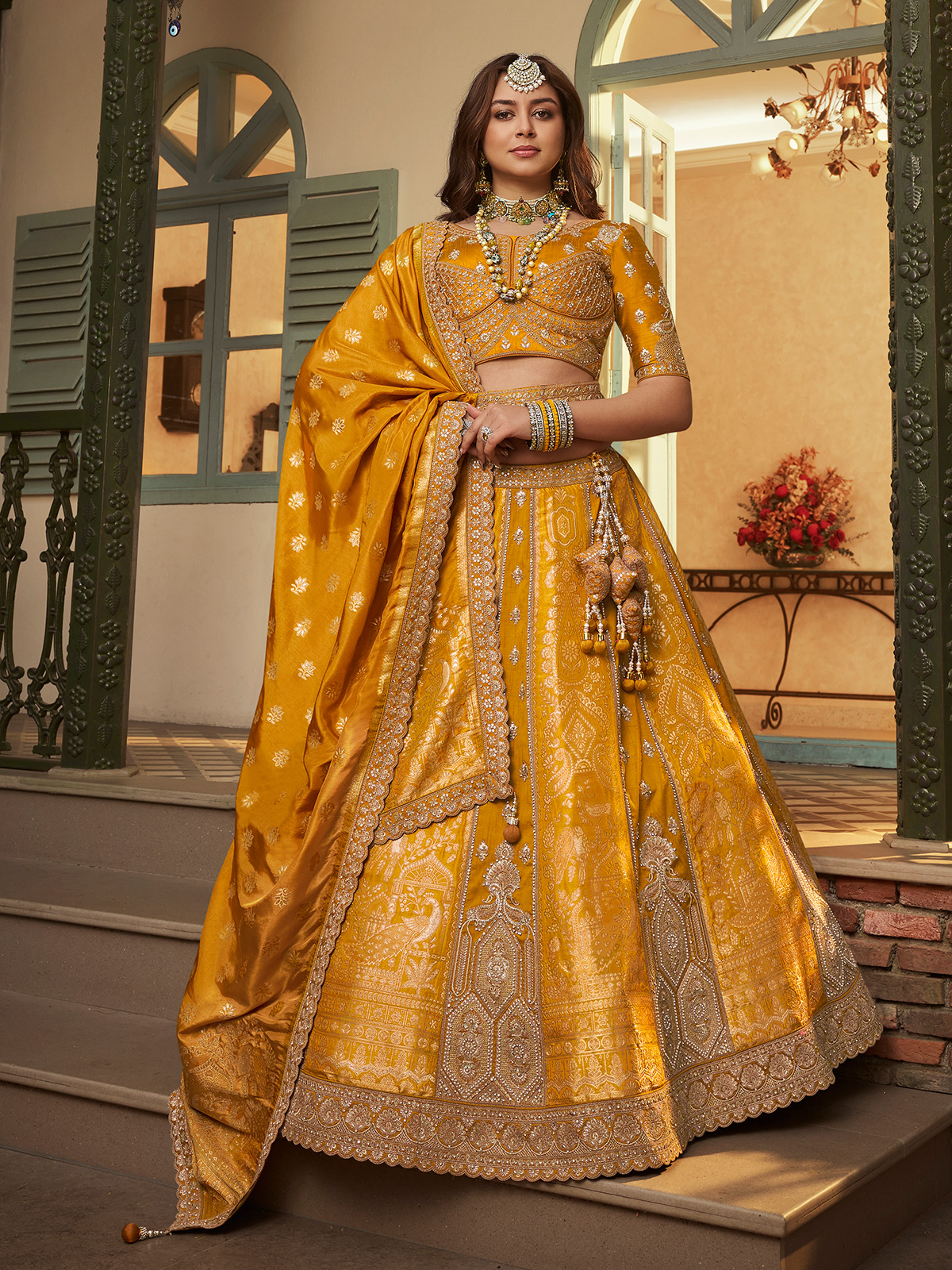Designed in premium banarasi silk, this mustard yellow outfit is adorned with embroidery, sparkling sequins, swarovski shine, elegant stone work and rich zari weaving. Includes lehenga, blouse, dupatta and belt. Provided as unstitched lehenga choli for tailored fitting. Ideal for wedding, reception, bridesmaid and haldi celebrations. Clutch not included.