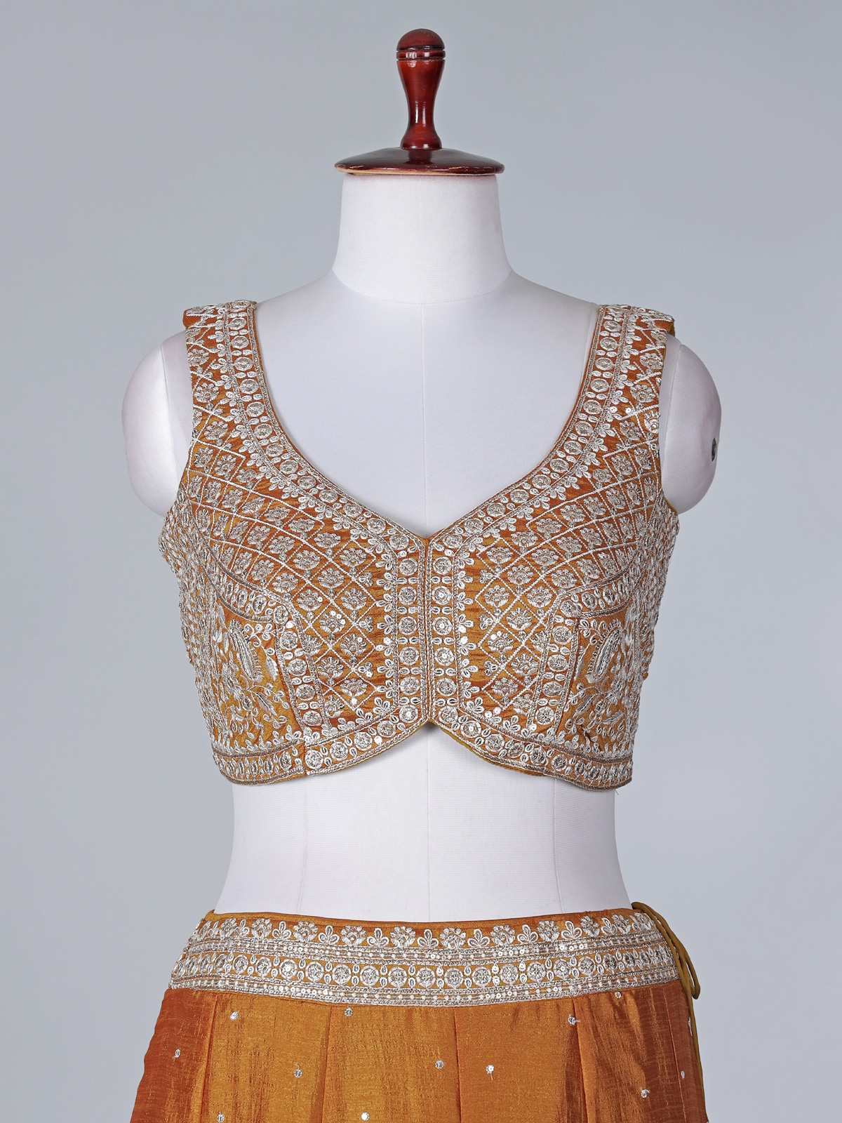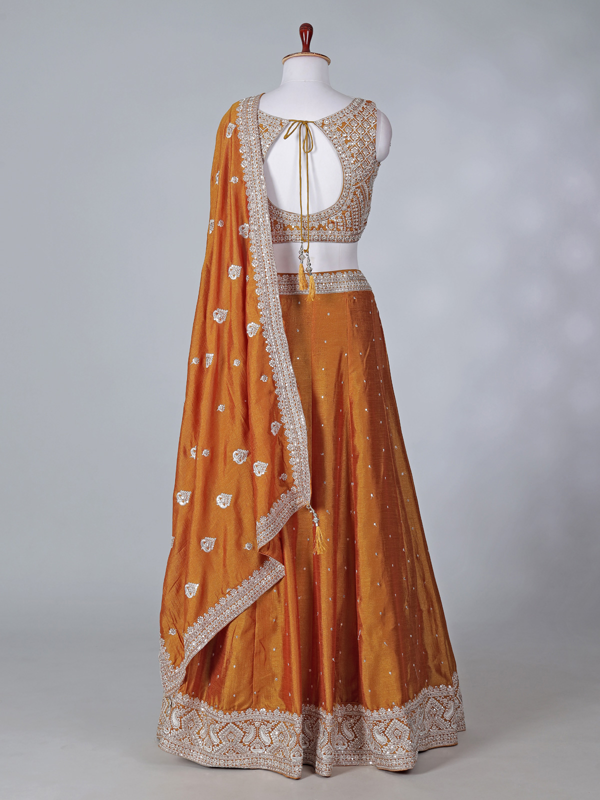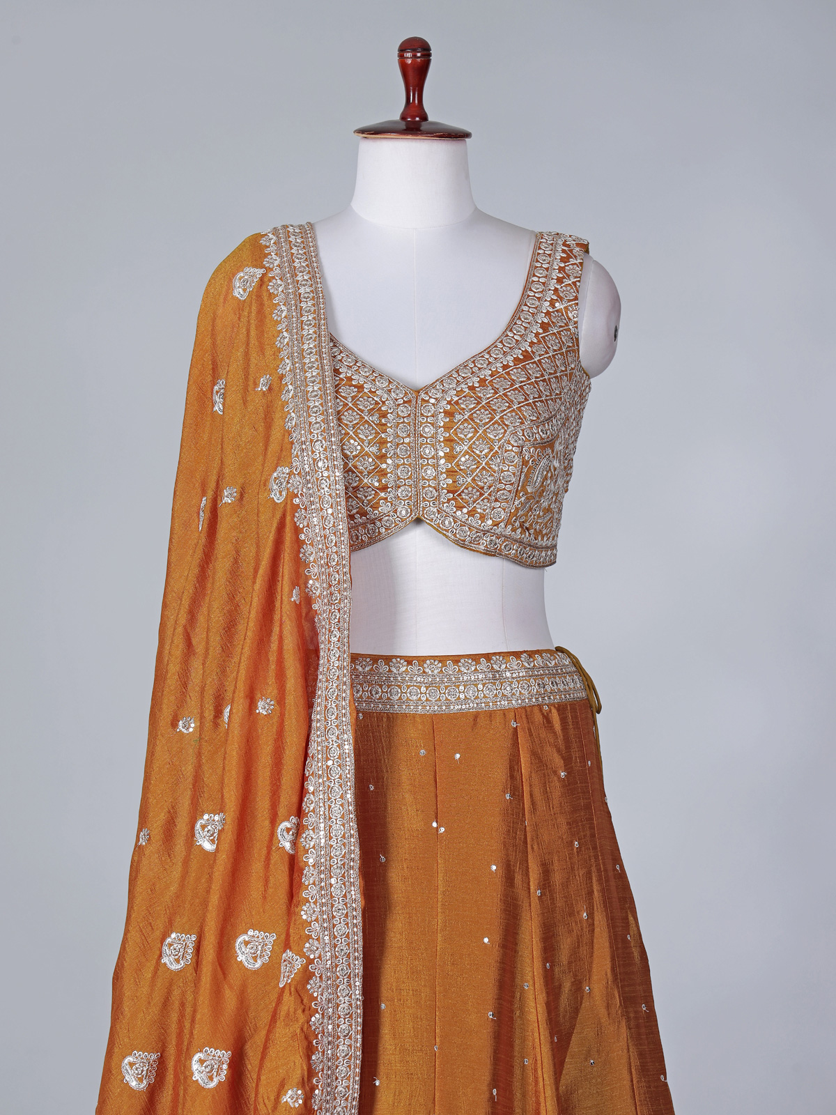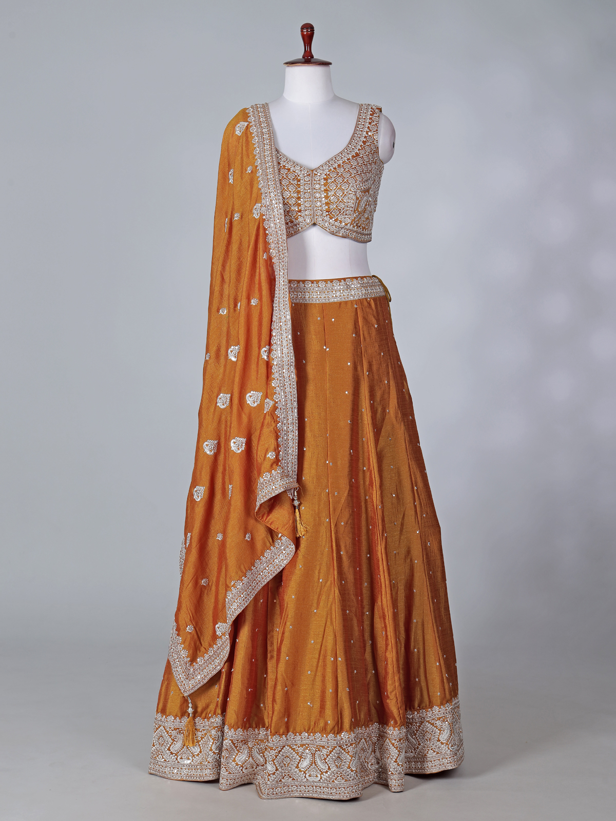 This mustard yellow silk lehenga choli is adorned with detailed embroidery, resham highlights and shimmering sequins work. Designed with a sleeveless sweetheart neck choli and paired with a coordinated dupatta, it brings cheerful elegance to weddings, receptions and lively sangeet occasions.