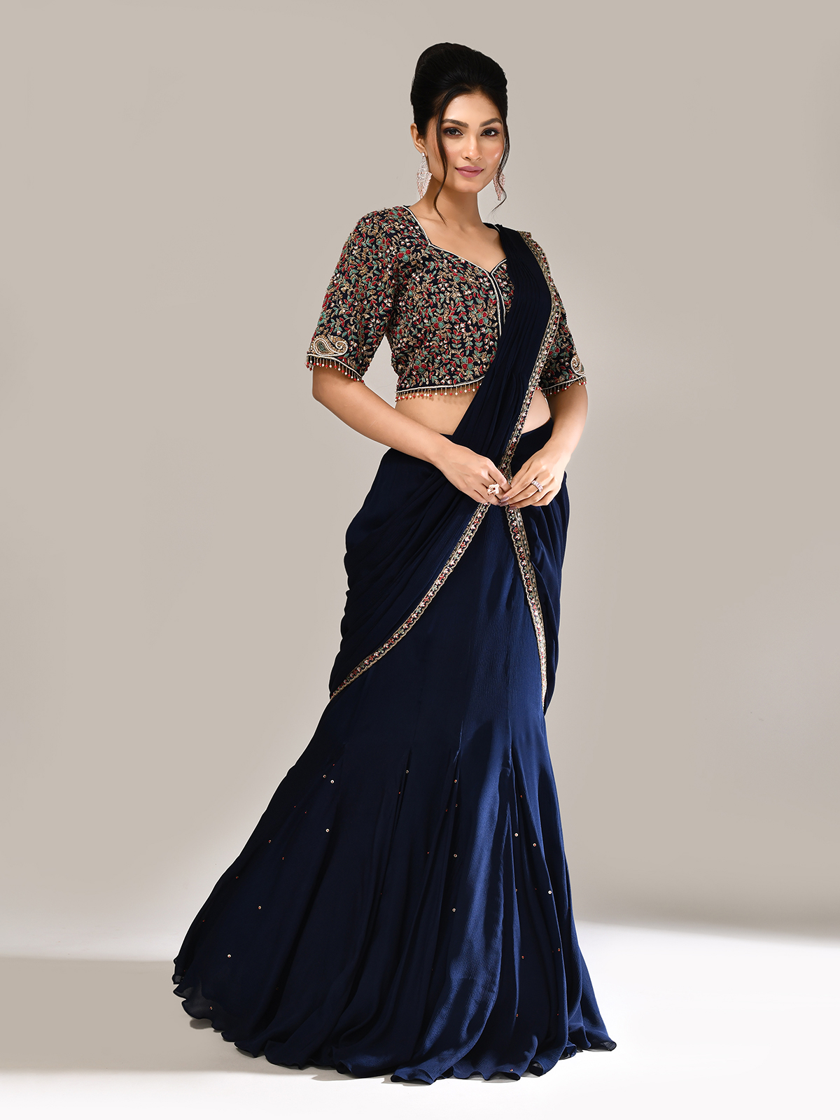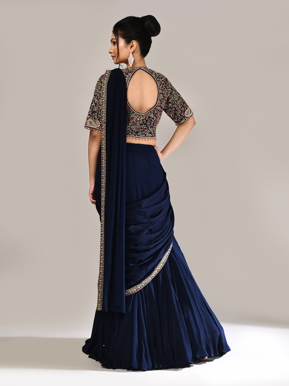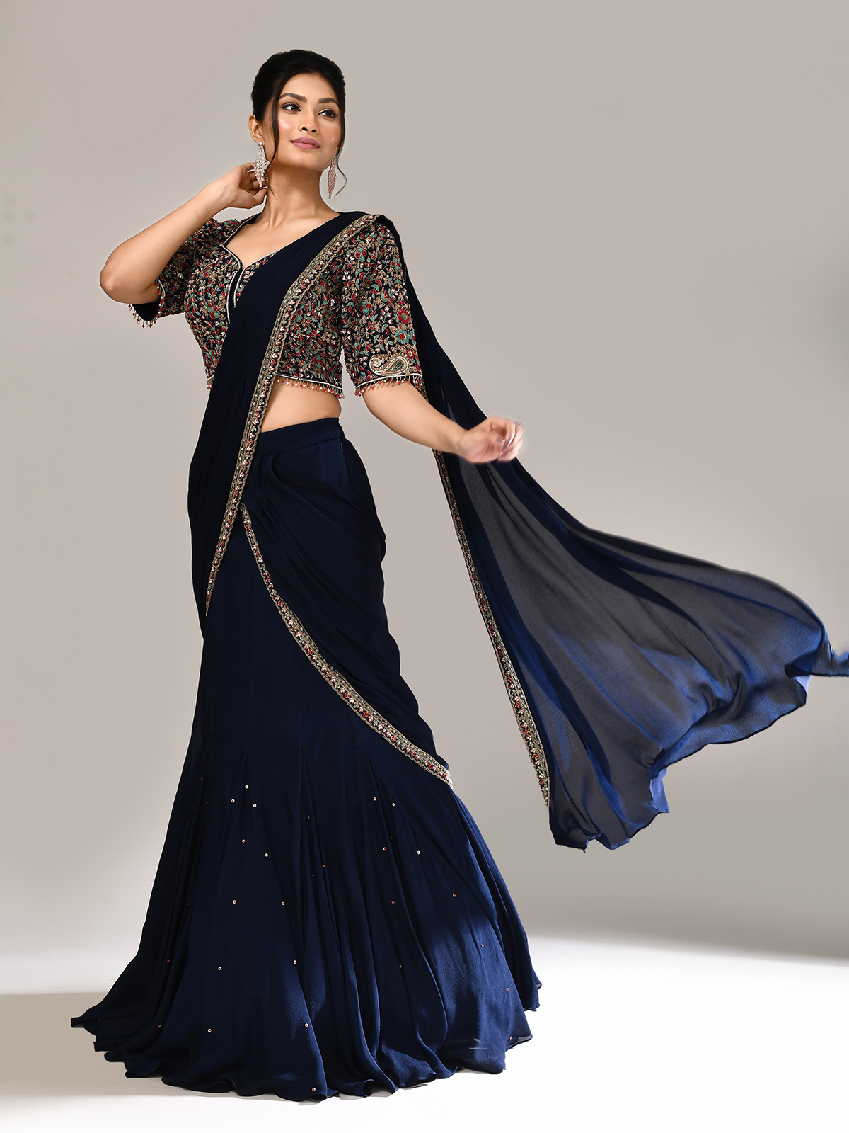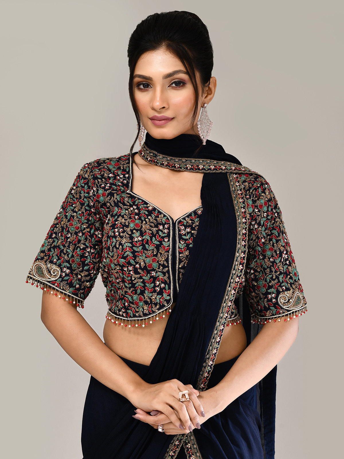 Step into grandeur with this navy chiffon lehenga choli, beautifully detailed with zardosi, resham, sequins, beads, and thread work. Styled with a sweetheart neckline, elbow sleeves, and attached dupatta, it’s a captivating choice for weddings, blending richness with subtle sophistication.