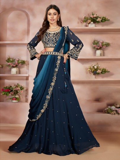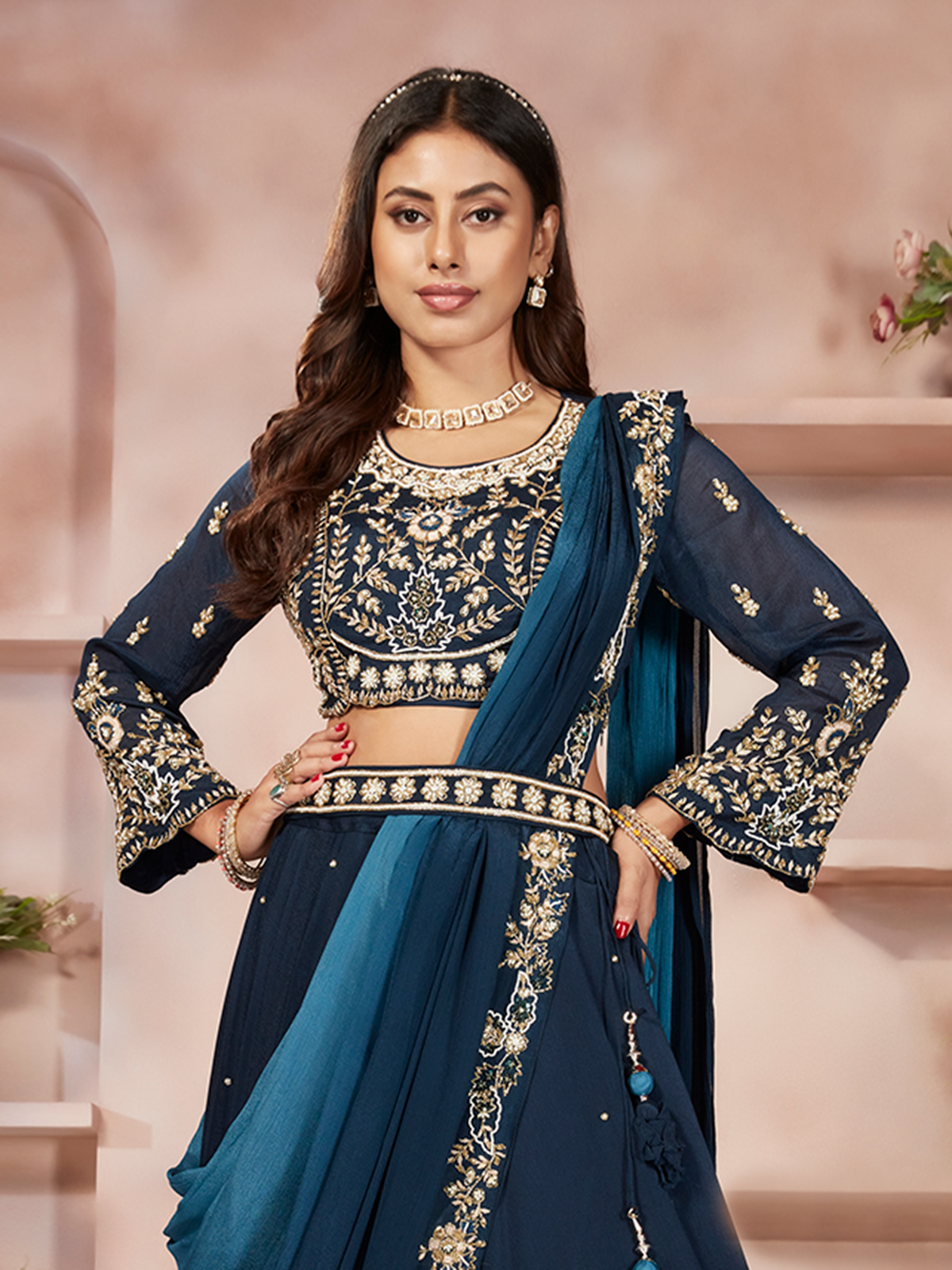 Elegance redefined in navy georgette designer lehenga choli glows with beads, resham, sequins and zardosi detailing. The round neck full sleeve blouse with attached dupatta exudes regal charm for receptions and weddings.