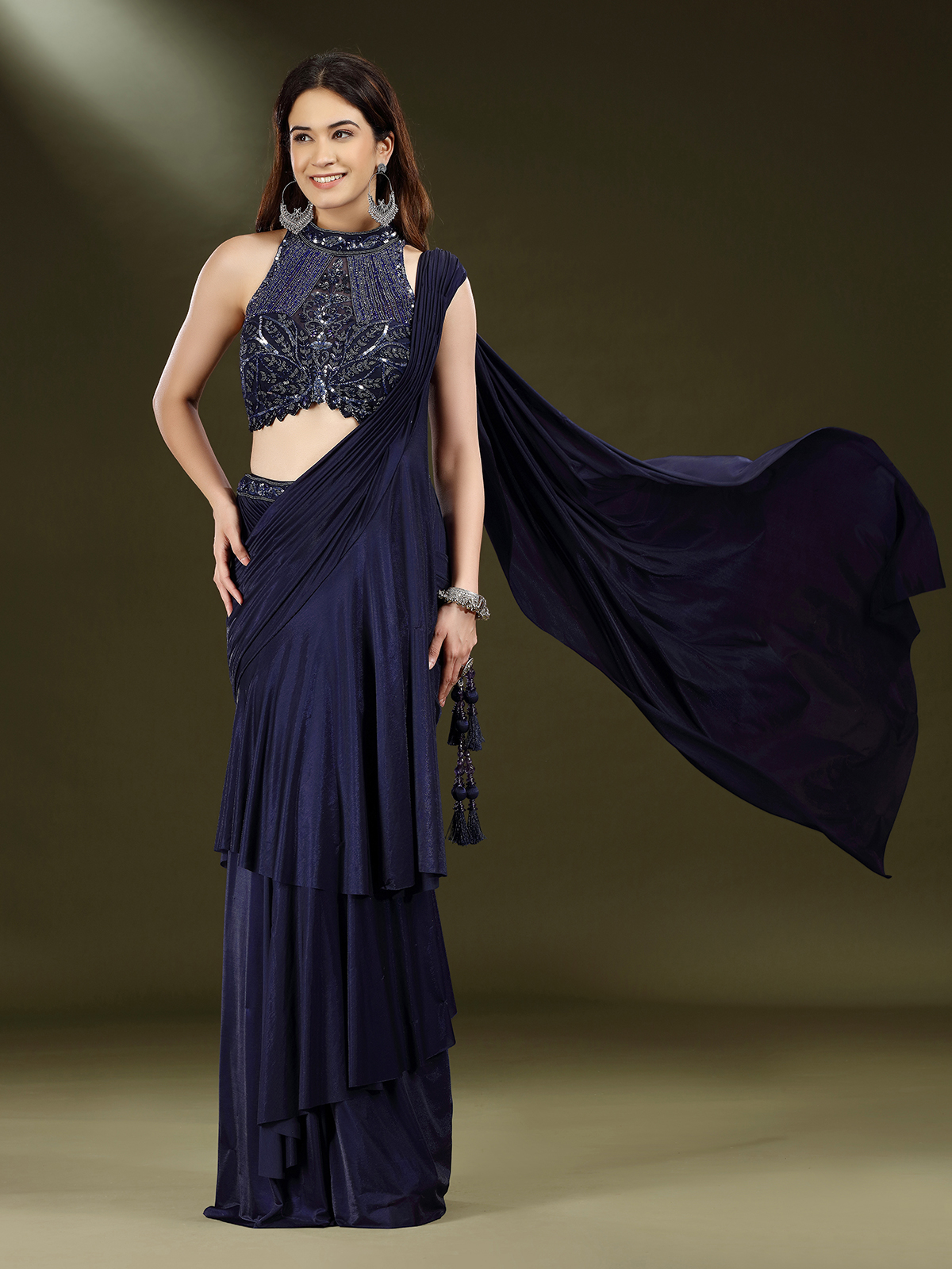 This navy lycra lehenga choli gleams with sequins, cutdana, and beads, reflecting contemporary glamour. The sleek sleeveless silhouette pairs with an attached dupatta for graceful ease. Ideal for weddings, receptions, or evening festivities, it offers refined elegance with dazzling impact.
