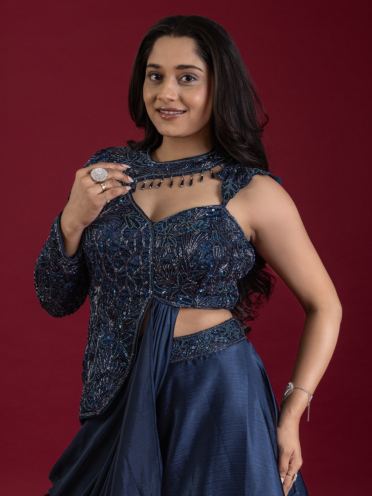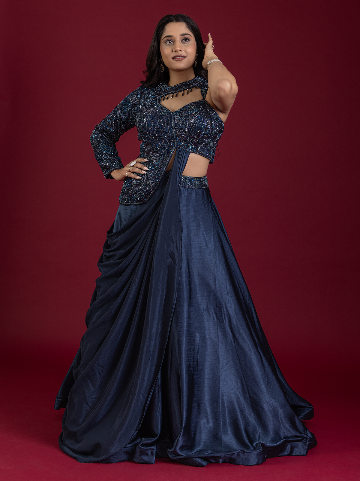 In deep navy silk, this ensemble dazzles with sequins, beads, and cutdana work, exuding a regal aura. Perfect for weddings and receptions, its embellishments sparkle like midnight stars, blending tradition with finesse. A refined choice that radiates sophistication, it promises an aura of classic grandeur with every graceful movement.