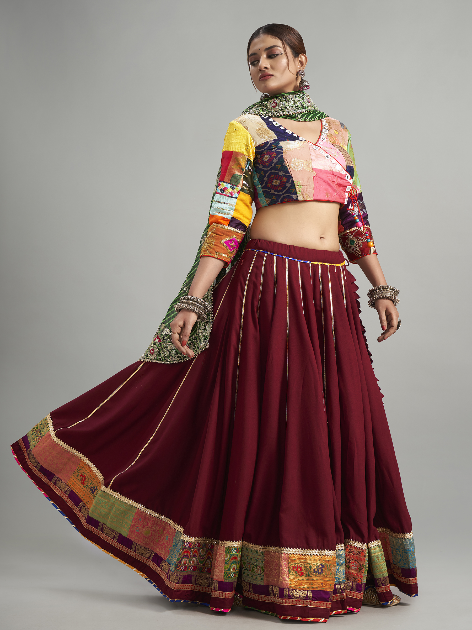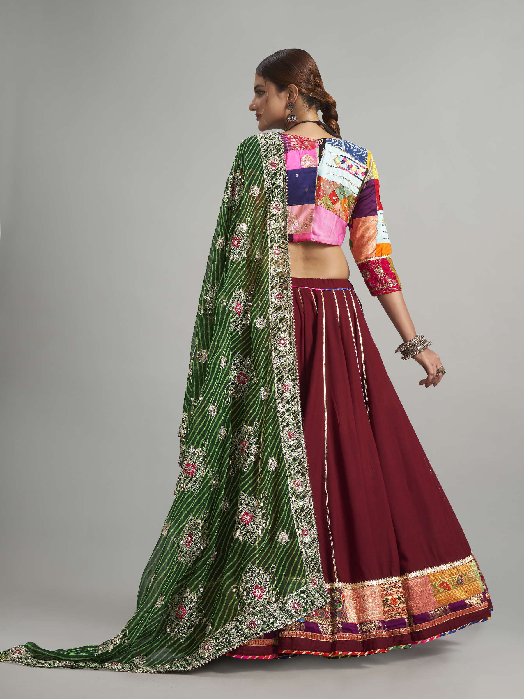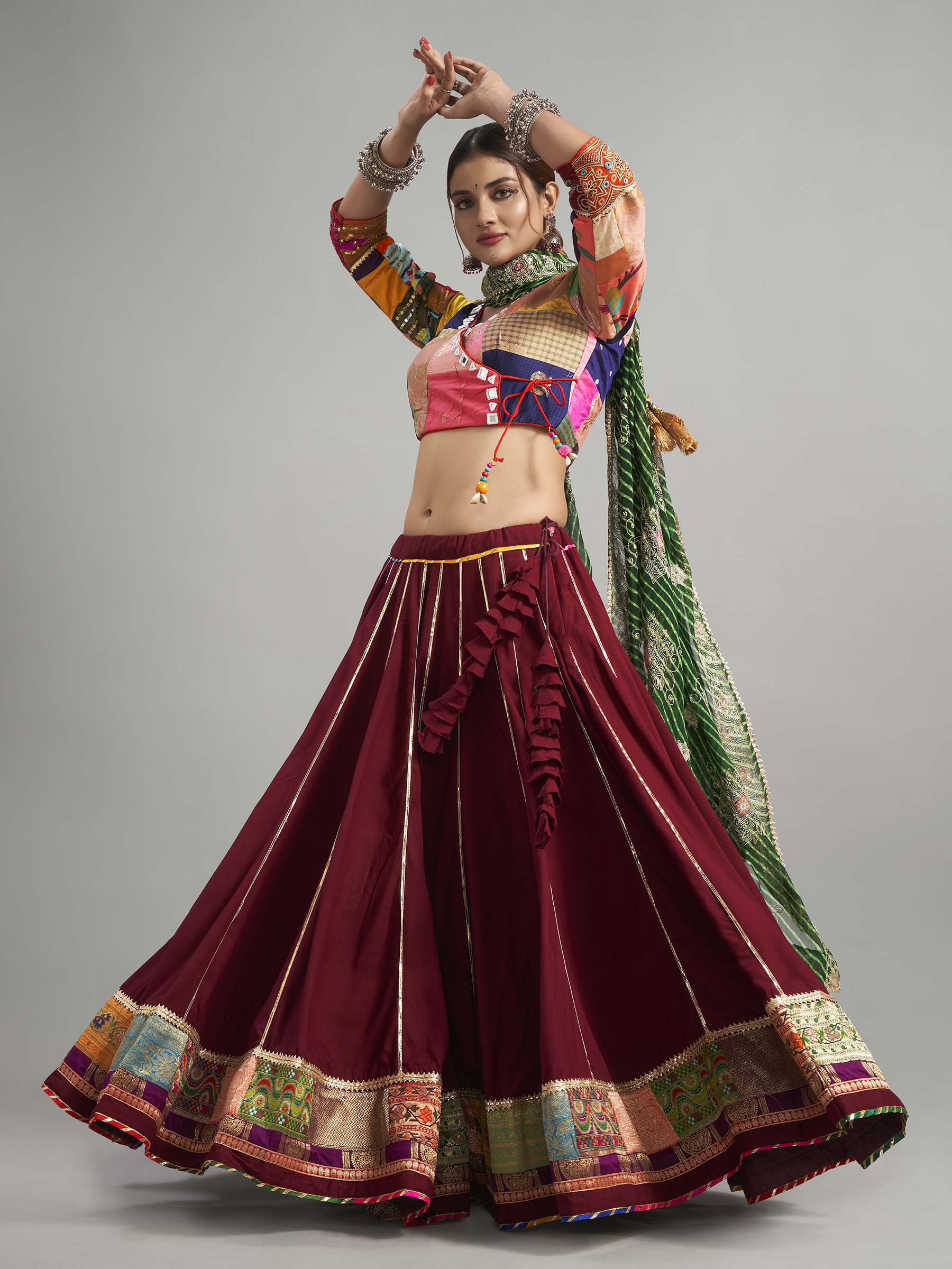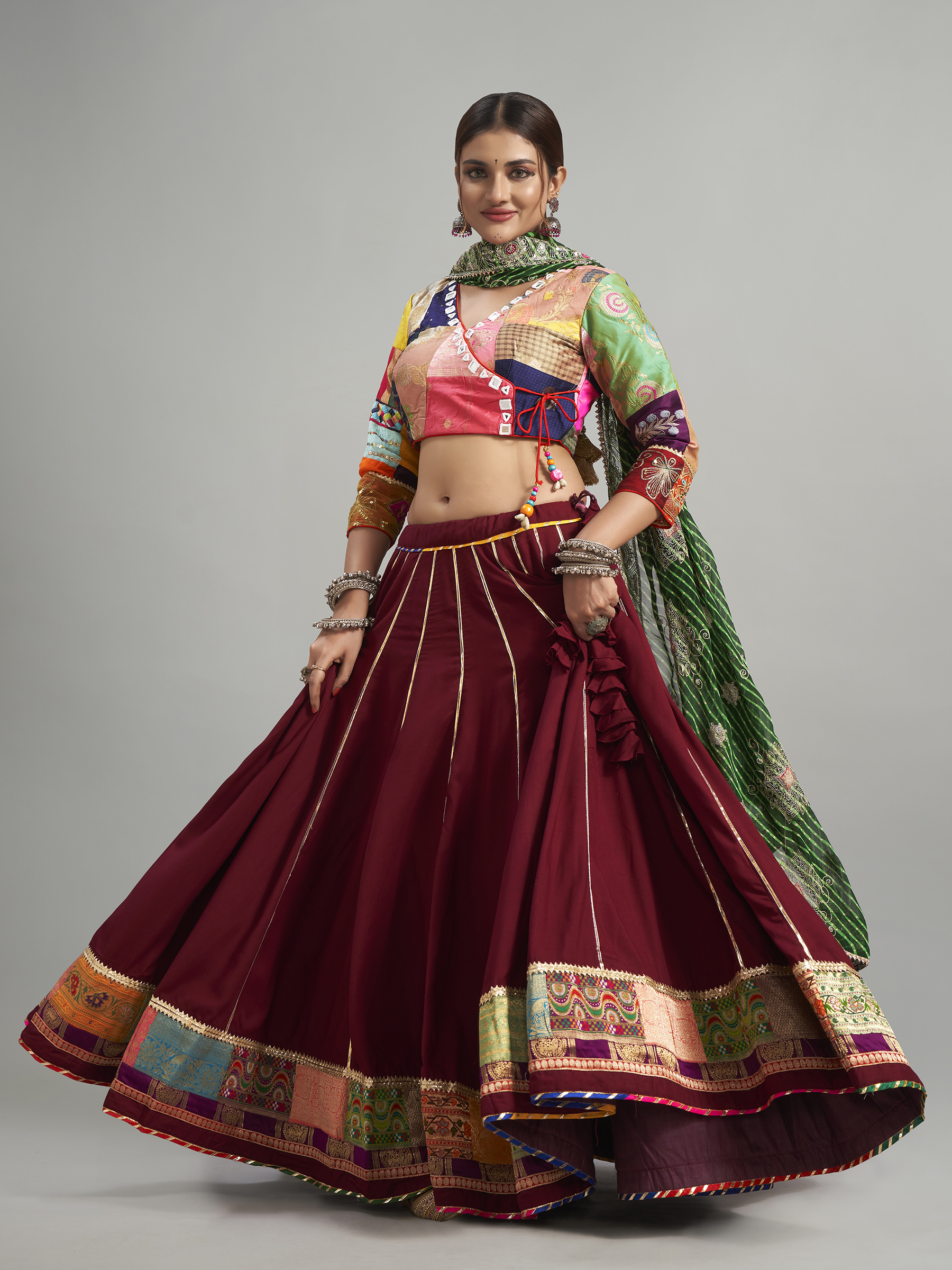 Step into the festivities in style and make a statement with this stunning brown cotton silk printed lehenga choli. Enhanced with sequins, mirror, gota, and resham work, the choli has a V-neck and quarter sleeves. Comes with a dupatta. Note that the print and work may slightly vary from the image.