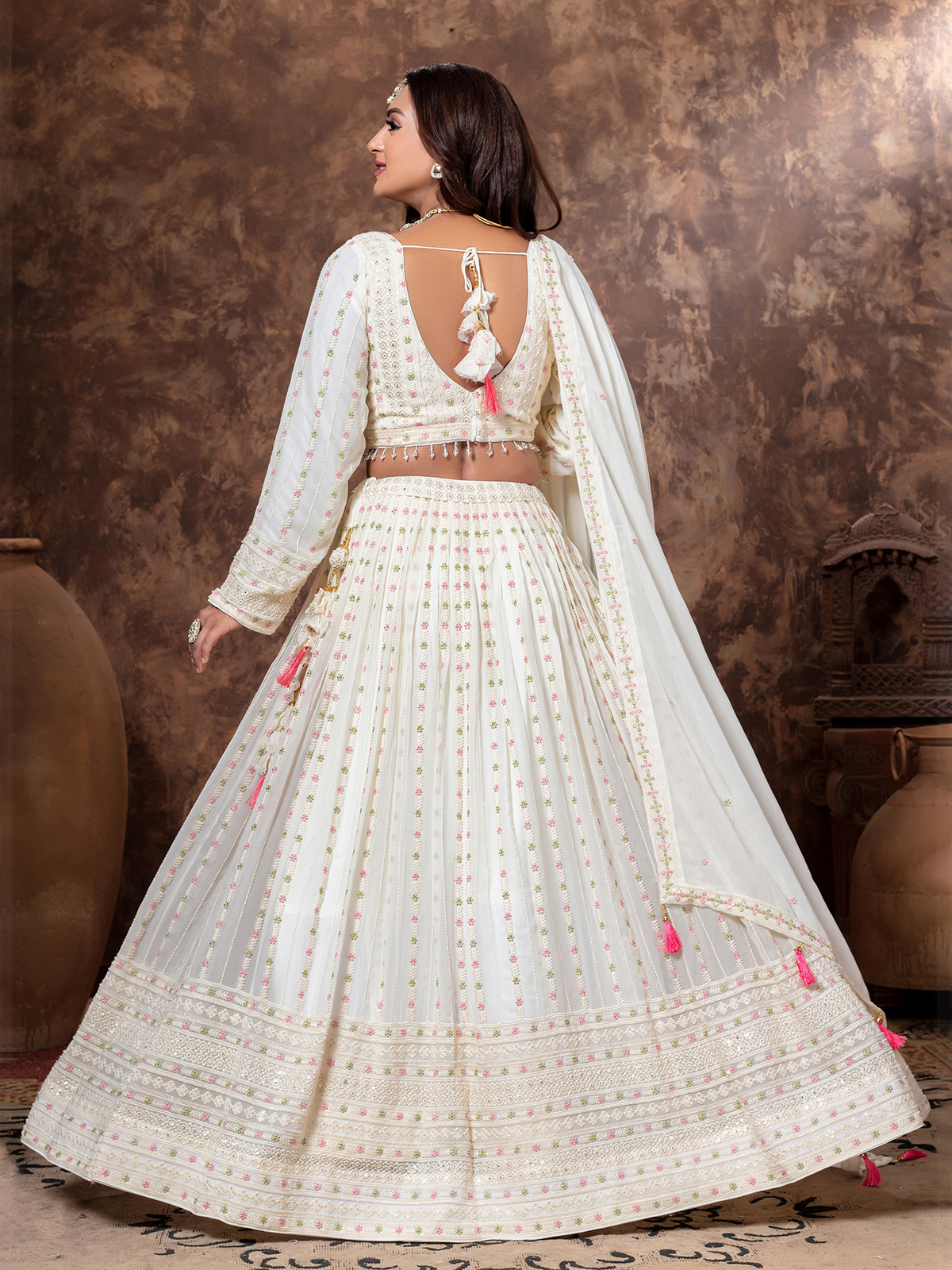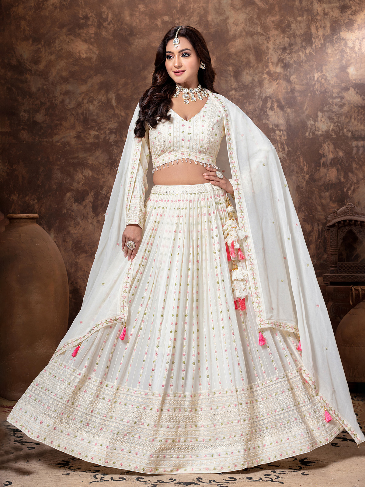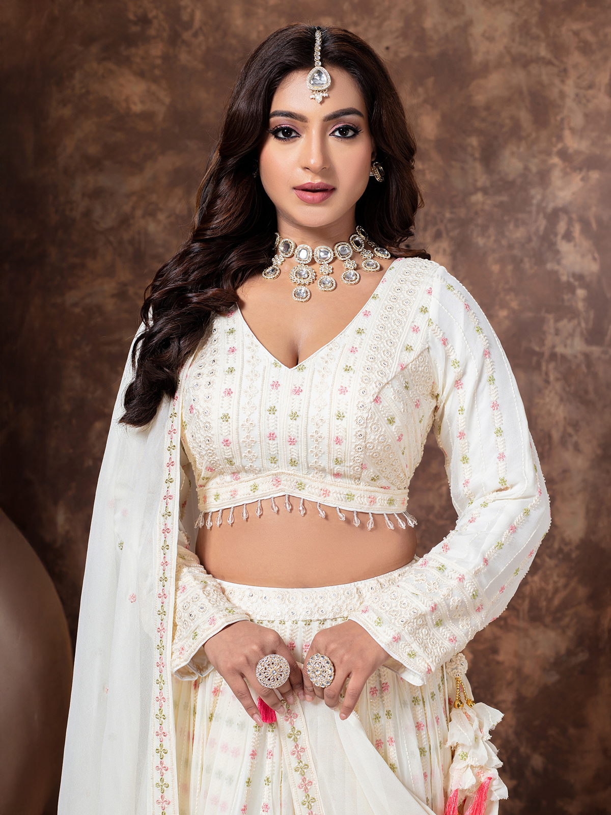 Grace every occasion in this off-white georgette lehenga choli, embellished with sequins, resham, and beads. The V-neckline with full sleeves adds refined charm, while the delicate detailing glimmers with timeless elegance. Designed for weddings, this ensemble captures subtle sophistication and festive grandeur, making it an enchanting choice for brides and bridesmaids alike.