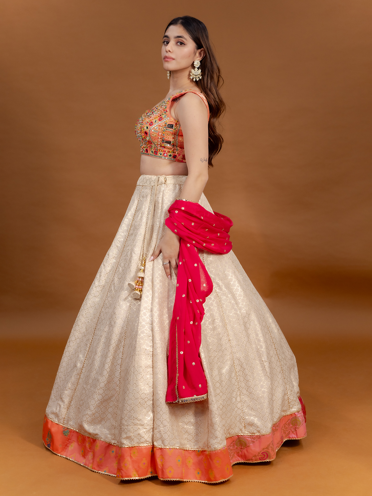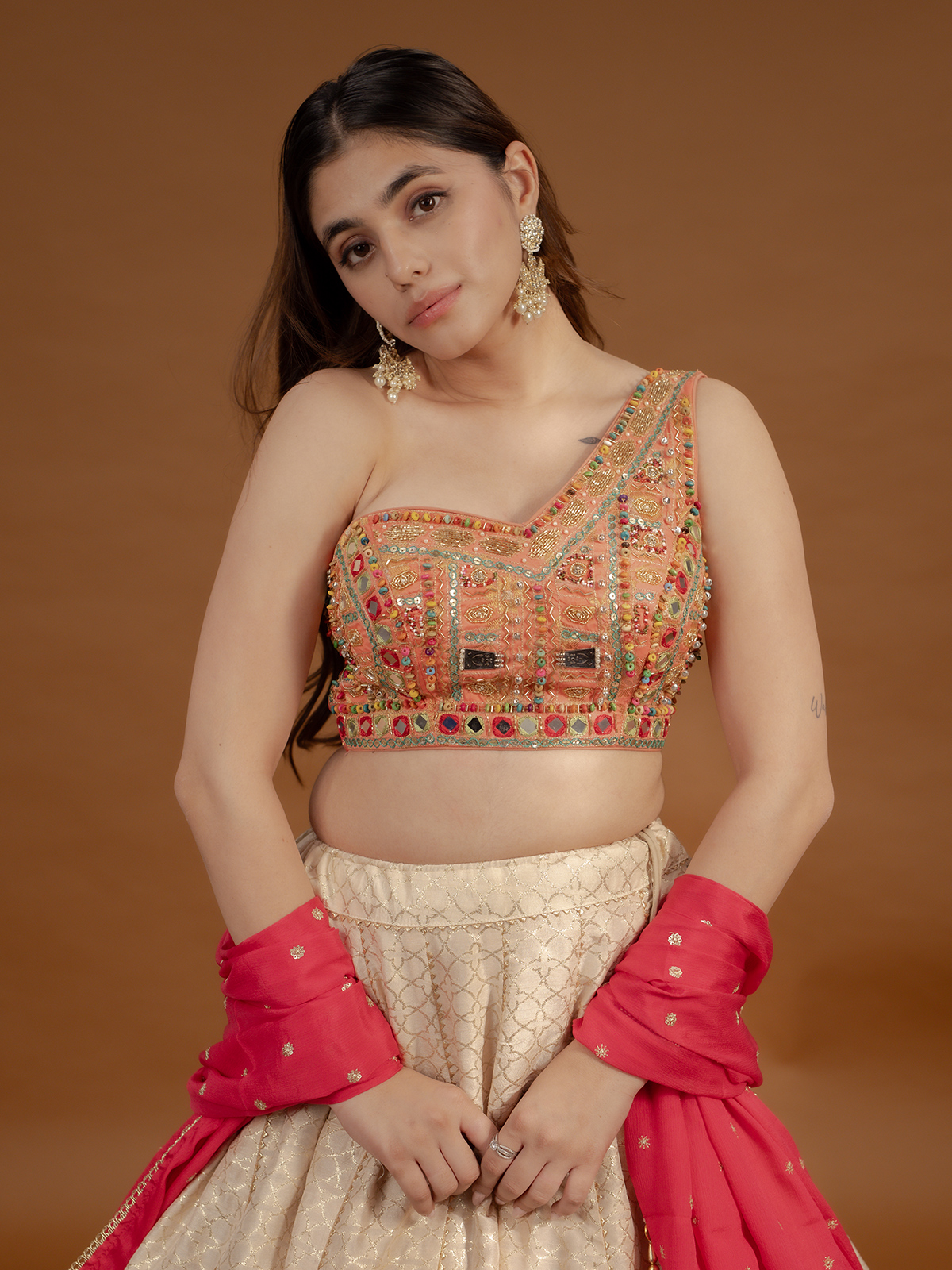 An off white silk canvas comes alive with zardosi, mirror, sequins, zari, thread, gota, pearls and bead artistry. Select variations showcase block prints and patchwork accents, adding heritage depth. The dramatic one shoulder silhouette, paired with a flowing dupatta, creates a regal statement for sangeet evenings and navratri celebrations.
