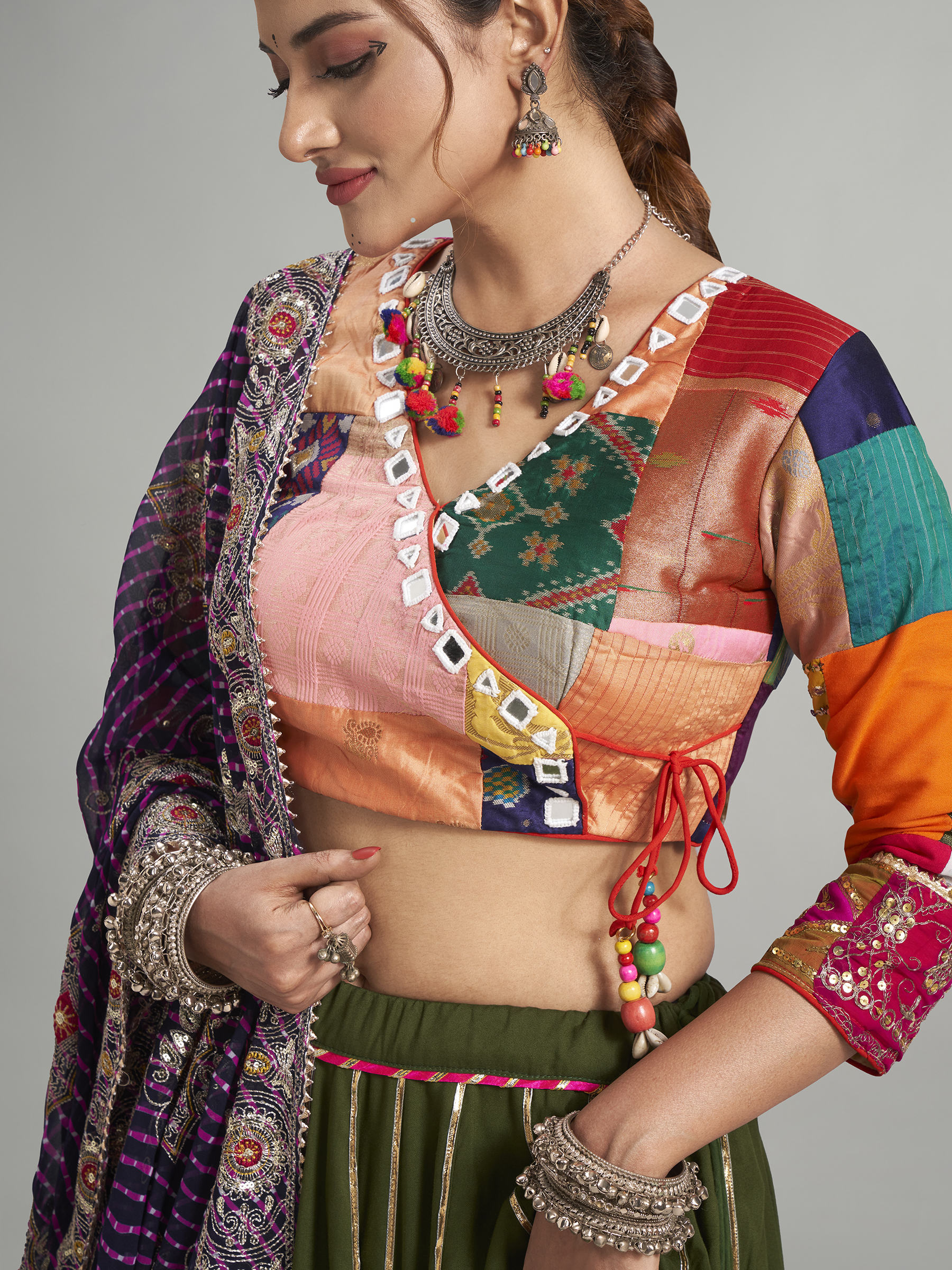 Elevate your Navratri celebrations with our olive cotton silk chaniya choli. Adorned with sequins, mirror, gota, and resham work, this ensemble exudes elegance and charm. The choli features a V-neck and quarter sleeves and comes with a contrasting printed dupatta. Note that the print and work may slightly vary from the image.