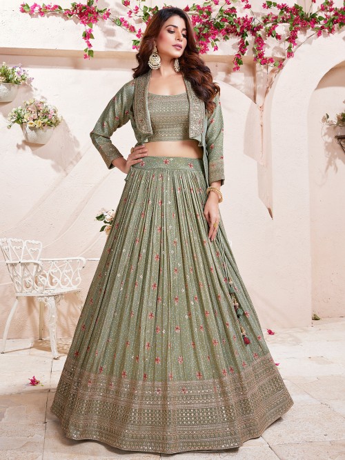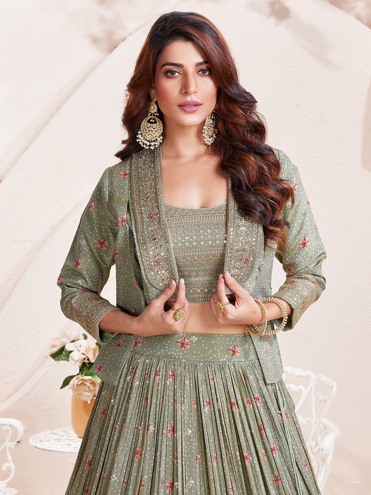 Olive Printed Silk Lehenga Choli With Jacket For Women