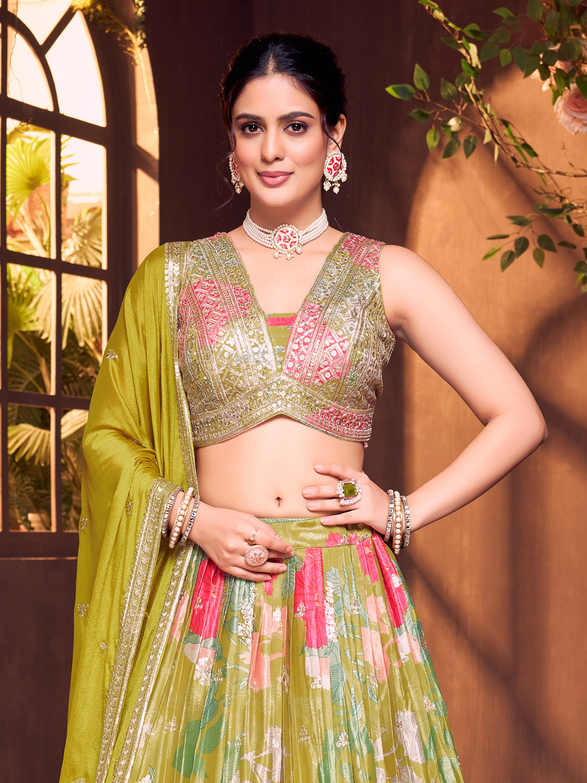 Olive Silk Printed V Neck Festive Lehenga Choli