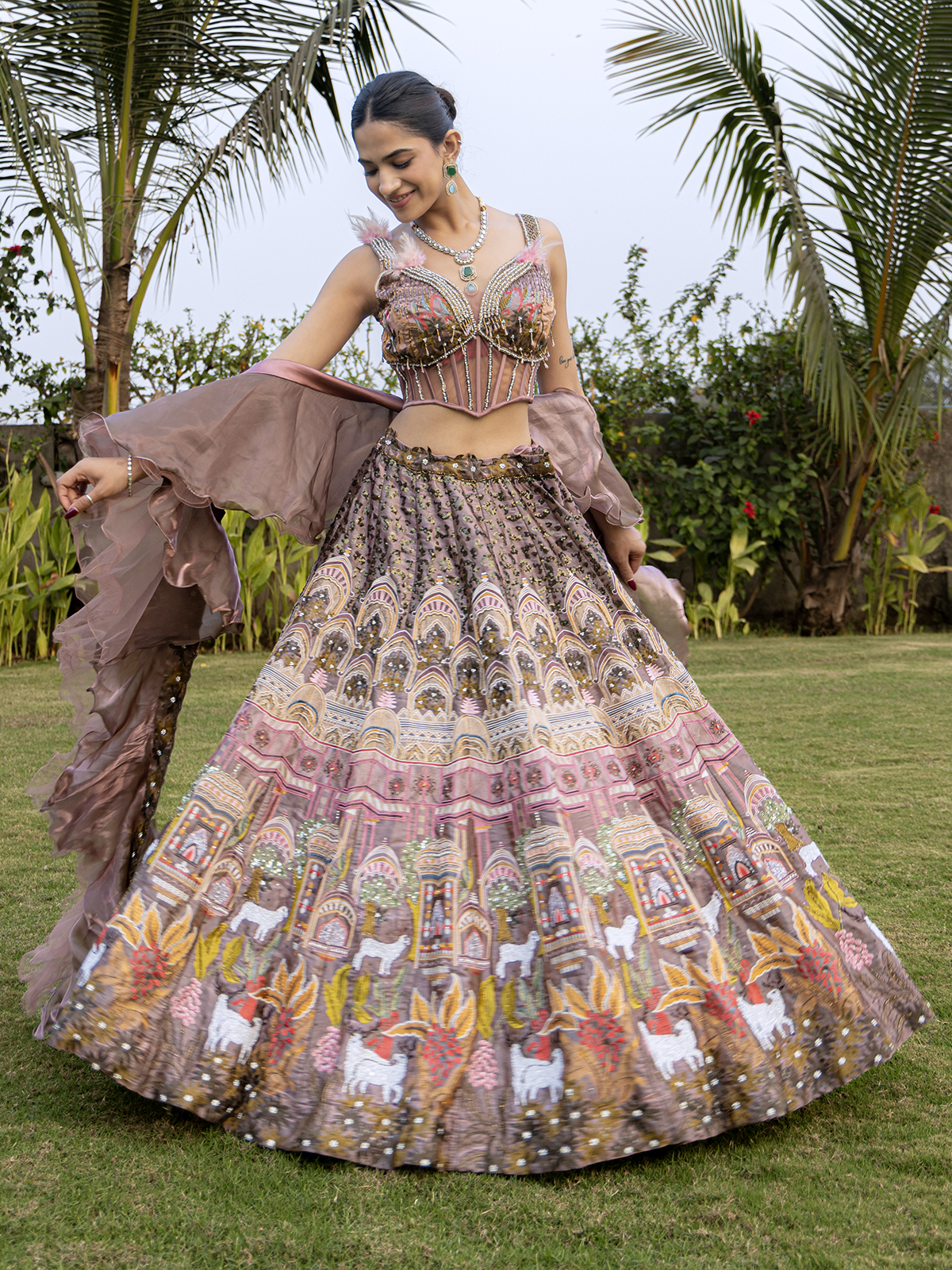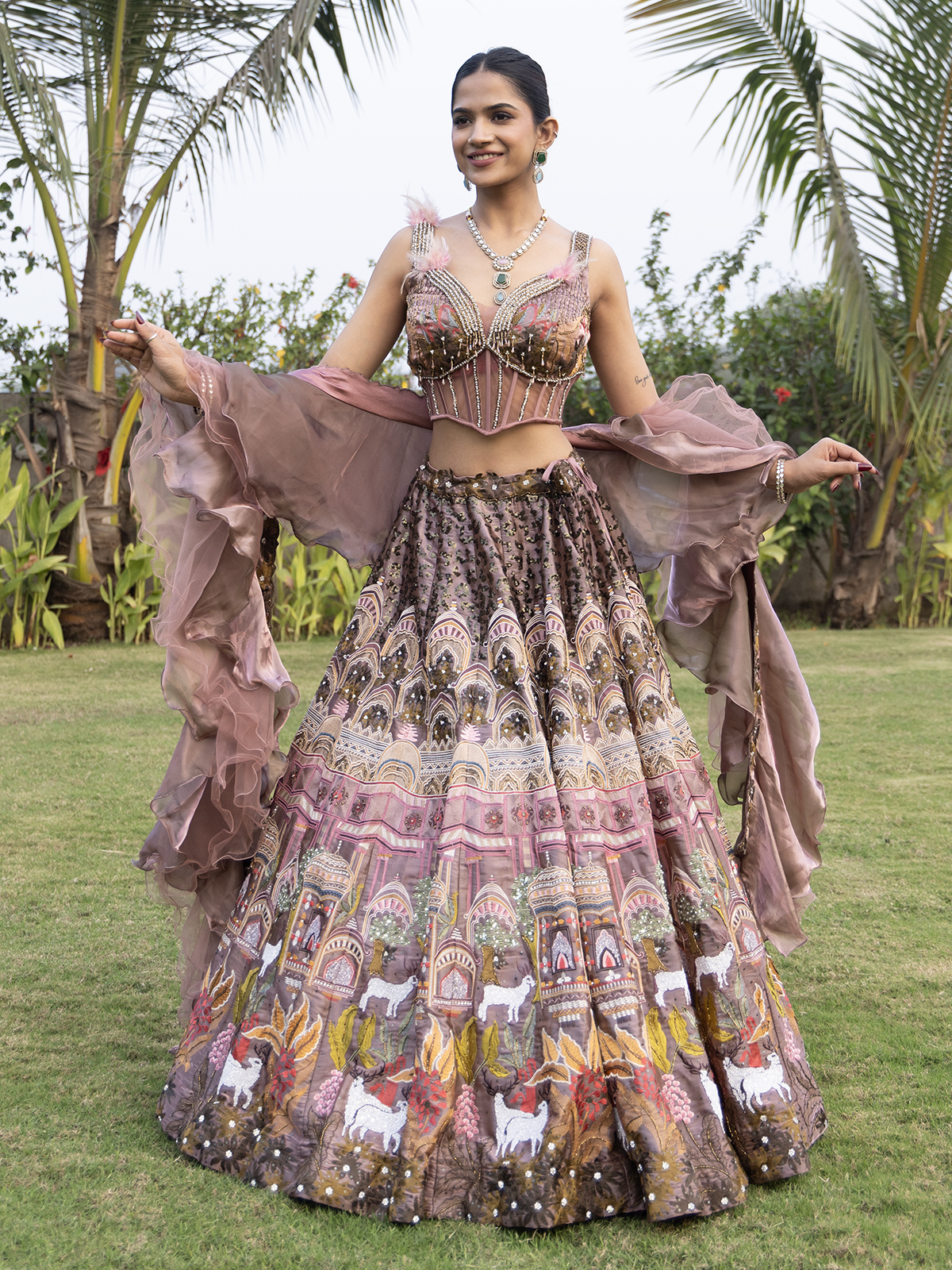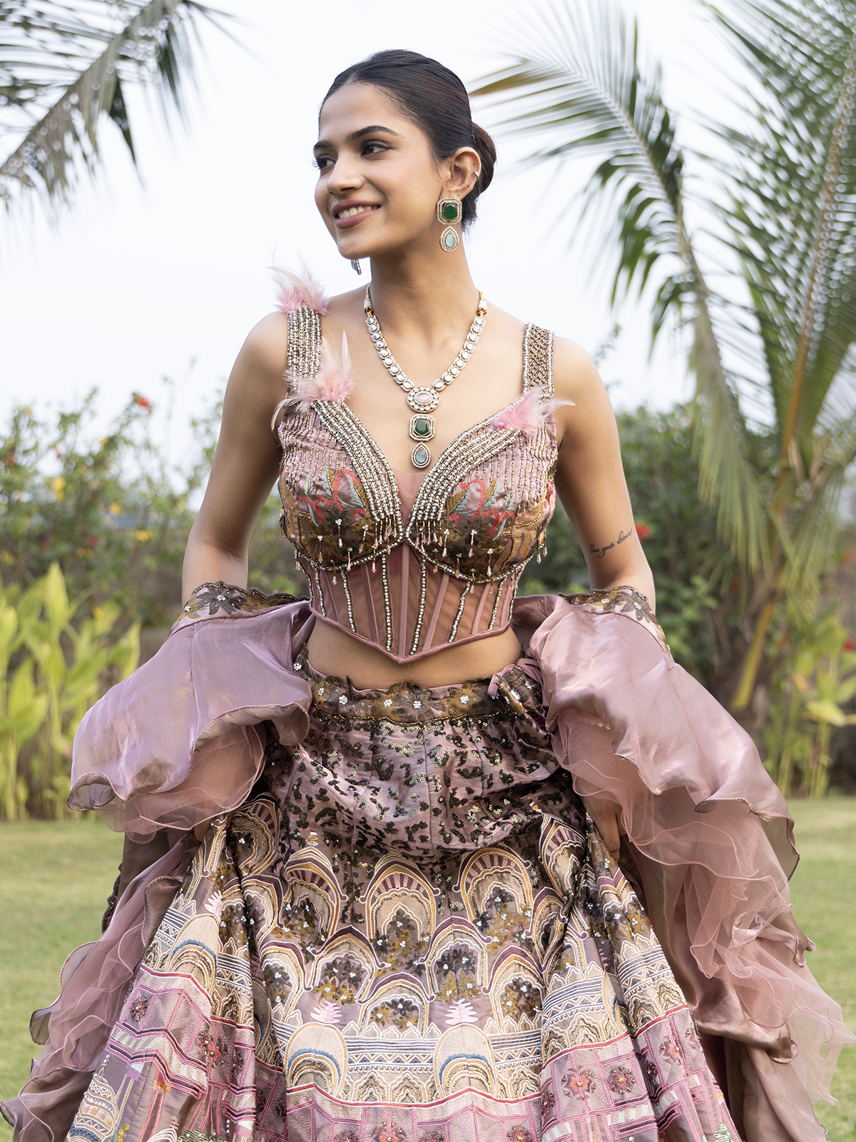 Make a glamorous statement in this onion pink silk designer lehenga choli crafted for wedding festivities. Featuring a sweetheart neckline and sleeveless style, it is delicately enhanced for a refined appeal. The stylish ruffle dupatta adds a contemporary twist, making it ideal for sangeet and reception occasions.