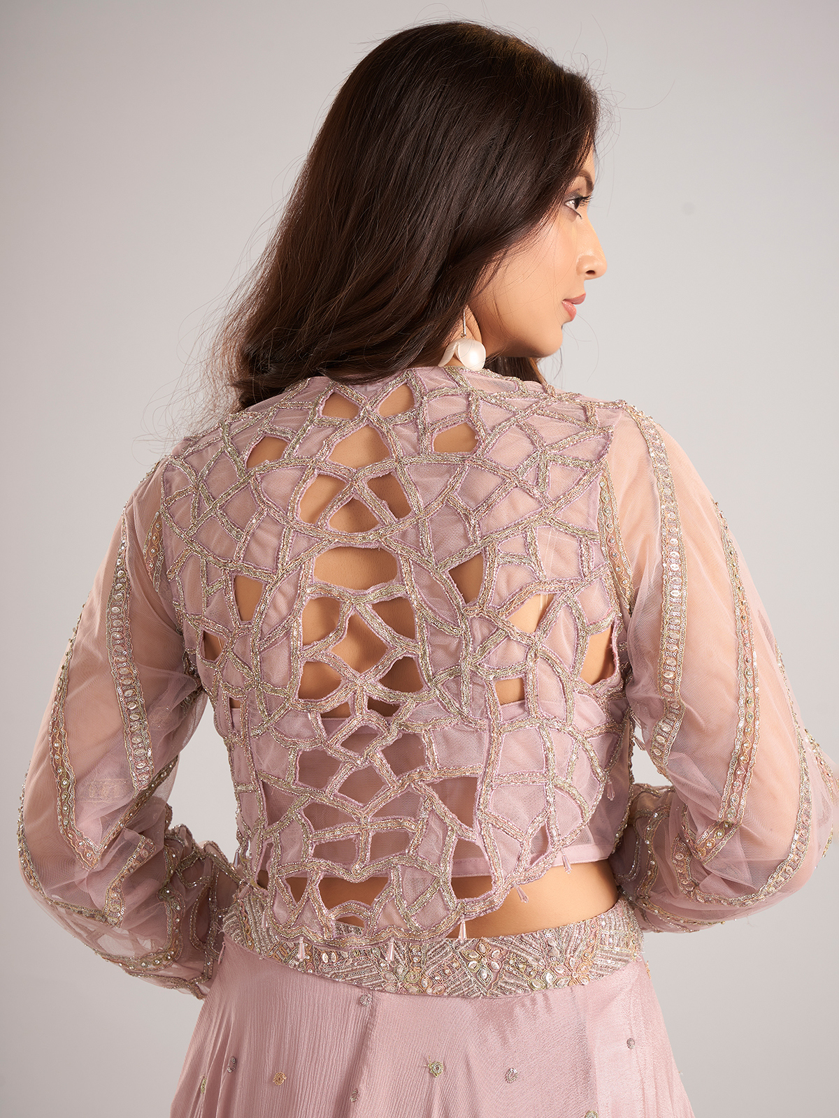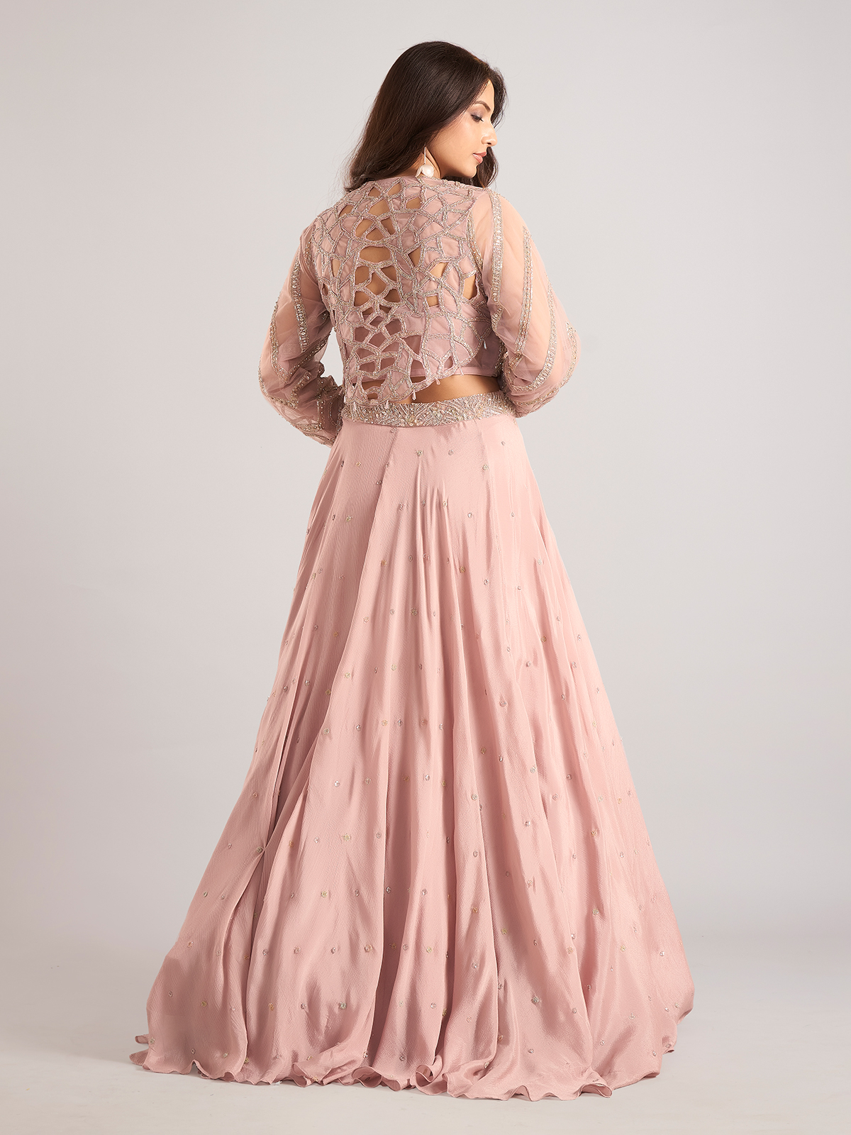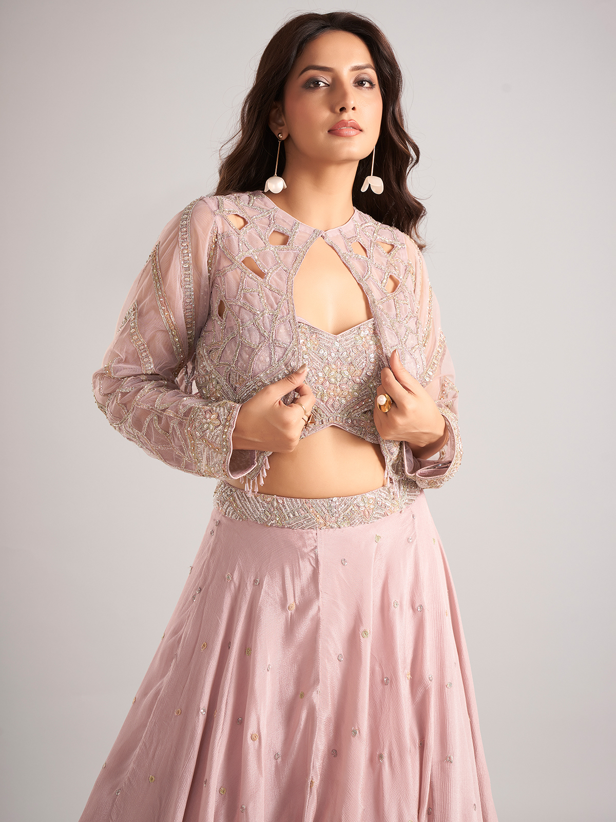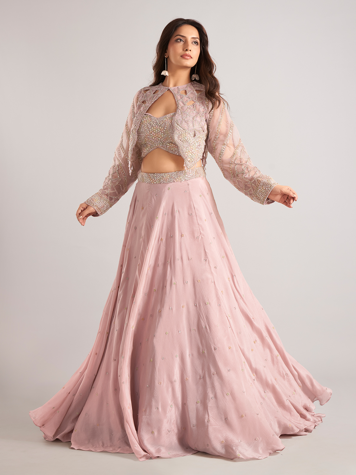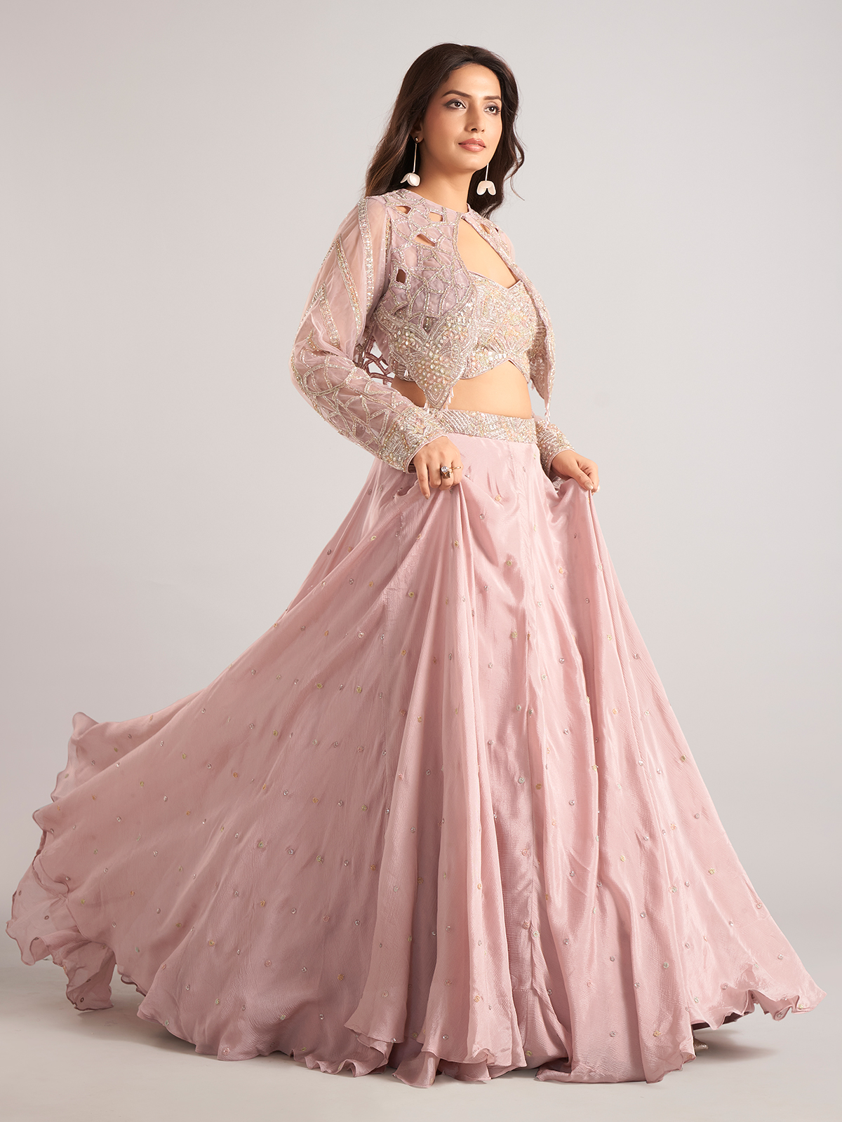 Step into elegance with this onion pink georgette lehenga choli, styled with a chic jacket. Detailed with cutdana, sequins, beads, and thread work, it is a graceful pick for weddings and festive evenings alike.