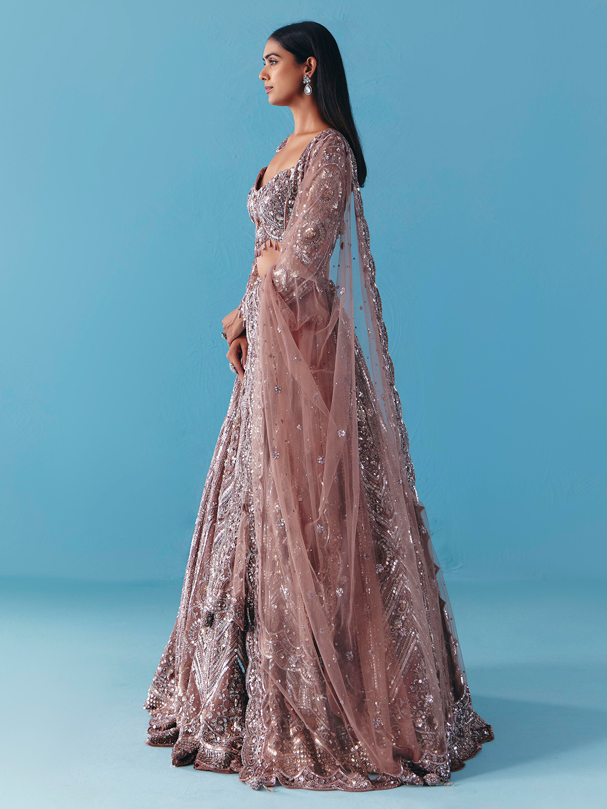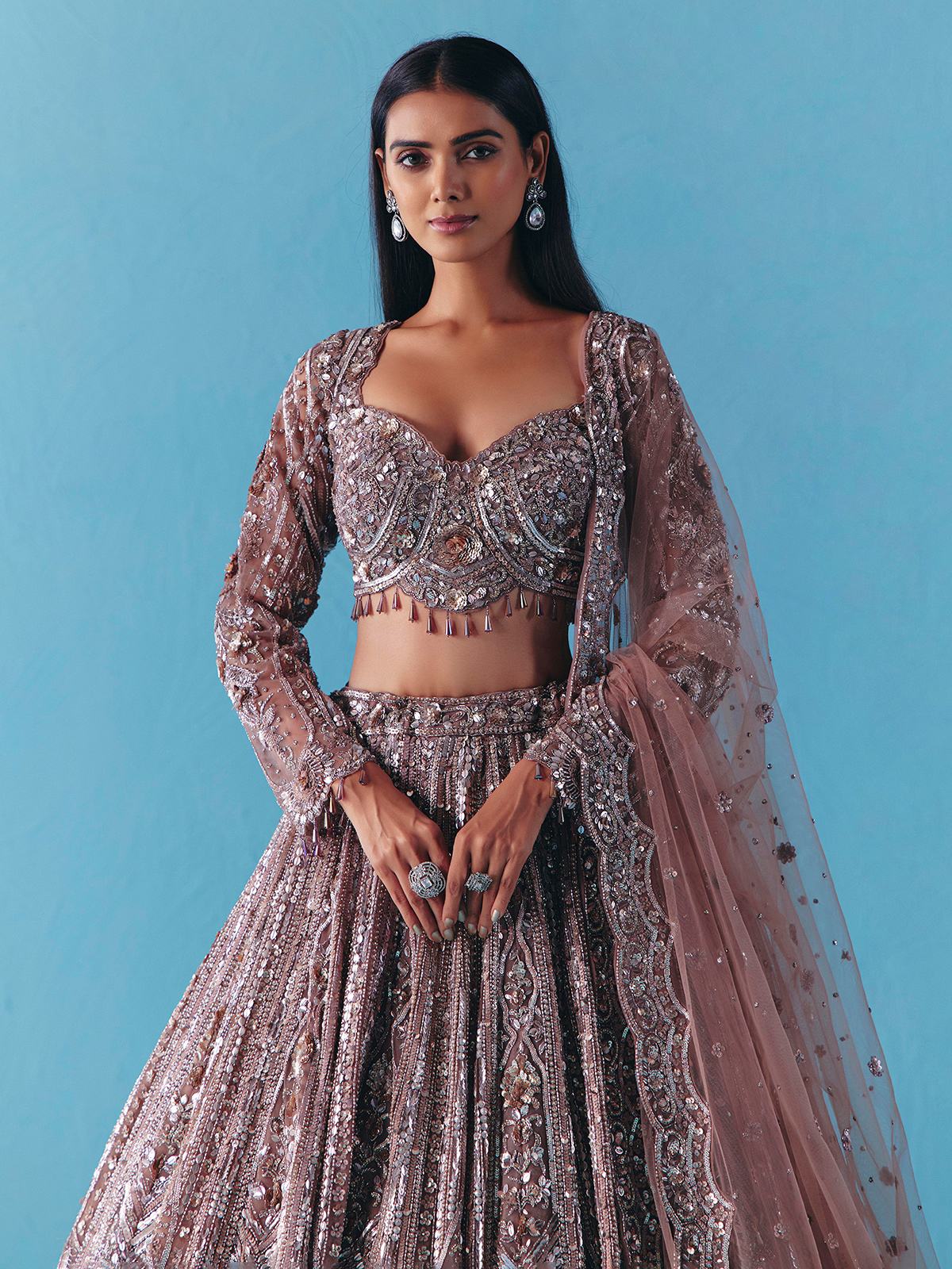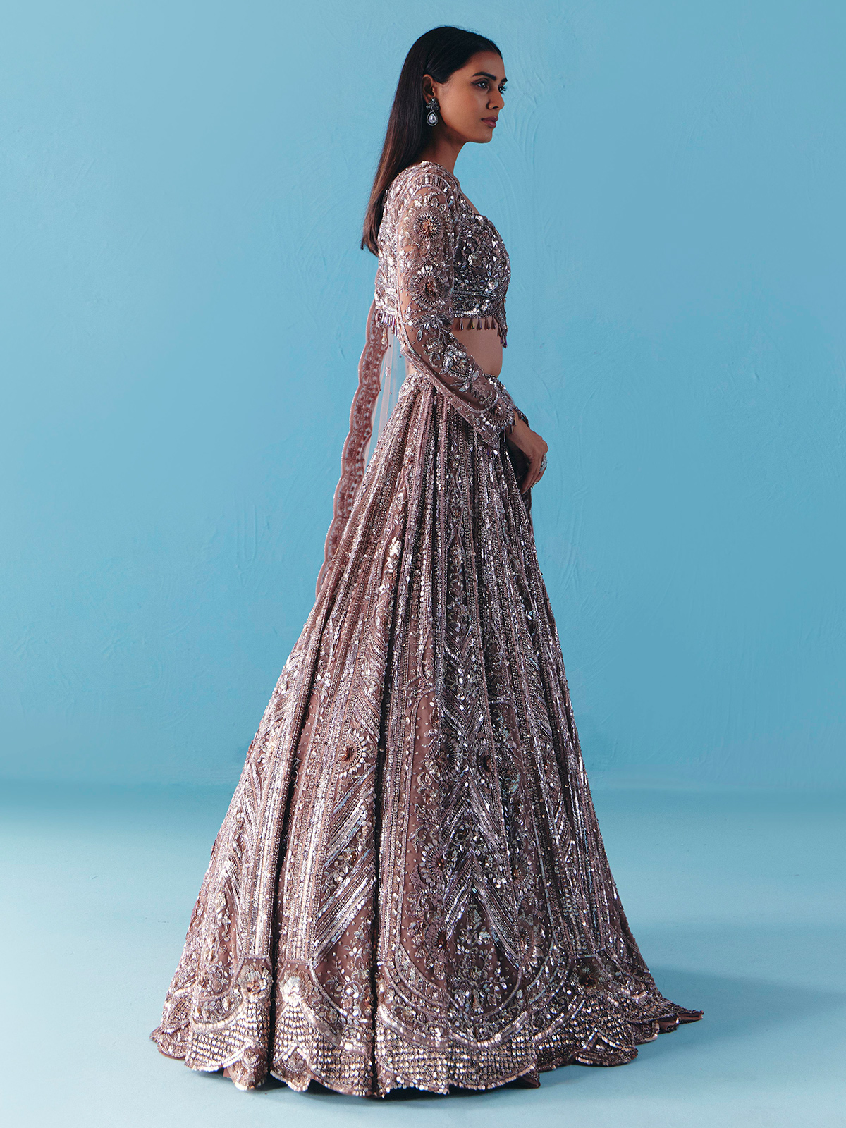 This onion pink net lehenga sparkles with beads, diamonds, sequins, and cutdana work. Featuring a sweetheart neckline with full sleeves, paired with a dupatta, it is perfect for bridal occasions, receptions, and weddings, radiating romance with elegant brilliance.