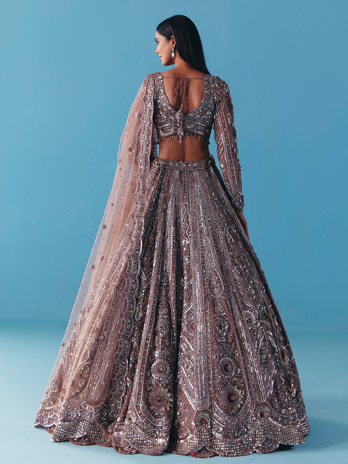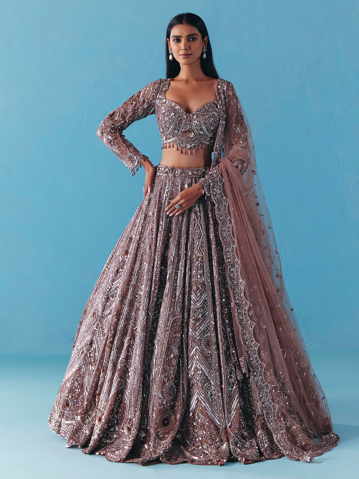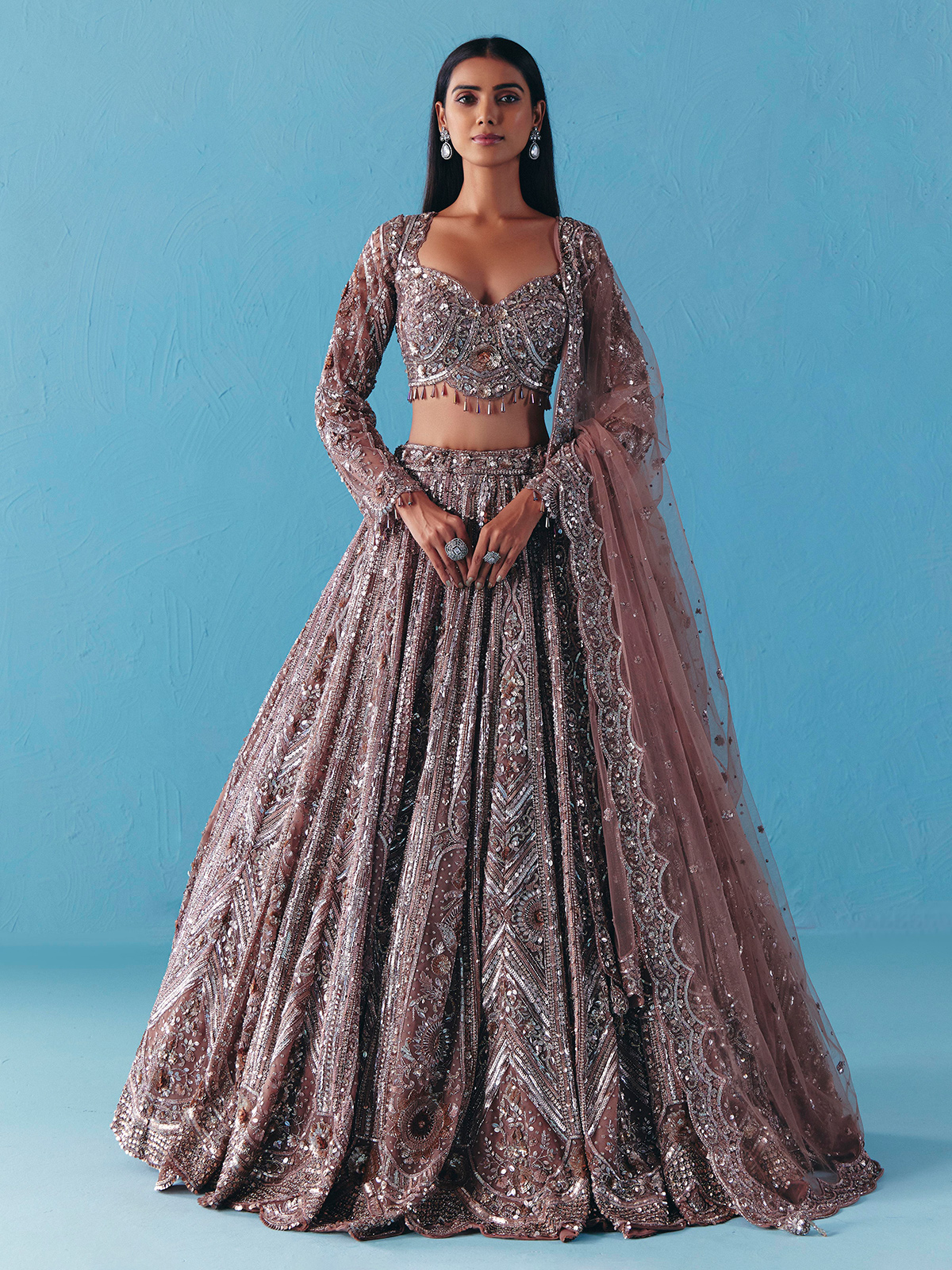 This onion pink net lehenga sparkles with beads, diamonds, sequins, and cutdana work. Featuring a sweetheart neckline with full sleeves, paired with a dupatta, it is perfect for bridal occasions, receptions, and weddings, radiating romance with elegant brilliance.
