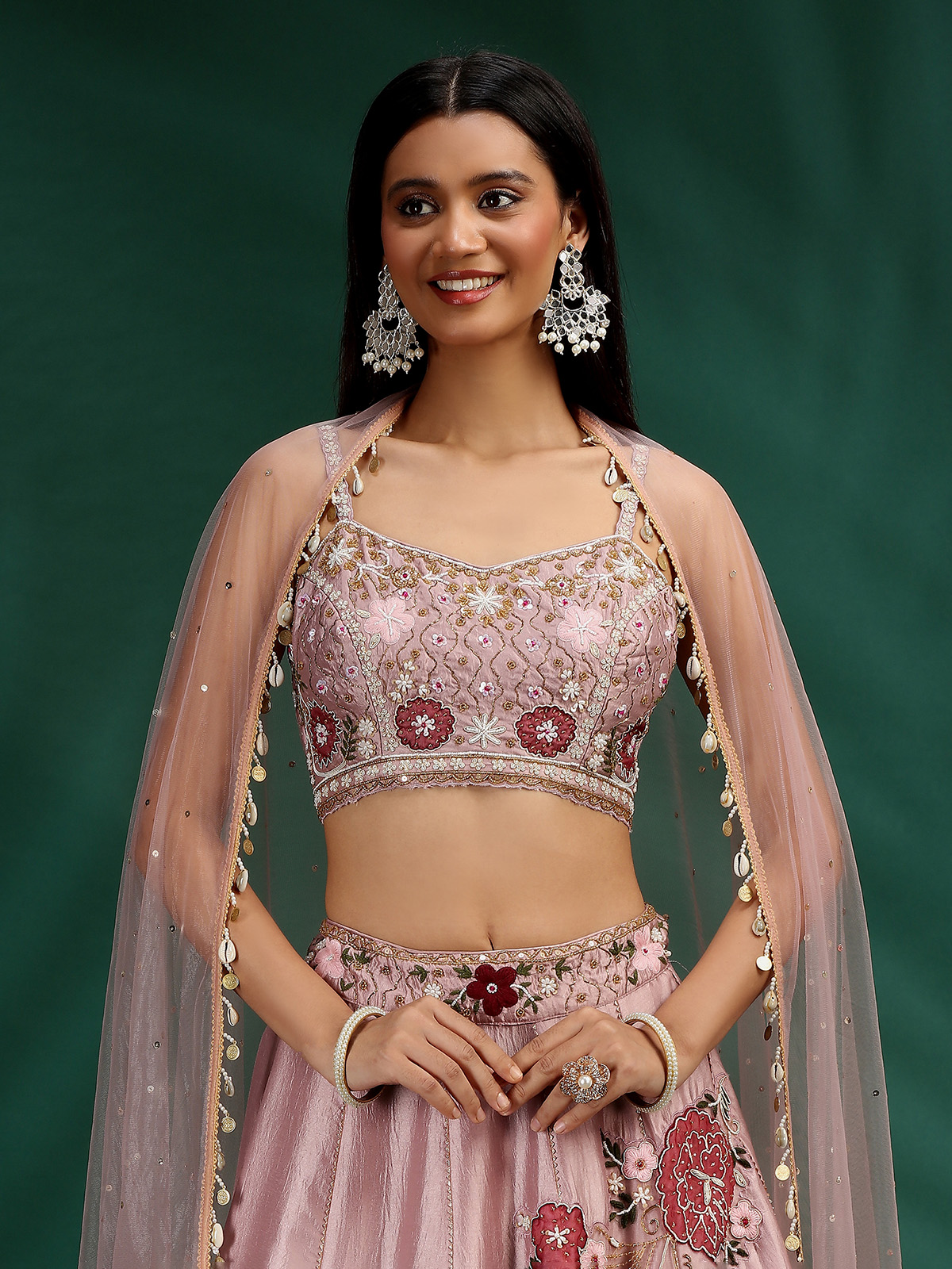 Drape yourself in artisanal elegance with this onion pink silk lehenga choli, lavishly detailed with cutdana, beads, sequins, cowrie shells, coins, zardosi, and thread work. The sleeveless sweetheart-neckline choli paired with a dupatta creates a radiant bridal charm, perfect for wedding grandeur.