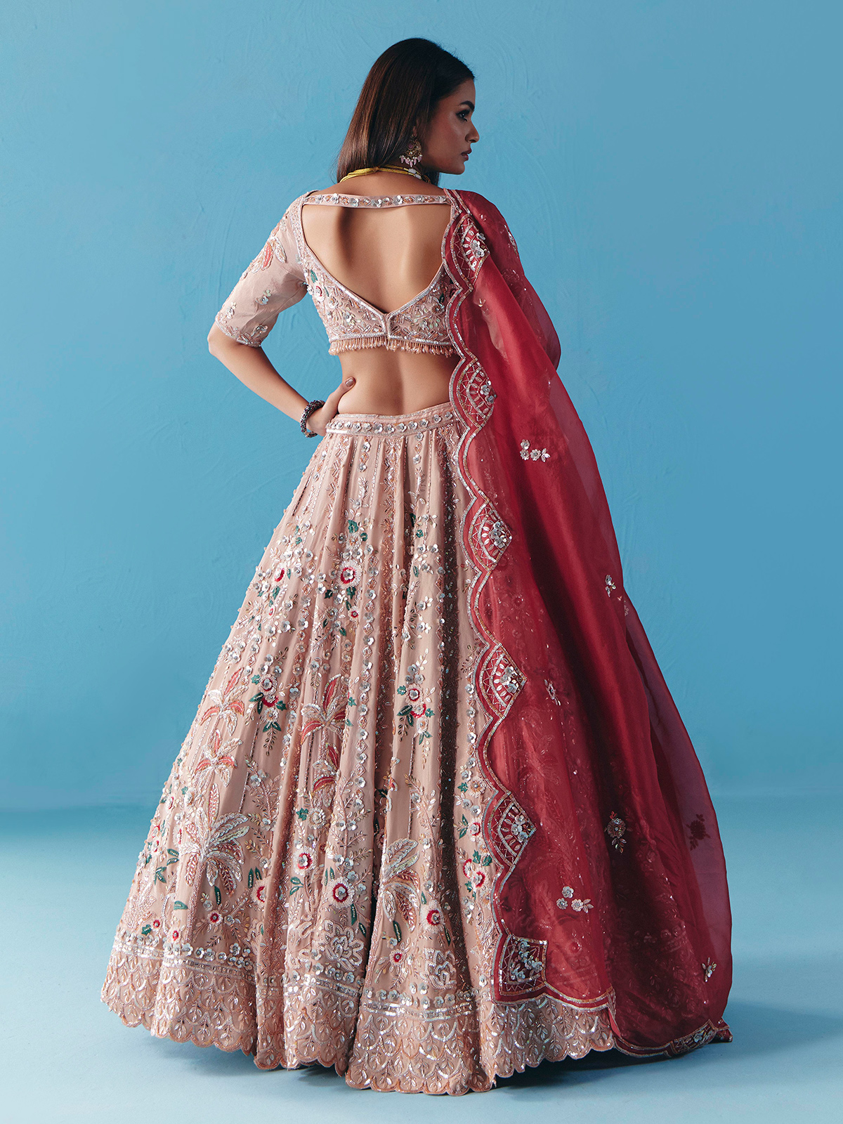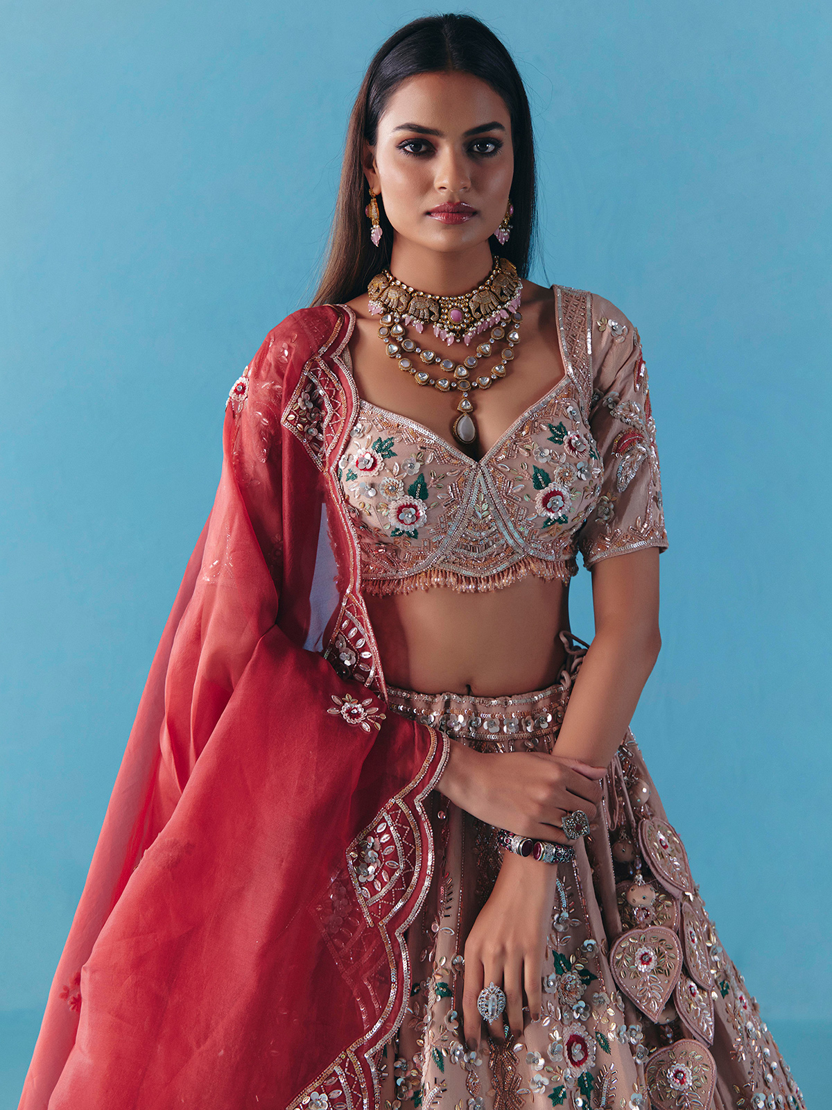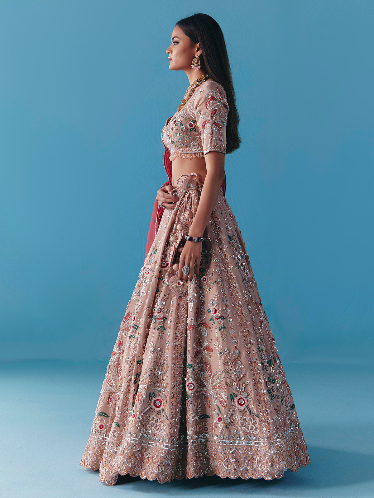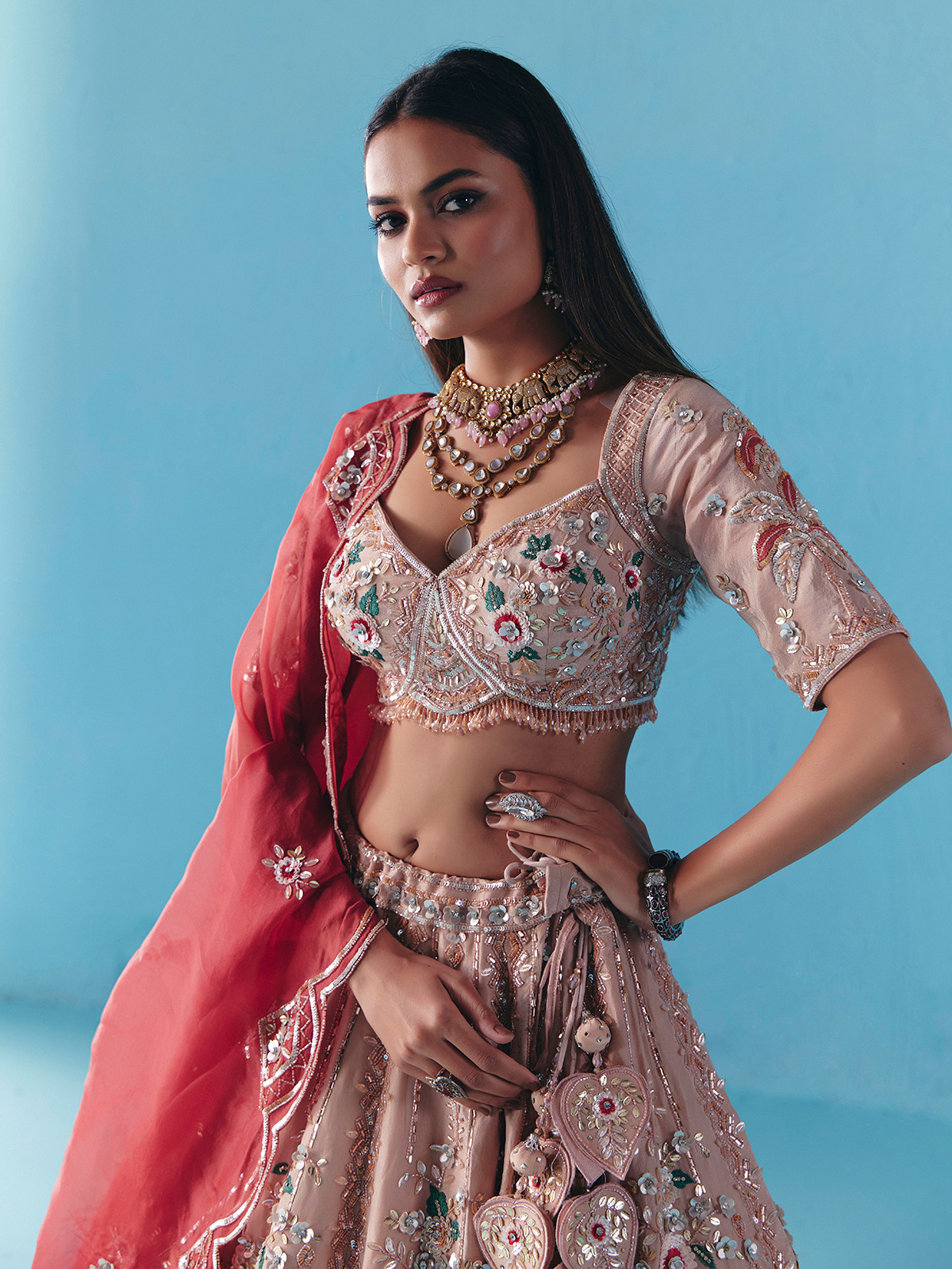 In radiant onion pink silk, this designer lehenga shines with sequins, cutdana, beads, diamond, and delicate threadwork. Styled with elbow sleeves and a sweetheart neckline, paired with a dupatta, it is a perfect fit for weddings, receptions, and bridal functions.