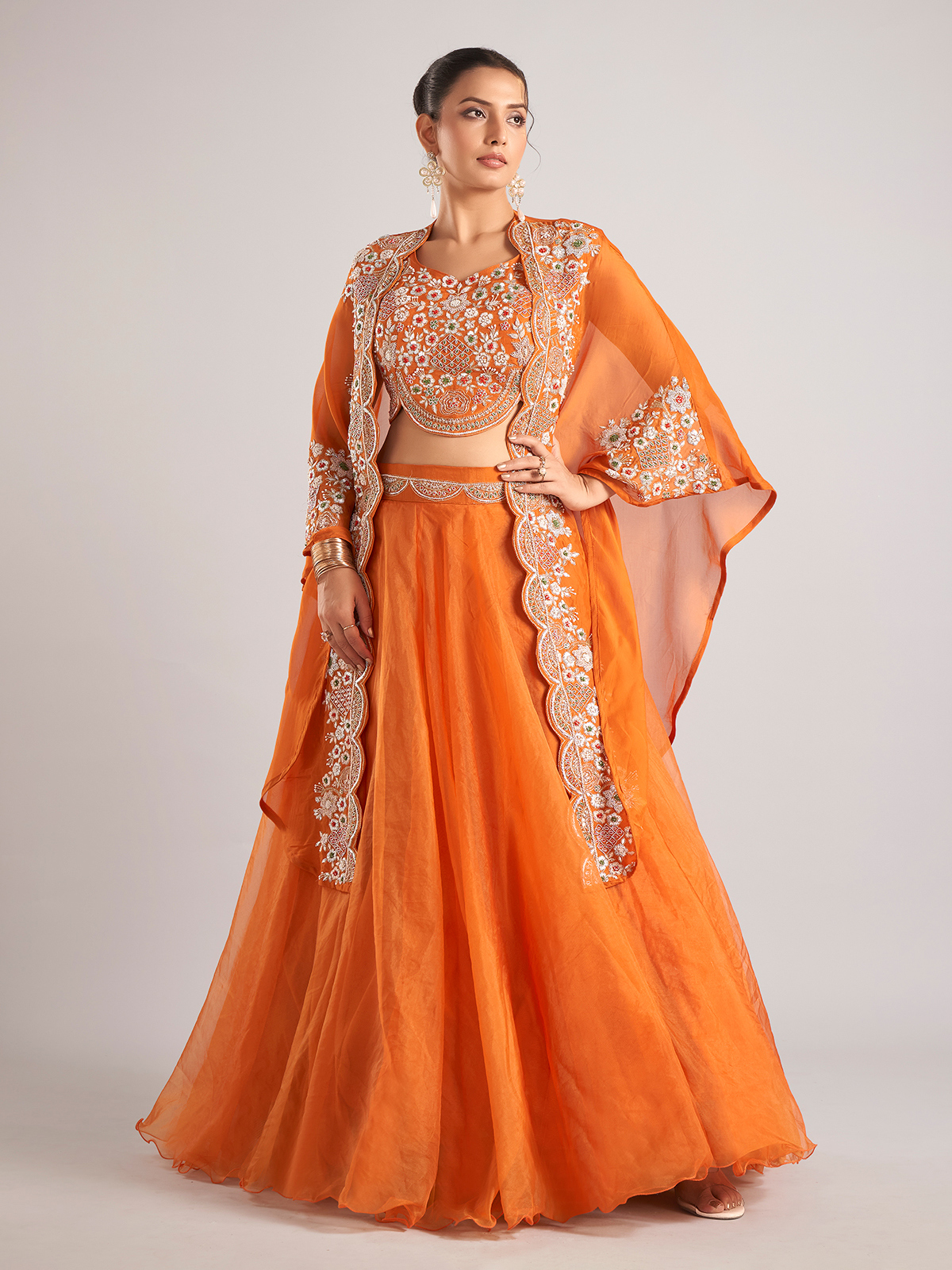 Step into festive radiance with this orange organza lehenga choli, styled with a shrug. Designed with resham, thread, zardosi, sequins, and cutdana work, and finished with a round neck and sleeveless cut, it’s a striking ensemble for celebrations.