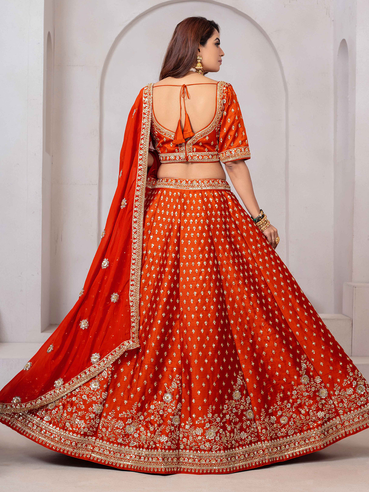 Bright orange raw silk lehenga choli with elegant cutdana, sequins, and bead work. Styled with a sweetheart neckline, elbow sleeves, and paired with a dupatta, it is ideal for weddings and festive occasions.