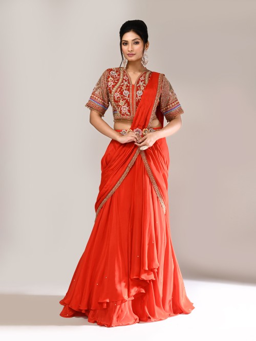 Glow with grace in this orange silk lehenga choli, finely embellished with sequins, cutdana, beads, embroidery, zardosi, and thread. Styled with elbow sleeves, V-neckline, and attached dupatta, this ensemble is a dazzling choice for weddings and receptions, radiating festive brilliance.