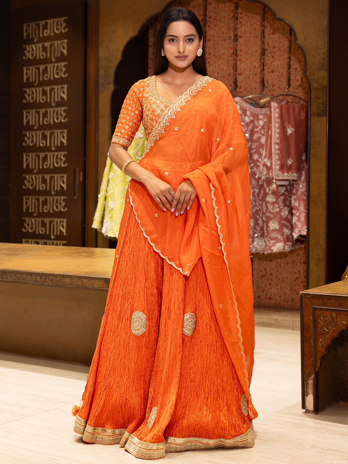 Get a perfect wedding look in your upcoming wedding occasion with our gorgeous orange lehenga choli. Made of rich silk fabric this lehenga choli is adorned with aabla, beads, cutdana, resham and gota work detailing, to give it exact glow of wedding. Choli is designed with Sweetheart neckline and elbow sleeves, gives a classic statement, dupatta completes the ensemble.