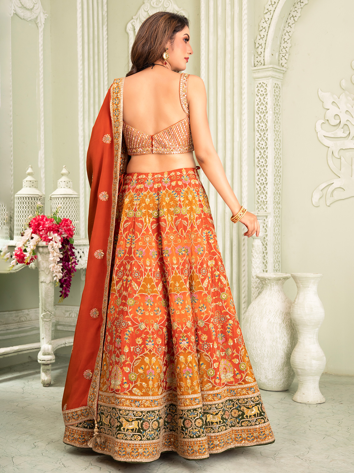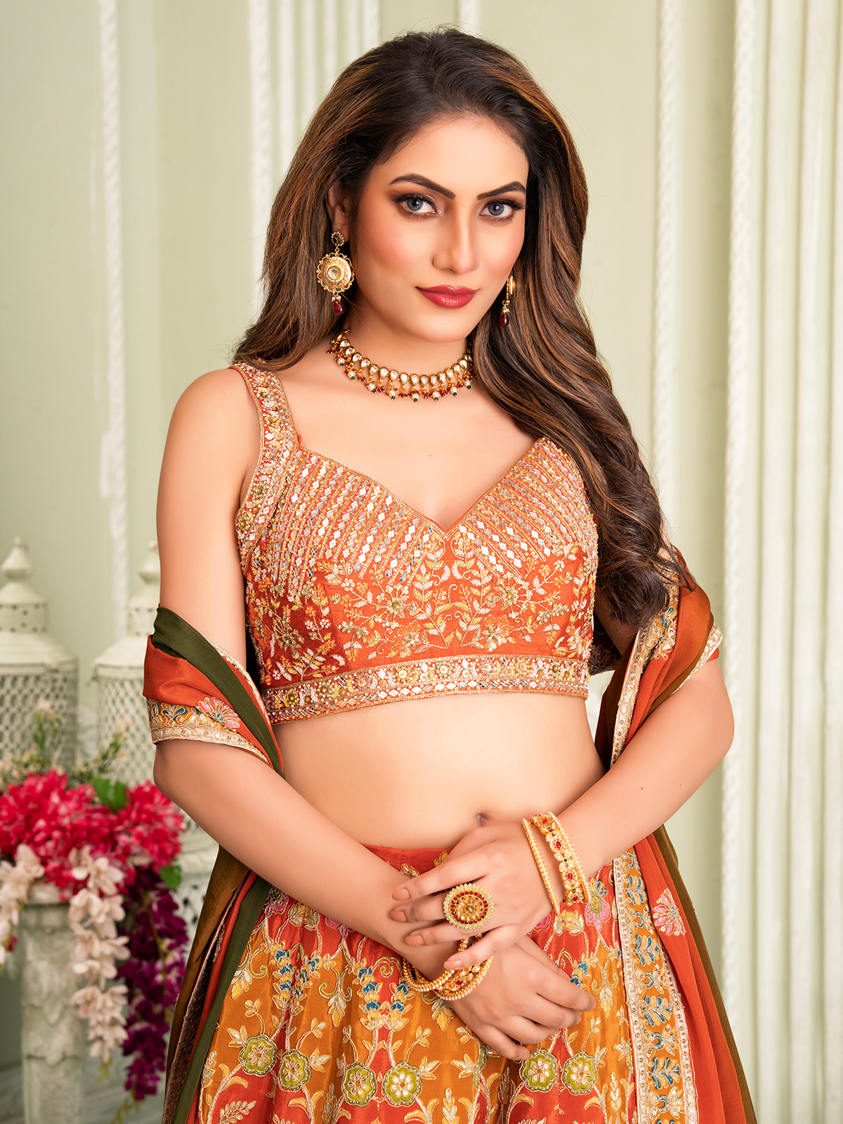 This orange silk lehenga choli is a perfect blend of tradition and glamour, featuring intricate zardosi, resham, sequins, beads and cutdana work. Comes with a ready made blouse, ideal for weddings and festive celebrations.
