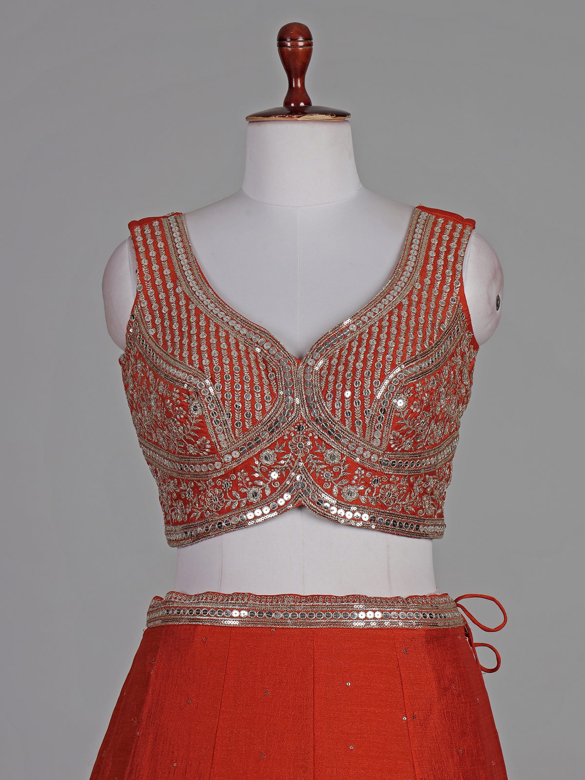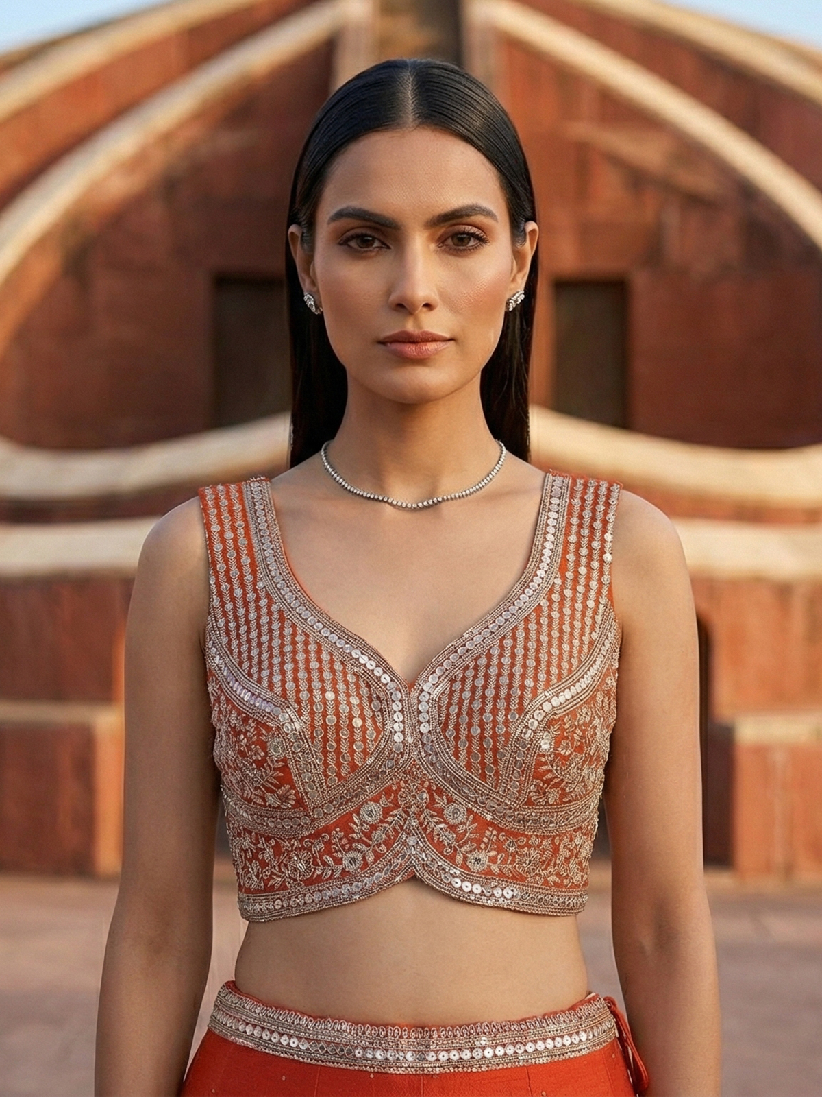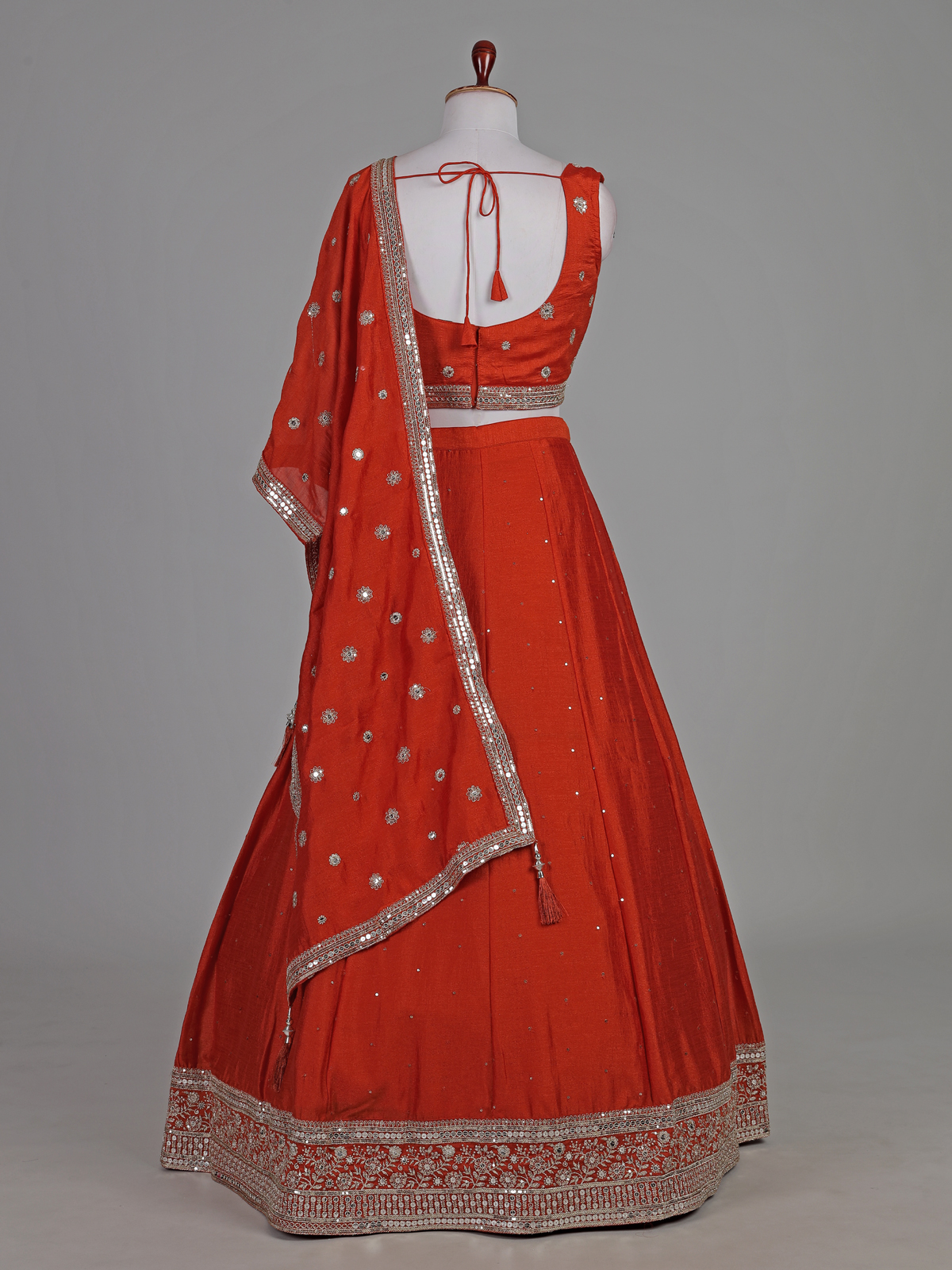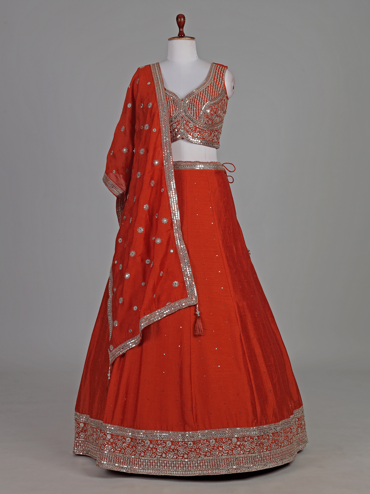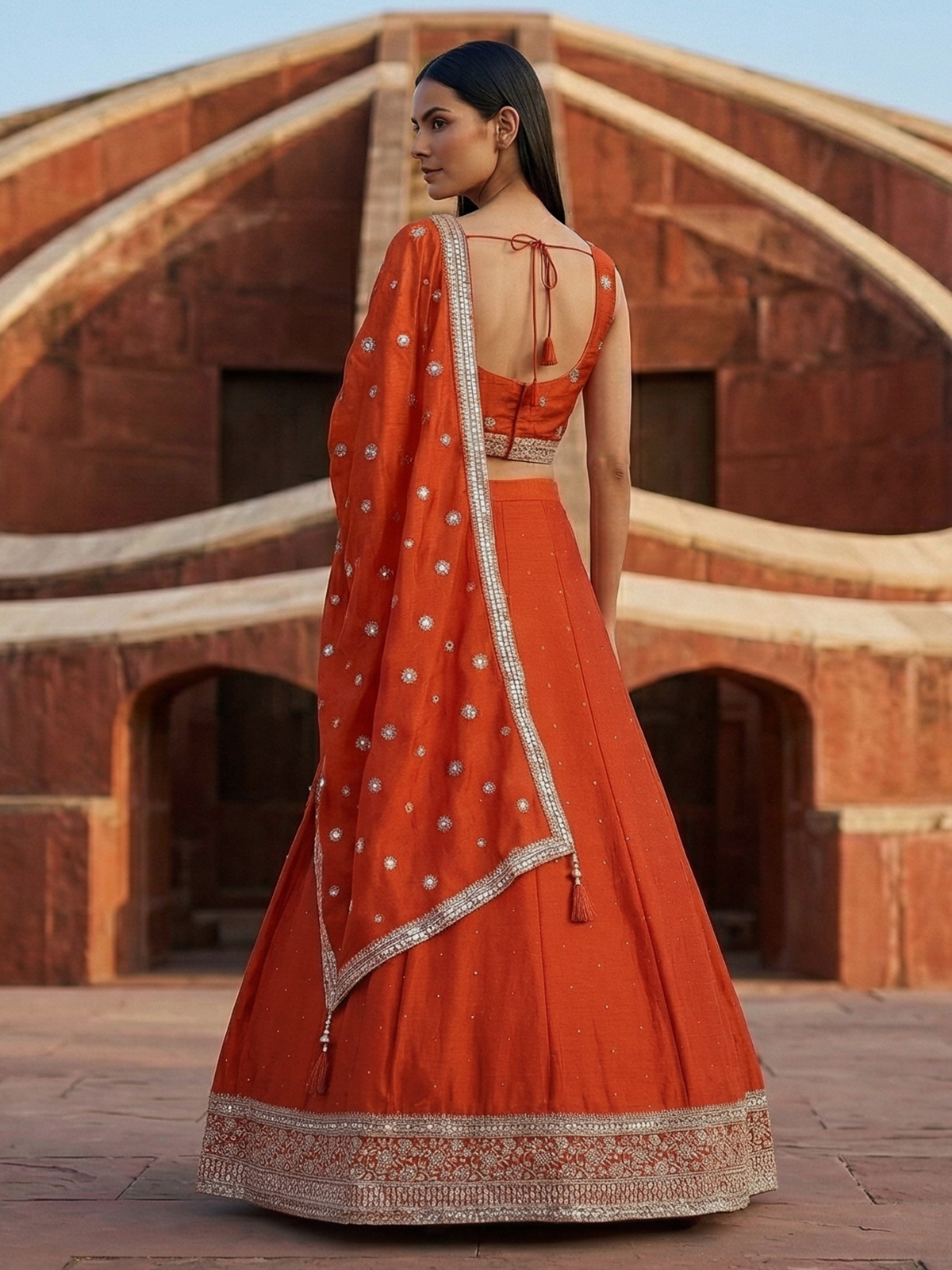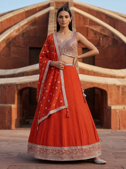 Vibrant orange bring festive warmth to this silk lehenga choli. Crafted for joyful occasions. Enhanced with resham and sequin detailing. It reflects lively elegance. The sleeveless sweetheart blouse adds modern flair. While the flowing silhouette ensures graceful movement. Paired with a dupatta, this outfit is ideal for weddings, sangeet and celebratory gatherings.