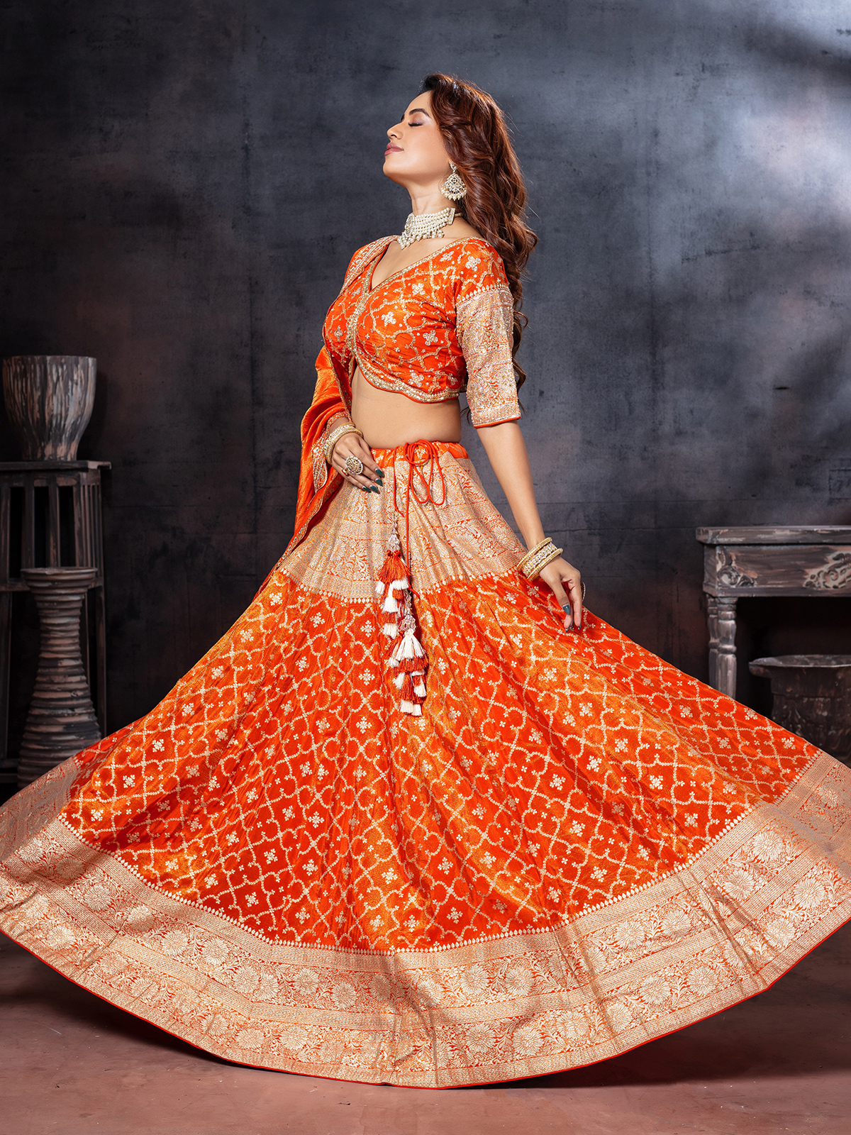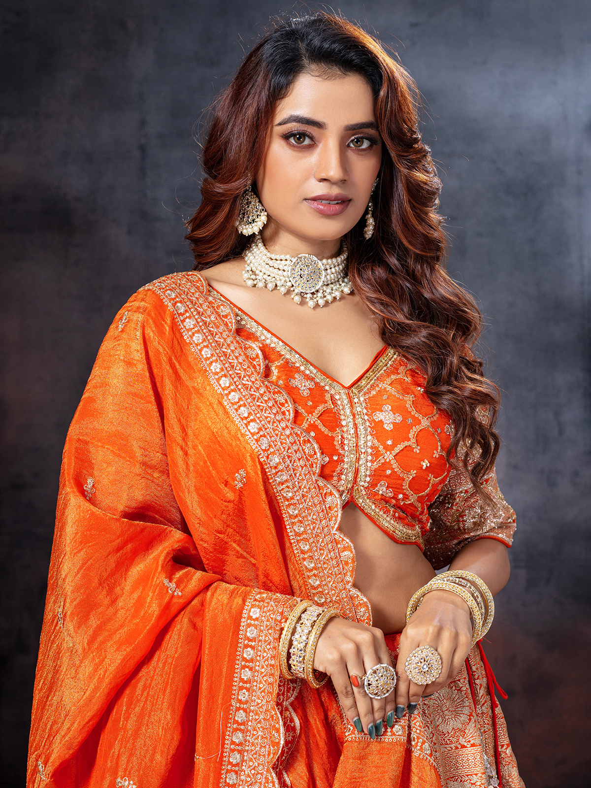 Show stopping orange tissue silk lehenga choli detailed with zardosi, sequins, cutdana, and zari work. Featuring elbow-length sleeves and a V neckline, paired with a dupatta, it is perfect for festive or bridal occasions.