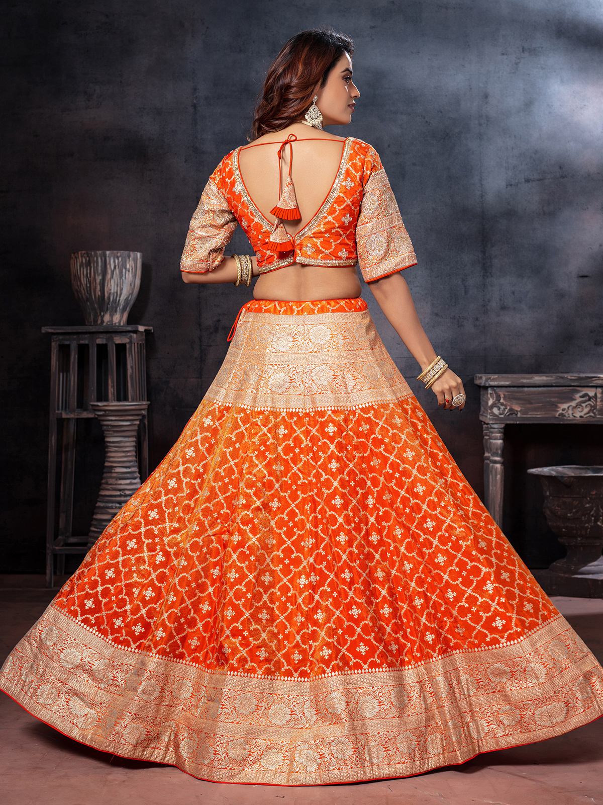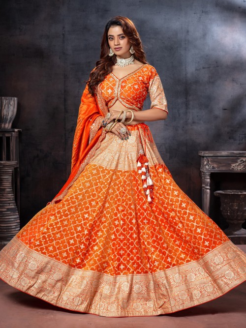 Orange Zardosi Tissue Silk Lehenga Choli With Elbow Sleeves