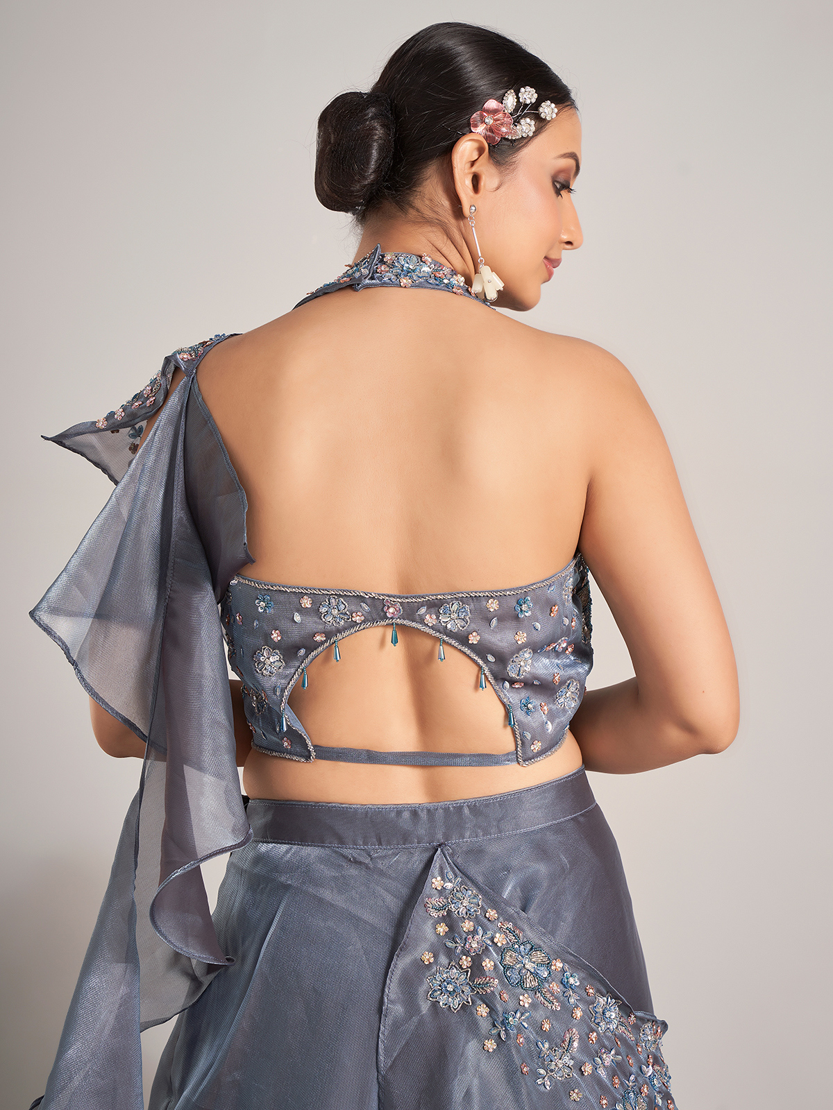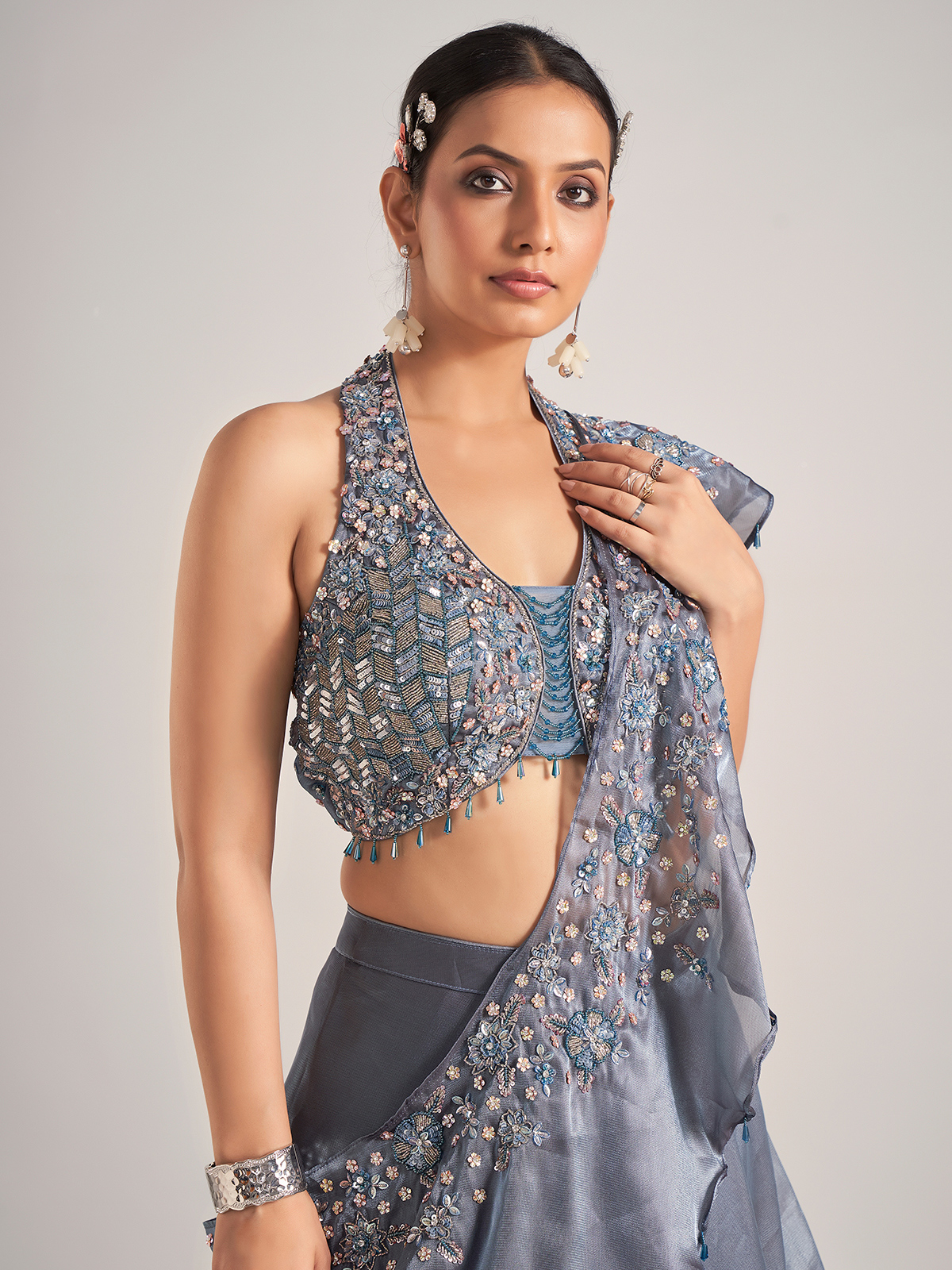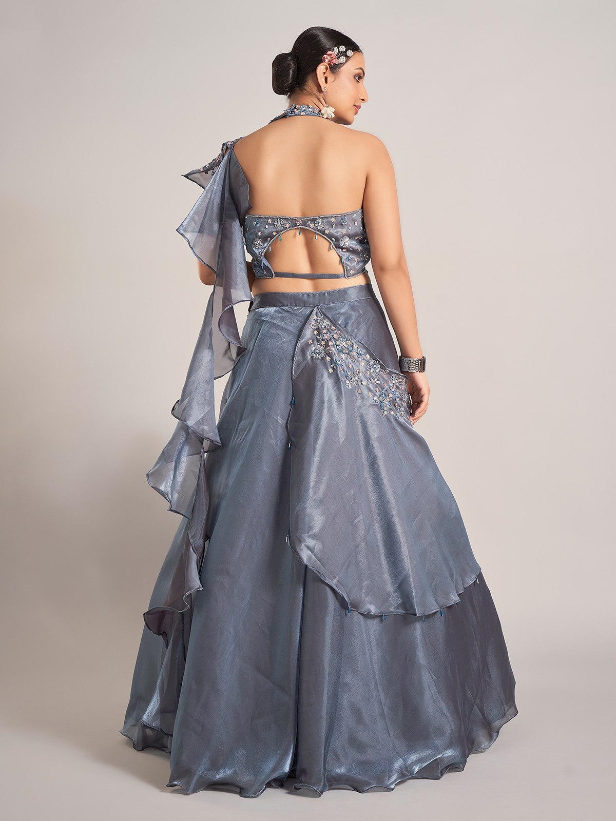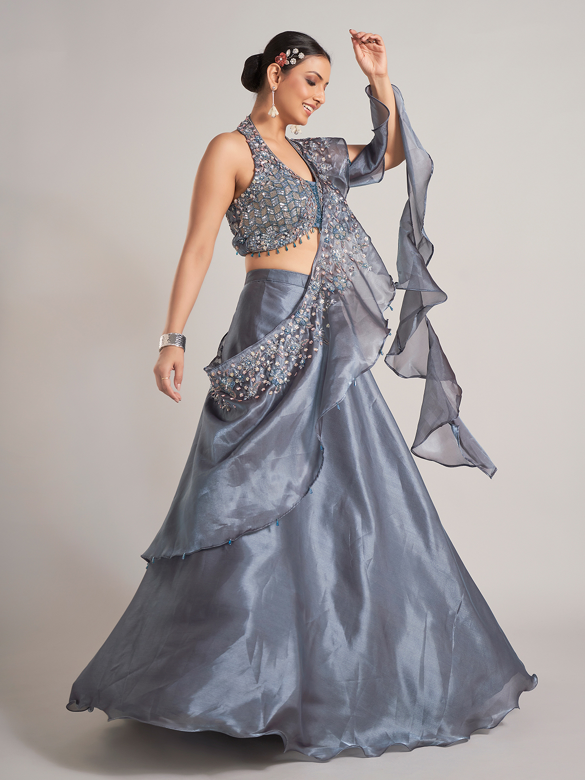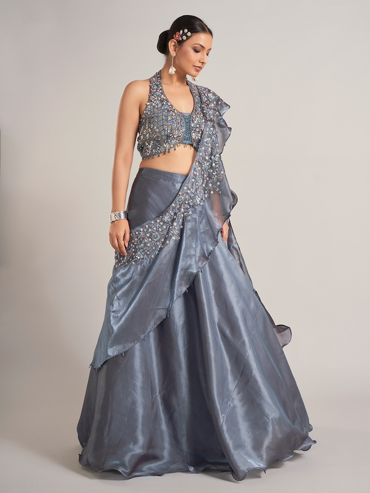 Organza Dark Grey Lehenga Choli With Attached Dupatta