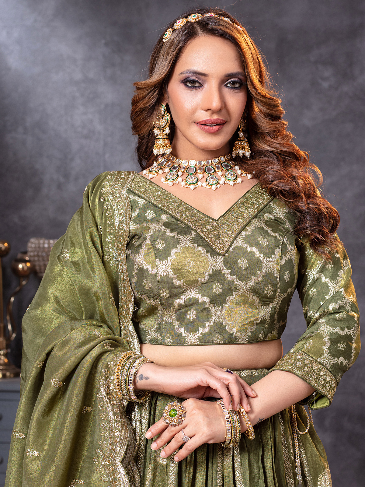 Gentle pastel green tissue silk lehenga choli embellished with resham, sequins, and zari work. Styled with a V neckline, quarter sleeves, and paired with a dupatta, it radiates soft elegance for weddings, bridal looks, and mehendi functions.