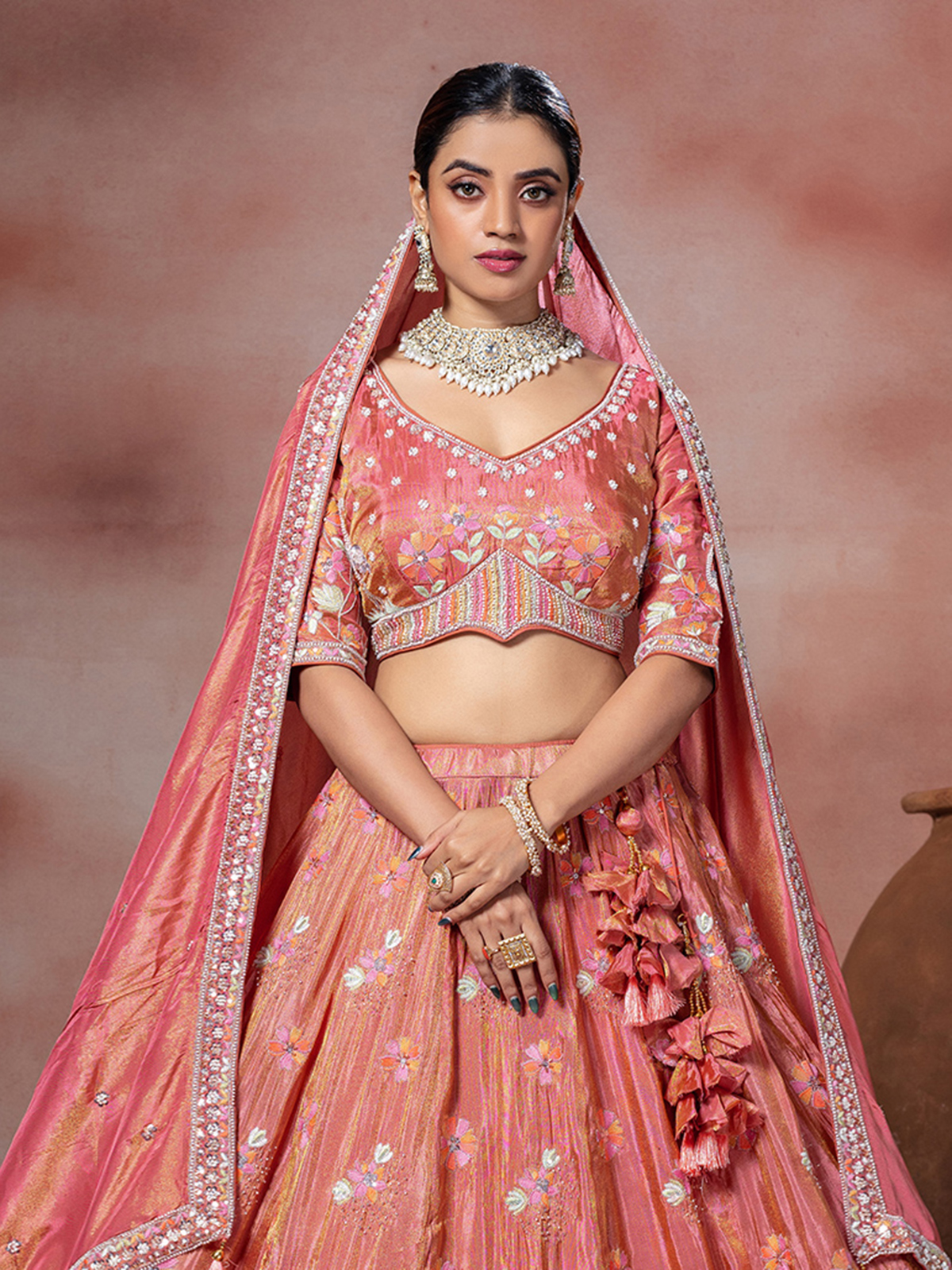 Graceful pastel peach tissue silk lehenga choli featuring embroidery, cutdana, sequins, and bead work. With a sweetheart neckline, elbow sleeves, and paired with a dupatta, it is perfect for bridal and festive occasions.