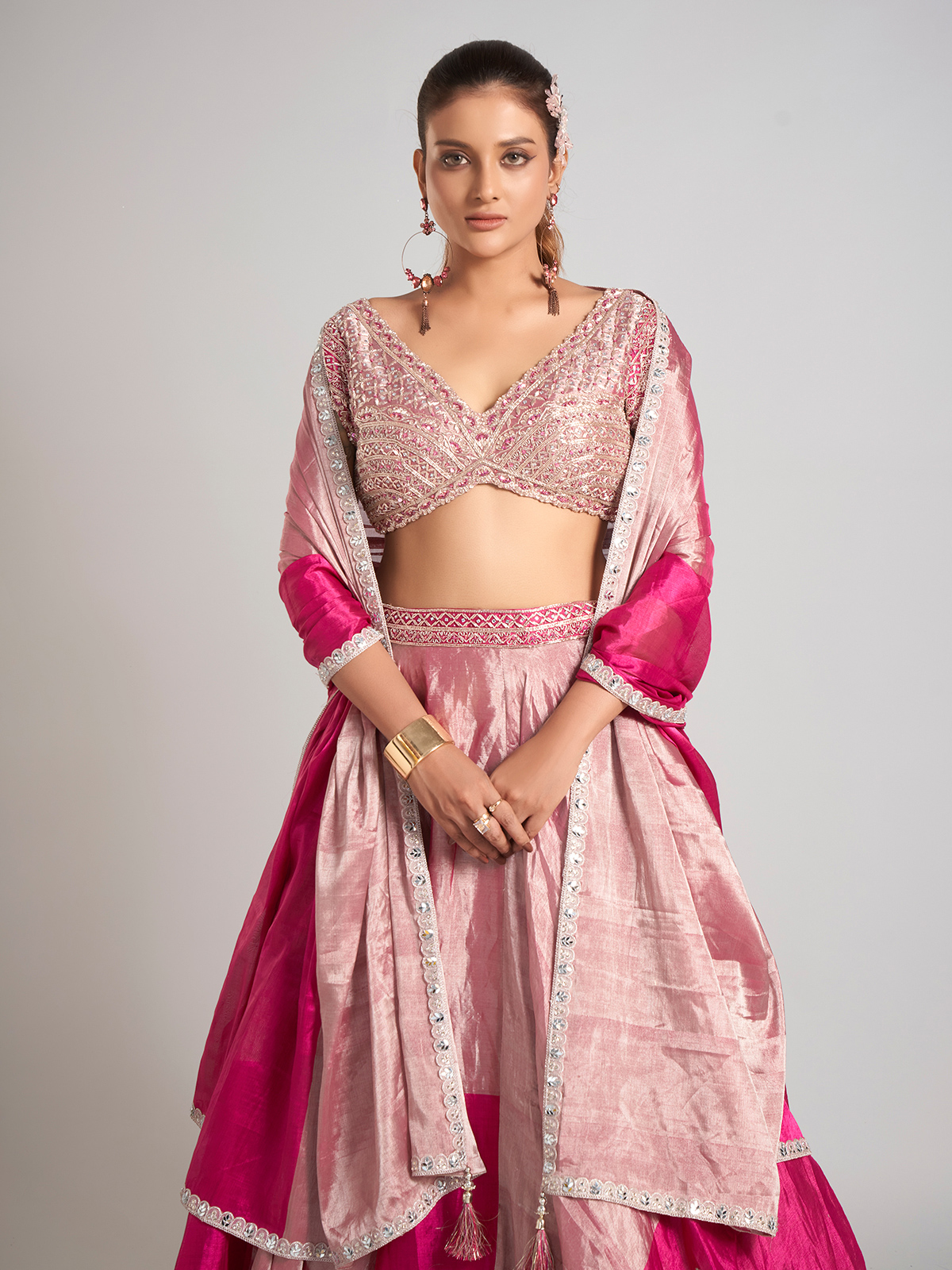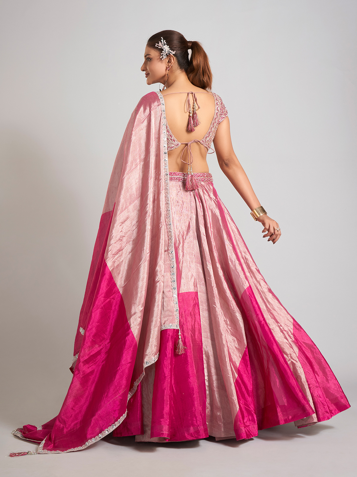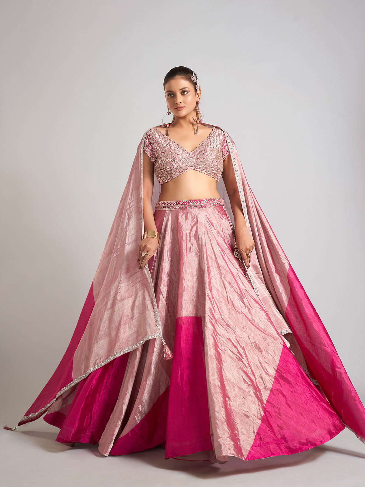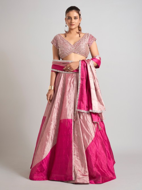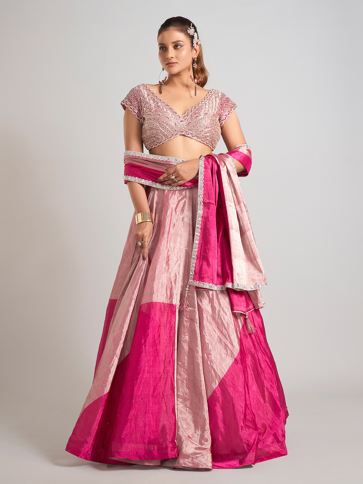 Pastel pink silk lehenga choli decked with zardosi, mirror, cutdana, sequins and beads work. Styled with a V neckline and cap sleeves, it includes a dupatta for a festive look.