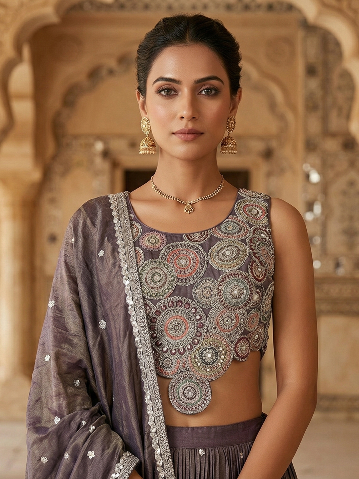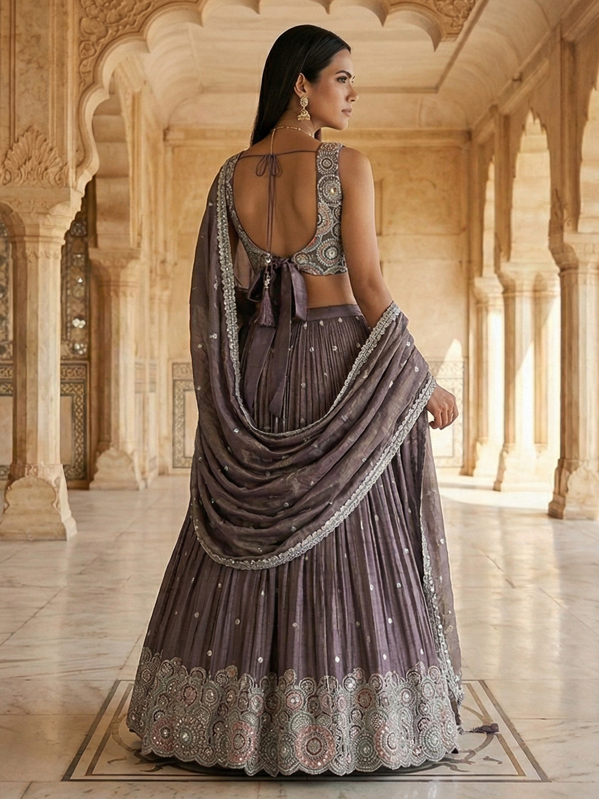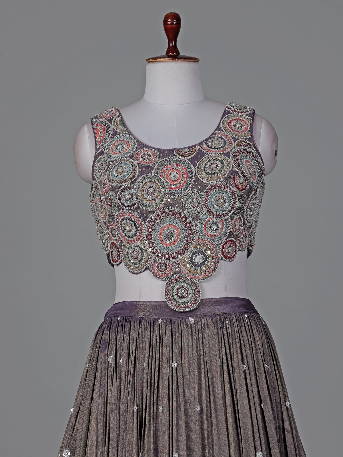 Soft pastel purple hues bring delicate charm to this silk lehenga choli, embellished with cutdana, sequins, beads, thread and resham work. The round neckline and sleeveless style create a graceful silhouette. Paired with a dupatta, it is perfect for weddings, receptions and sangeet events.