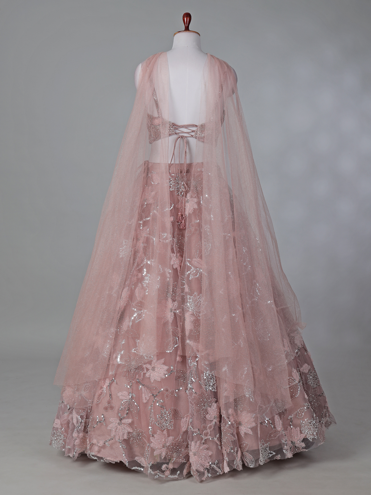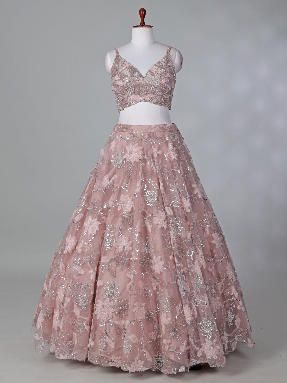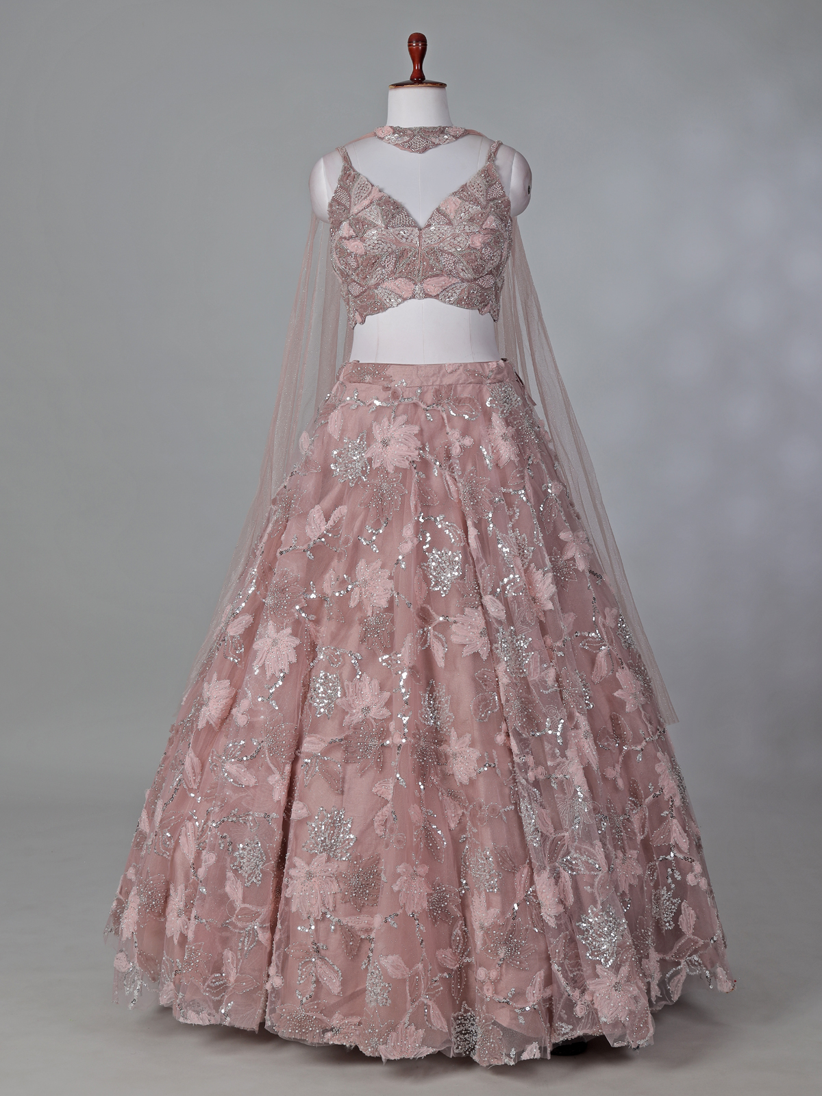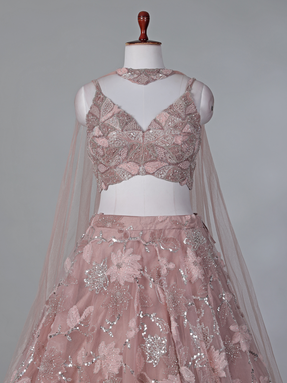 Glow with soft elegance in this delightful peach net lehenga choli designed for festive beauty. Sequins, beads, and cutdana embellishments add radiant sparkle. The sleeveless sweetheart neckline choli enhances feminine charm and is paired with a chic choker dupatta, ideal for celebrations.