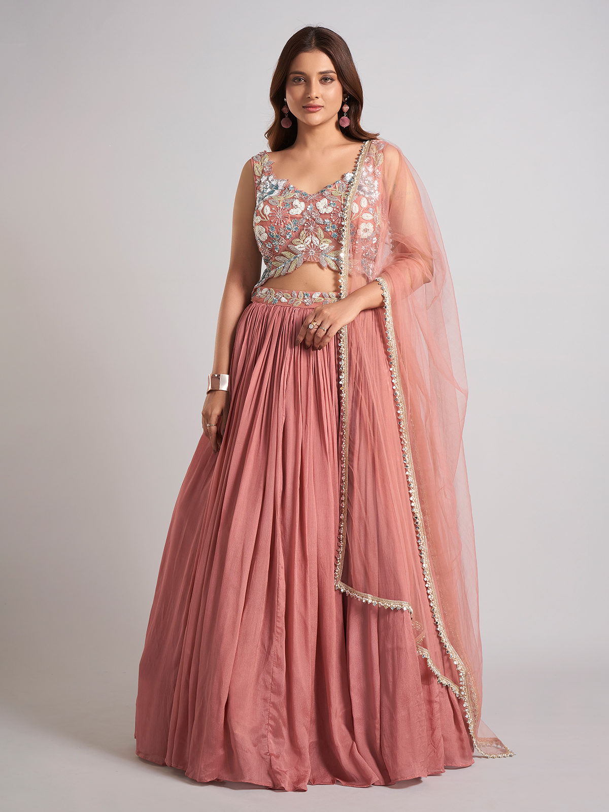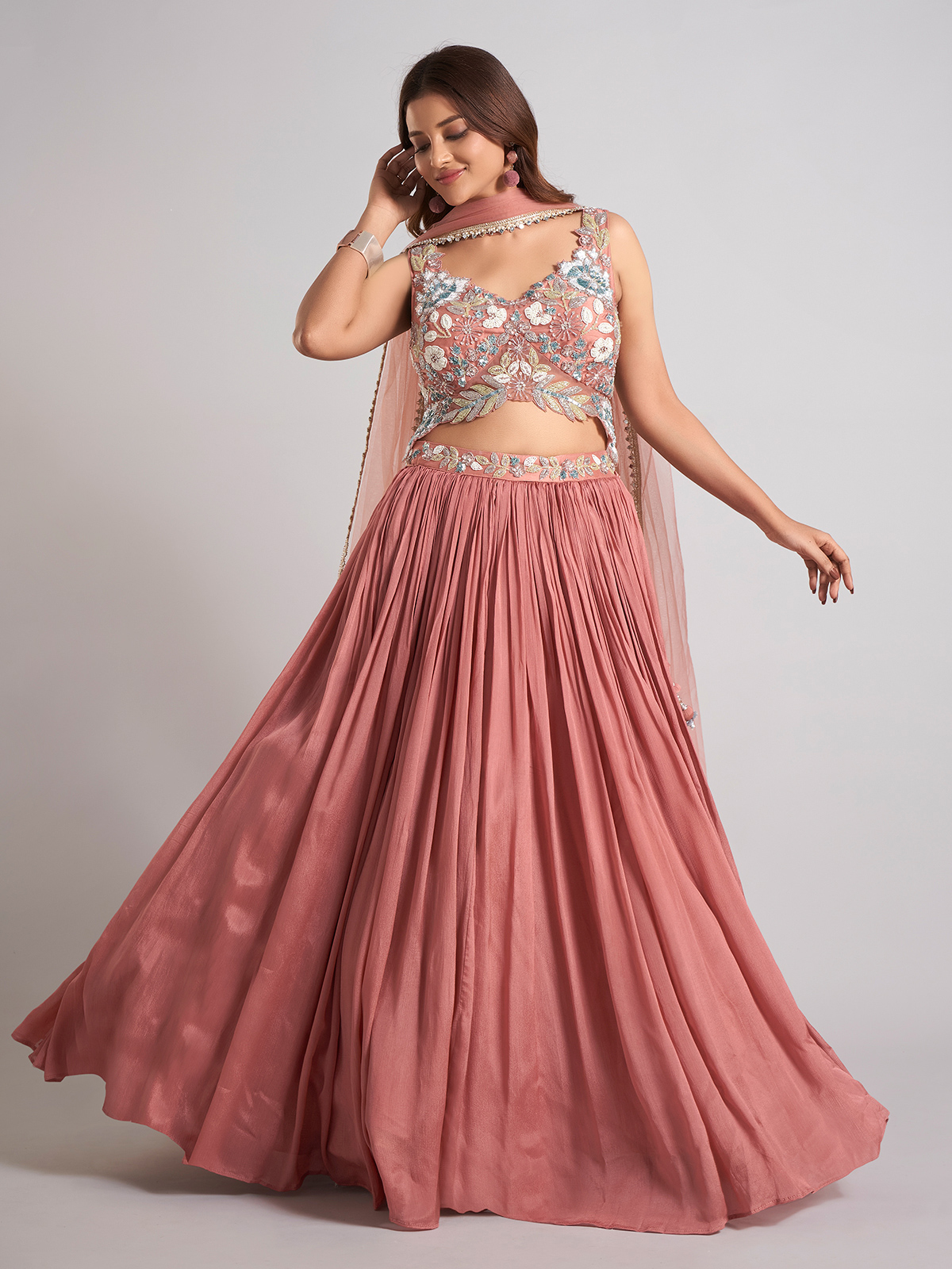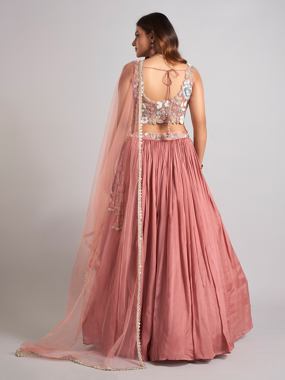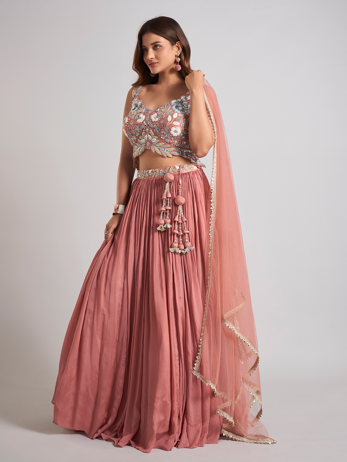 Peach silk lehenga choli adorned with cutdana, sequins, beads and stones work. Sleeveless with a sweetheart neckline and a graceful dupatta, this ensemble is perfect for weddings and festive receptions.