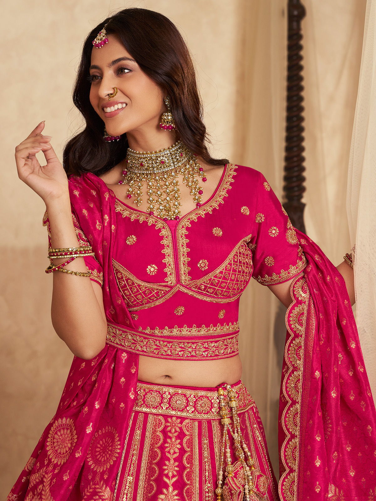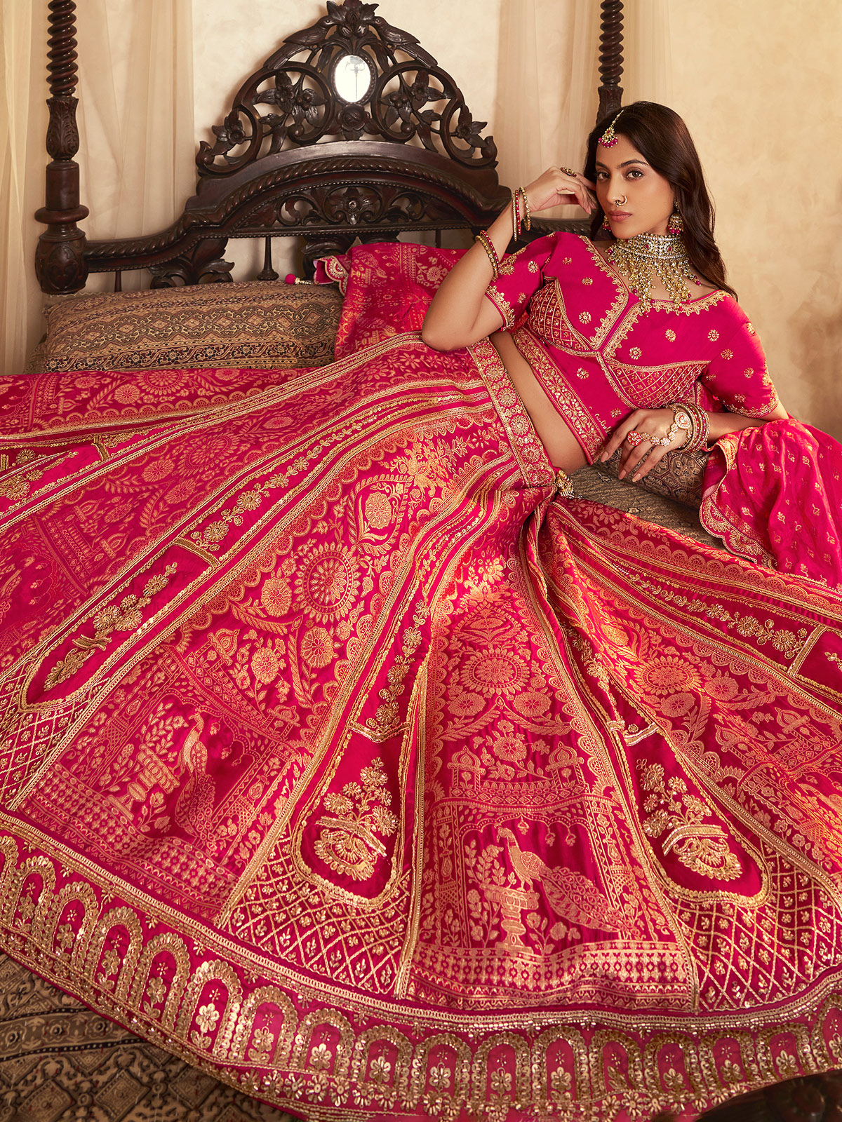 This pink banarasi silk ensemble features fine embroidery, shimmering sequins, brilliant swarovski stones and traditional zari weaving work. The package includes lehenga, blouse, dupatta and belt. It comes as unstitched lehenga choli for perfect customization. Suitable for wedding, reception and bridesmaid occasions. Please note clutch (purse) is not included.