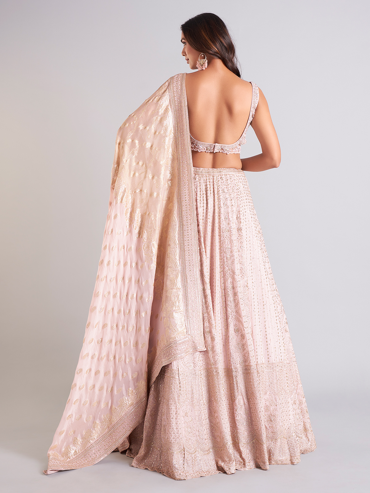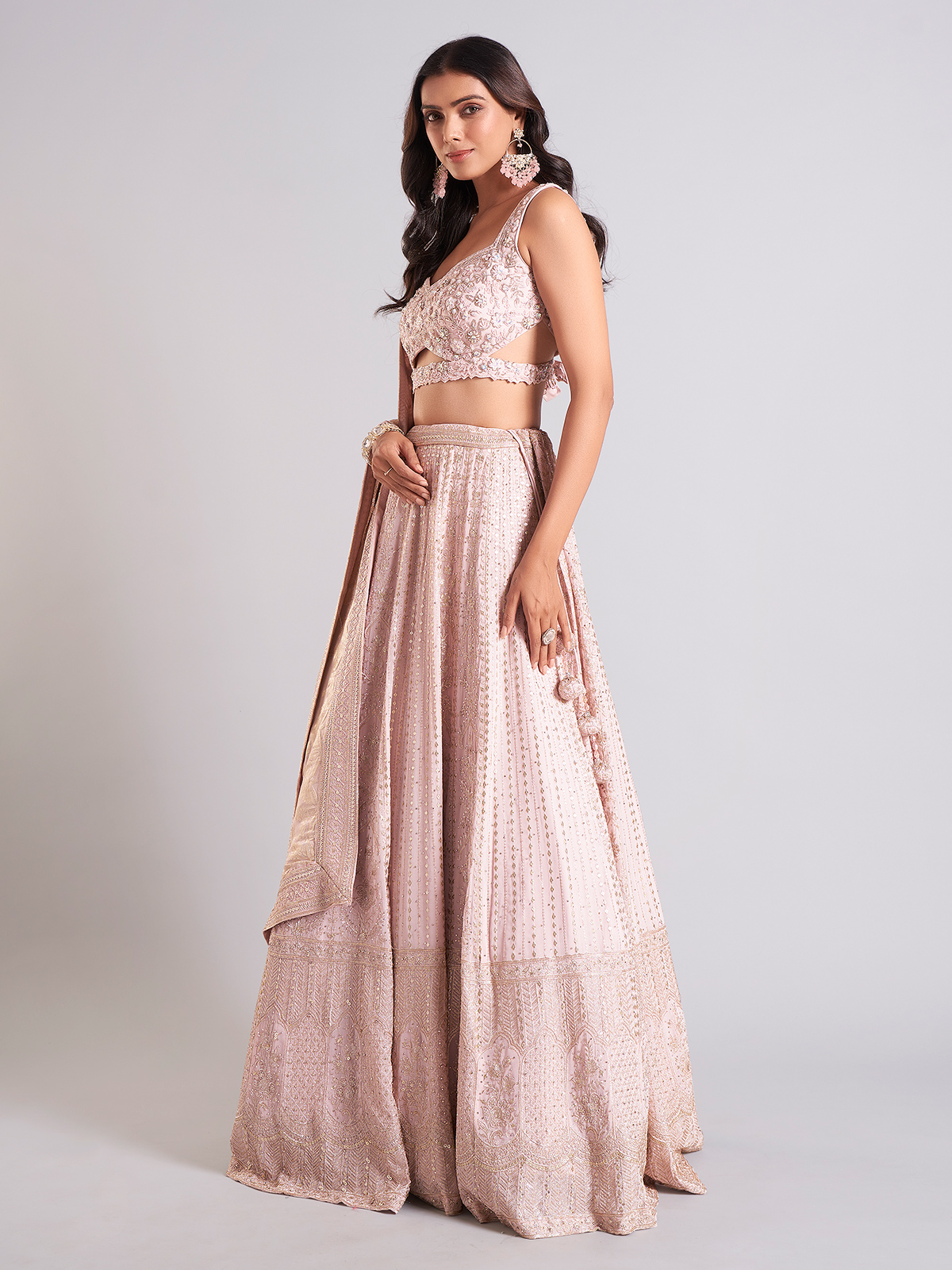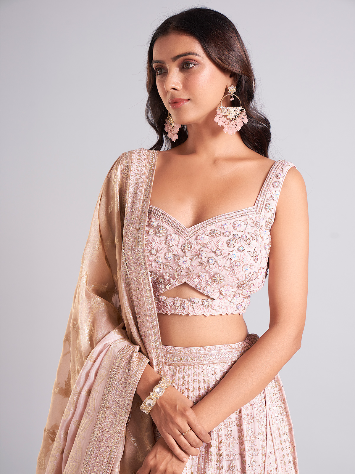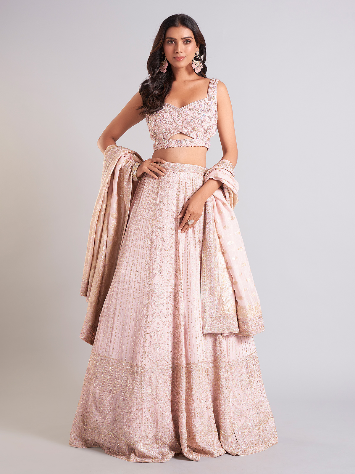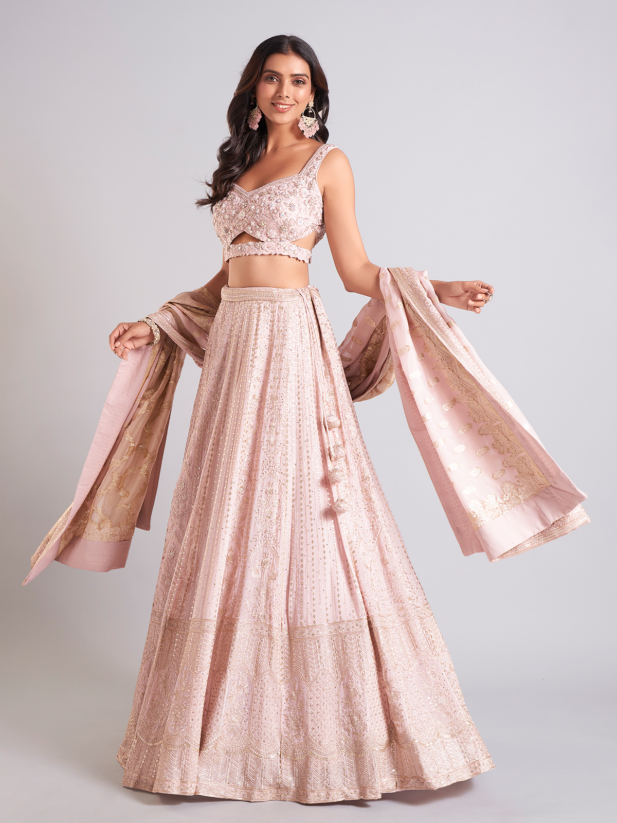 Make your wedding day special with this pink georgette lehenga choli, crafted with resham, stones, cutdana, and sequins work. Paired with a matching dupatta, this outfit exudes grace and style.
