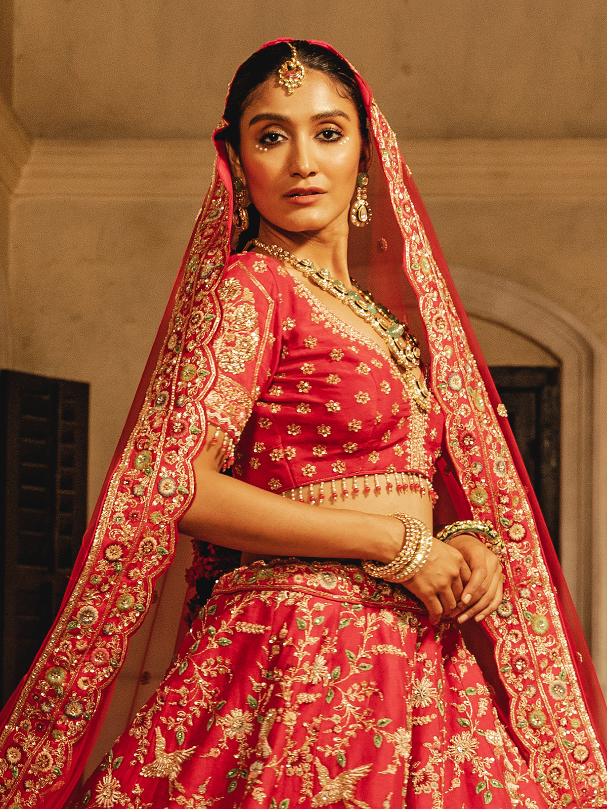 Designed for a bride who embraces soft elegance, this pink raw silk unstitched lehenga choli blends grace with subtle charm. The soothing color lends a romantic bridal appeal while remaining richly festive. Embellished with beads, resham, cutdana and sequins, it comes with a dupatta that completes the wedding-ready ensemble.