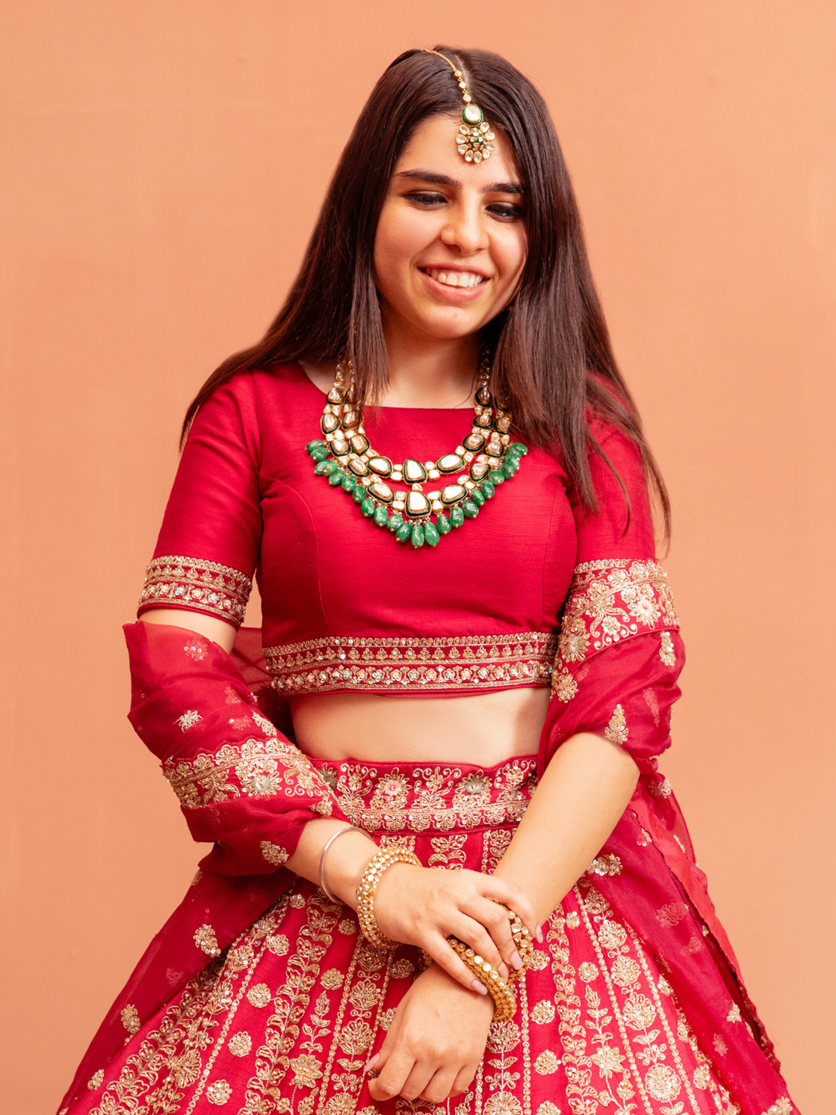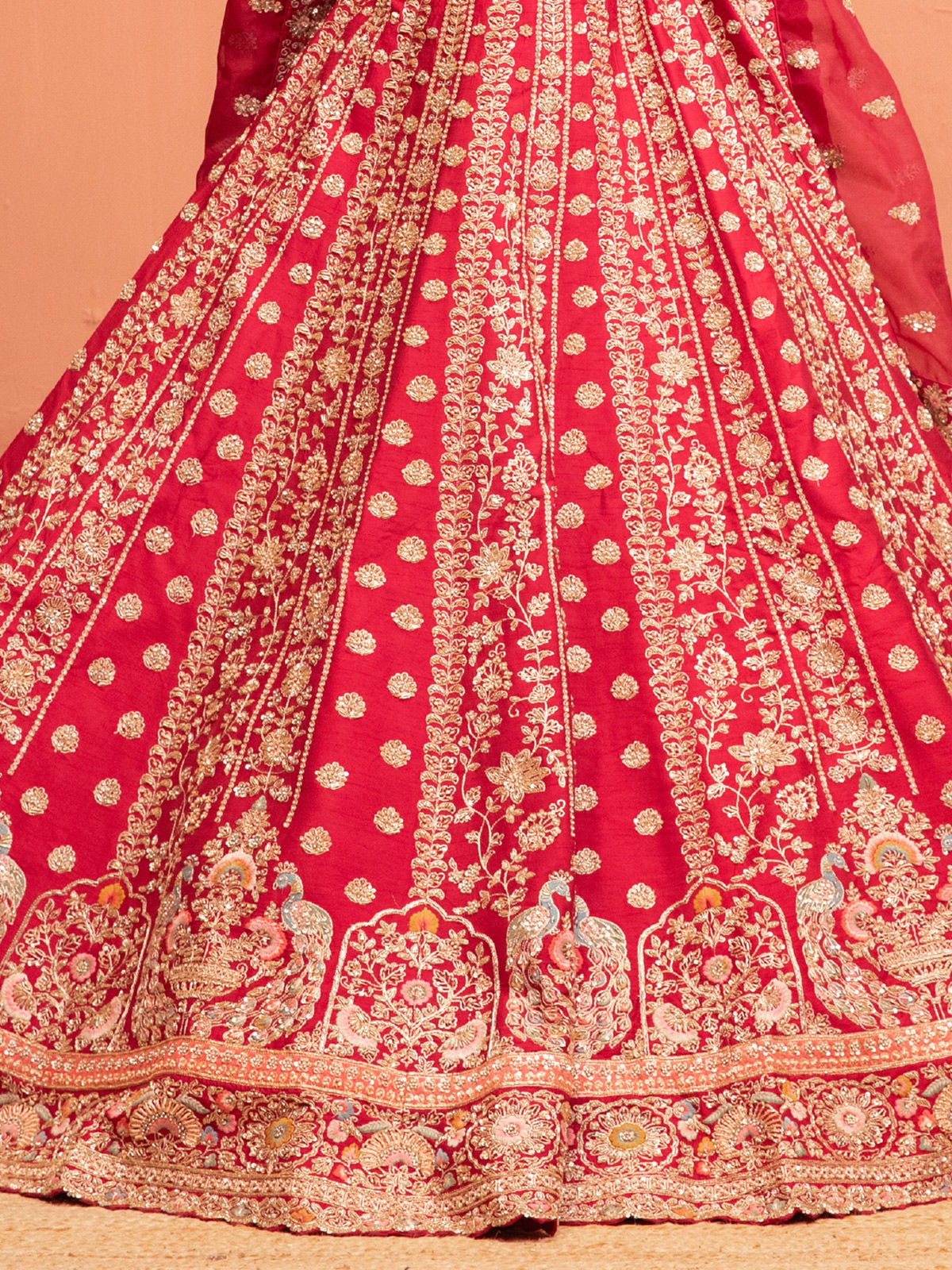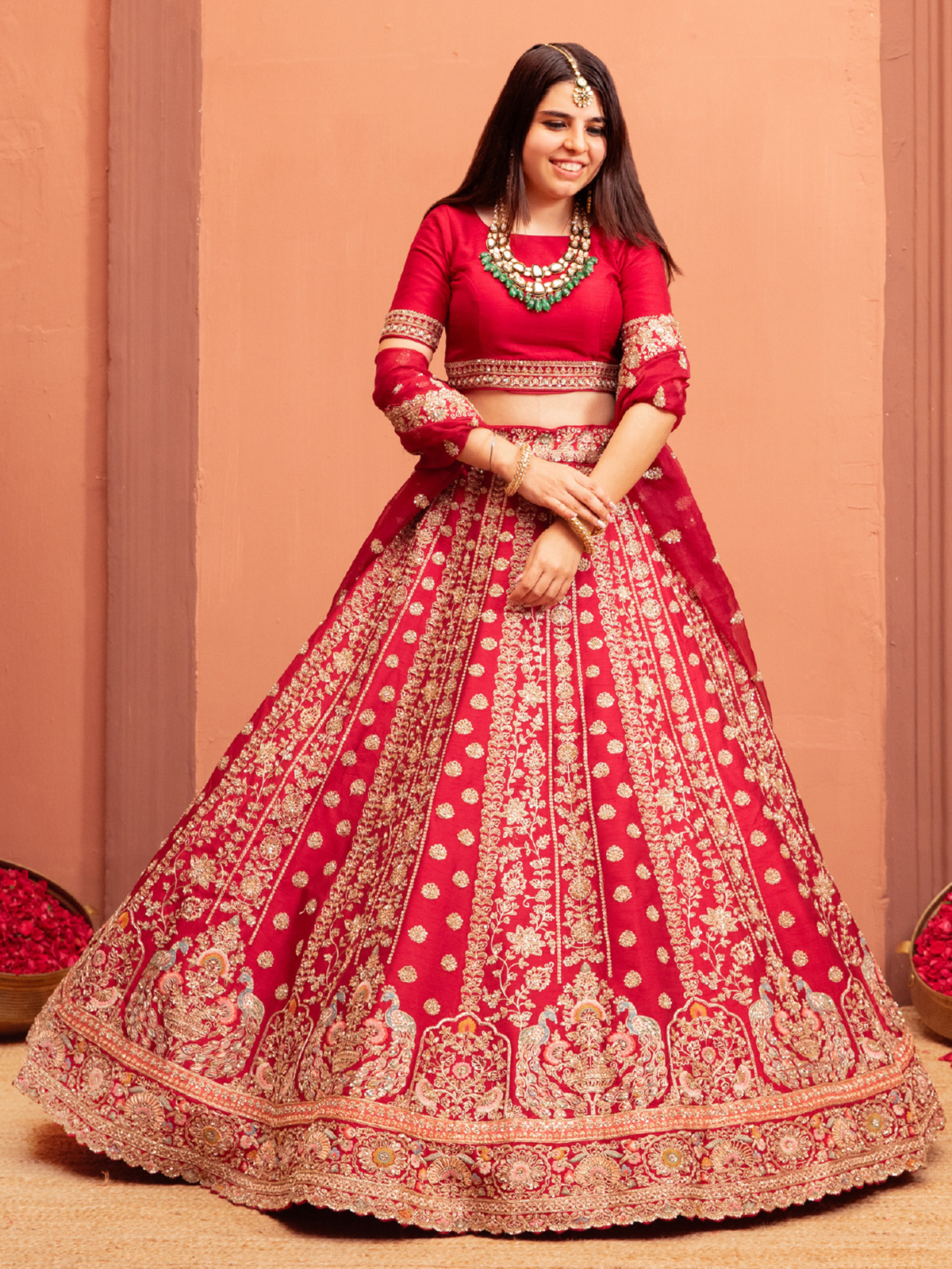 Make a striking bridal impression in this pink raw silk lehenga choli, enriched with ornate zari, resham, zardosi, sequins, beads, stones and delicate embroidery. The elegant boat neckline and elbow sleeves on the readymade blouse add refined grace to wedding festivities.