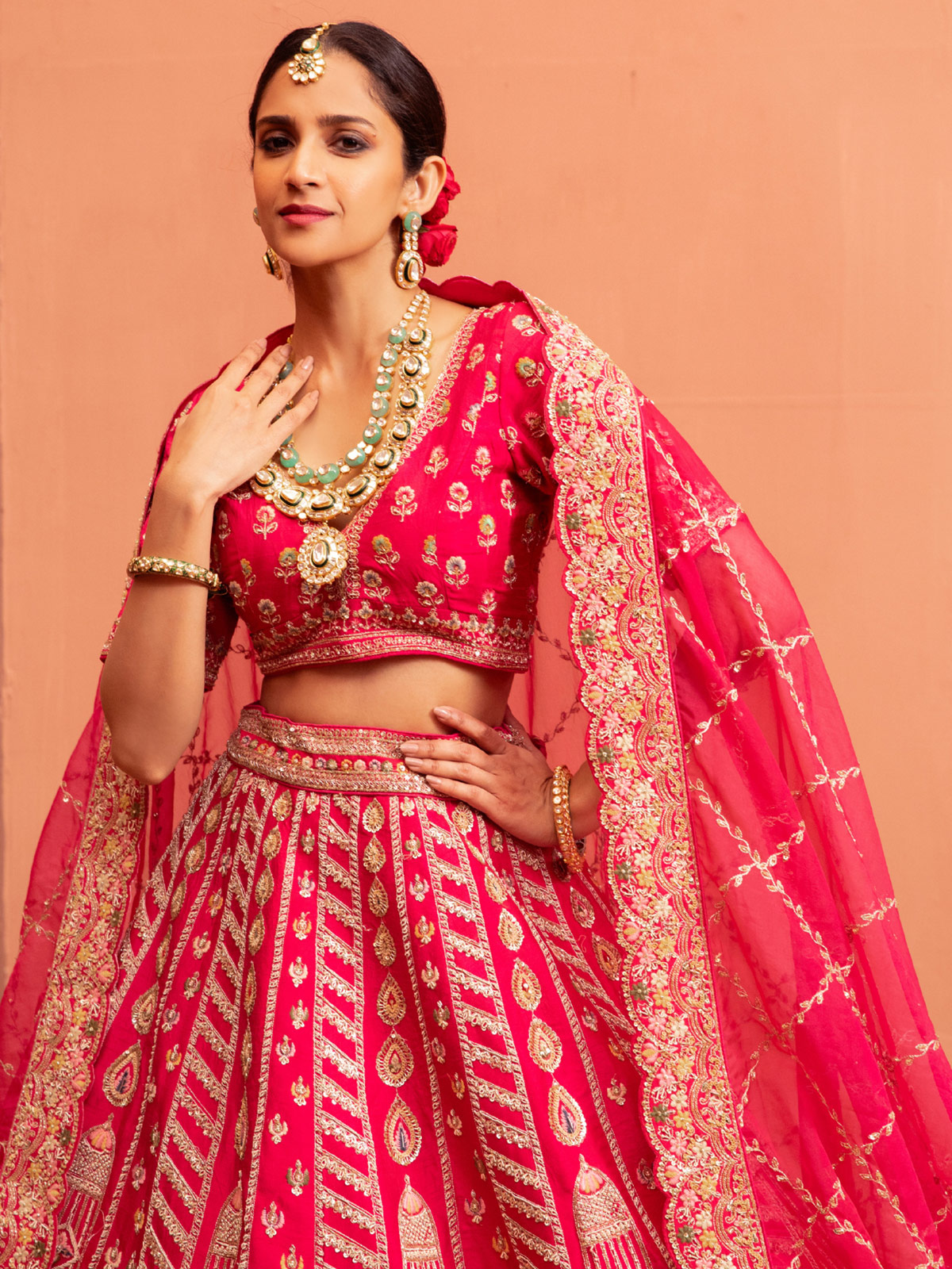 Turn heads on your special day with this pink raw silk lehenga choli, highlighted by intricate zari, zardosi, resham, cutdana, sequins, beads and embroidery. The V neck blouse with elbow sleeves completes this bridal outfit with refined beauty and festive flair.