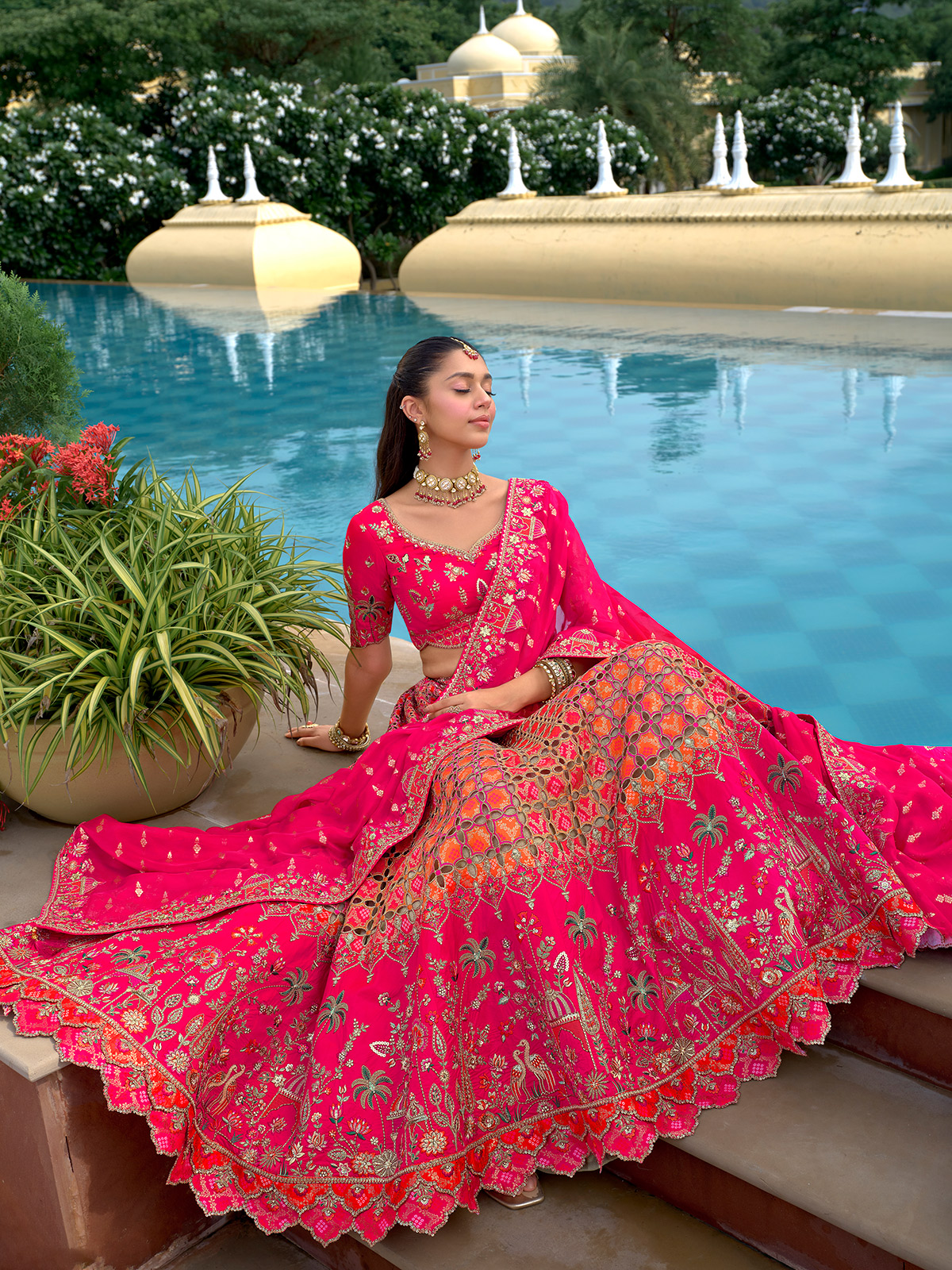 Vibrant pink silk that glows with youthful grace, this unstitched lehenga choli embraces festive beauty with every detail. Its embroidery, resham, cutwork, and sequins weave a mesmerizing texture over lehenga. Draped with a delicate net dupatta that floats like quiet poetry, it forms a perfect choice for wedding ceremonies rich in emotion and charm.