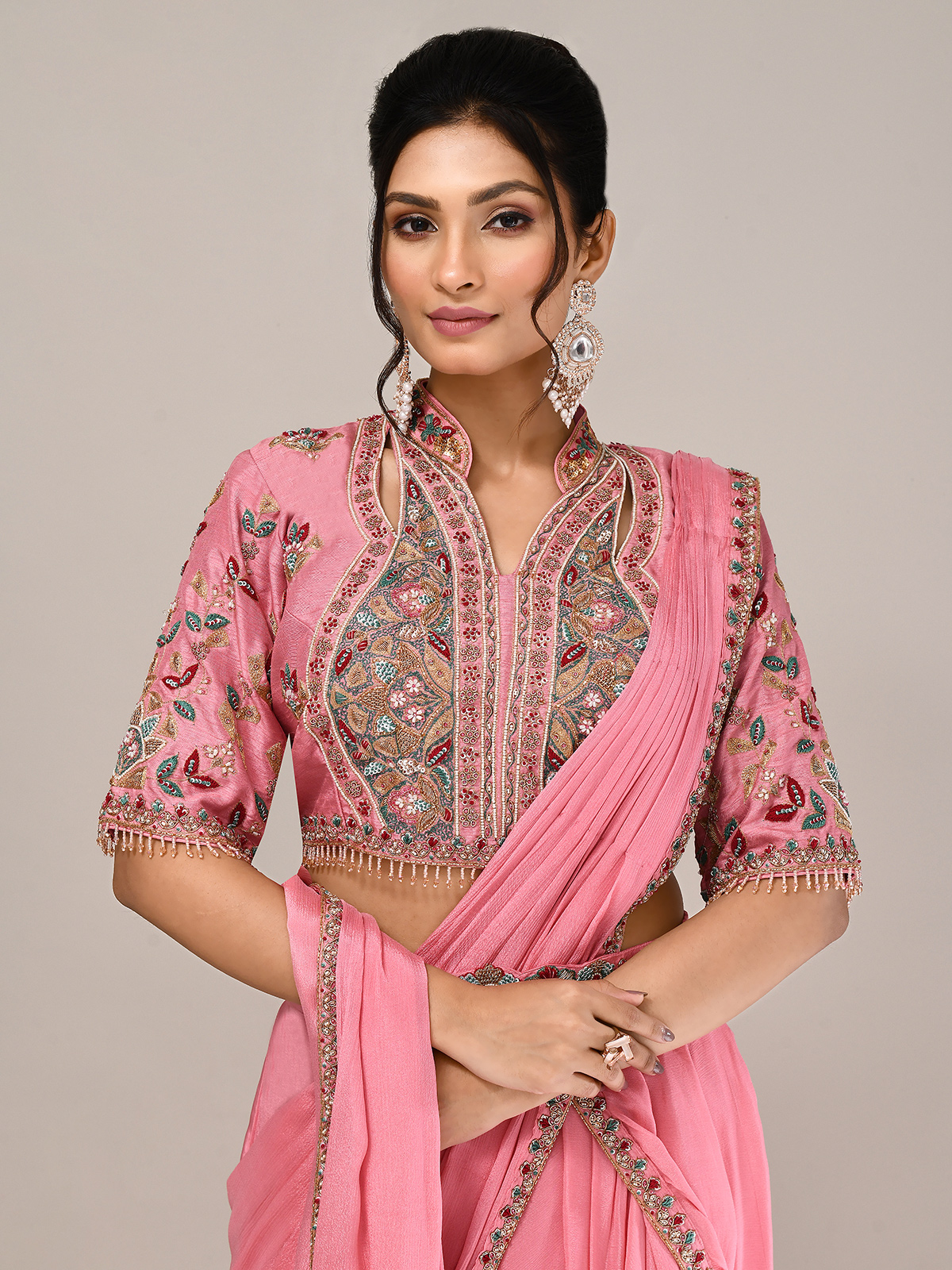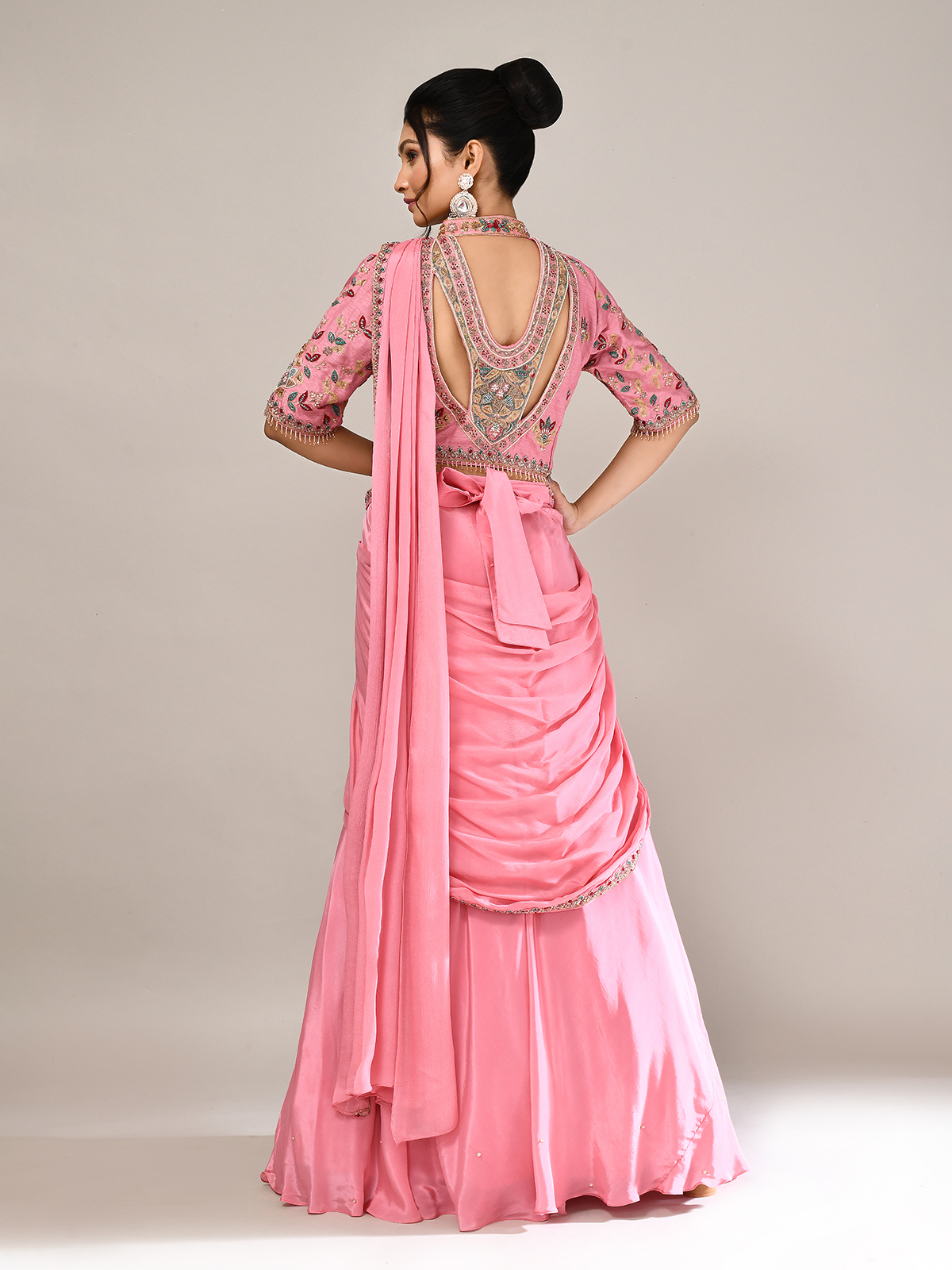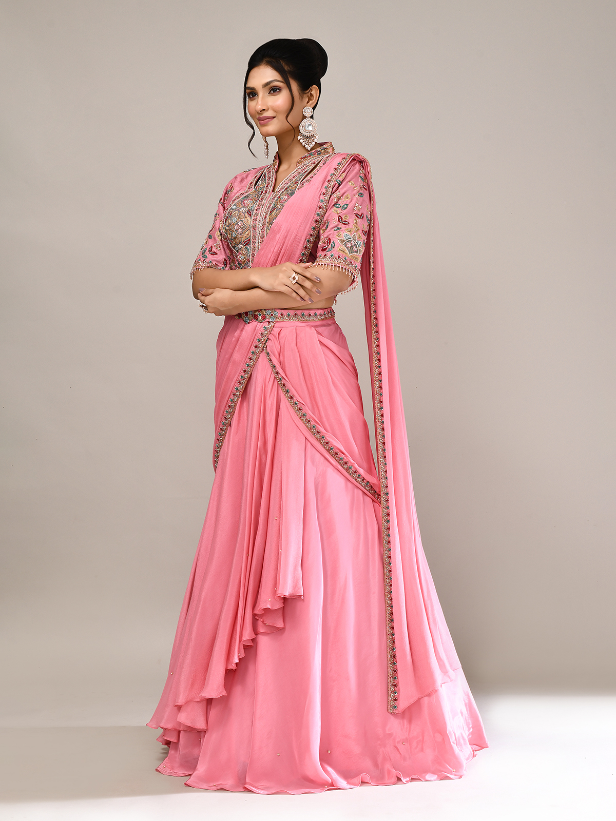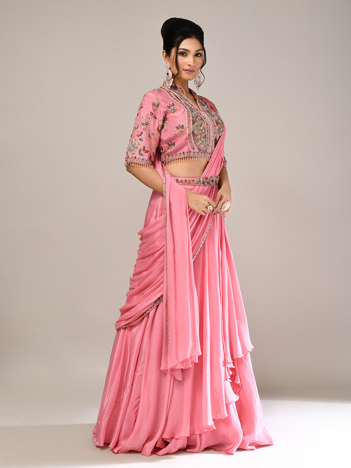 Exude charm in this pink silk lehenga choli, intricately adorned with resham, sequins, zardosi, beads, thread, and cutdana. Featuring elbow sleeves and an attached dupatta, it’s perfect for weddings and receptions. A designer masterpiece blending traditional richness with contemporary elegance, it ensures you shine with refined style.