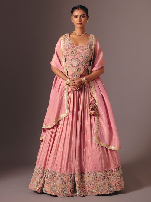 Flaunt soft elegance in this pink silk lehenga accentuated with embroidery, cutdana, sequins, beads and zardosi. The sleeveless round-neck blouse and dupatta bring refined charm to wedding and reception celebrations.