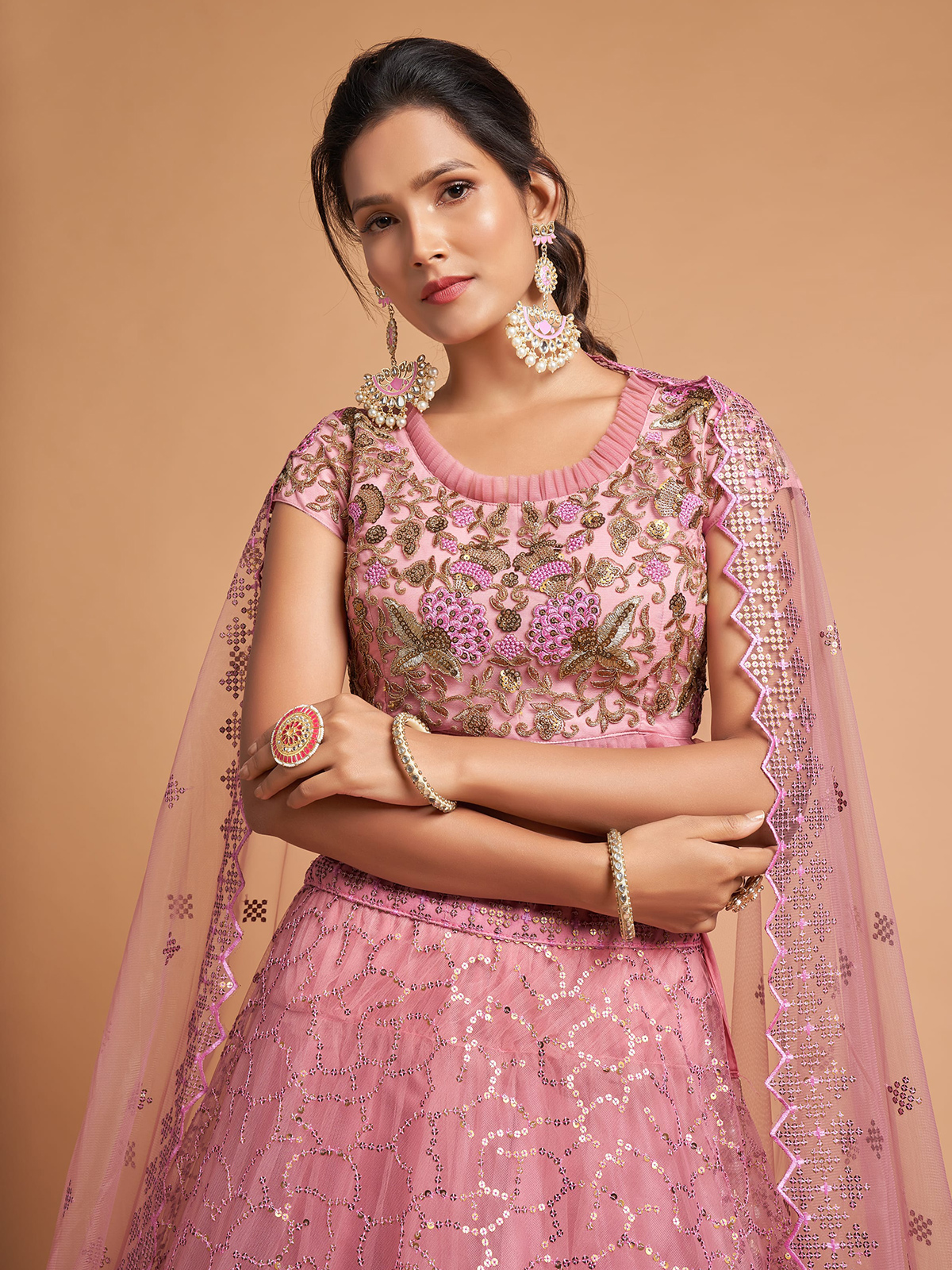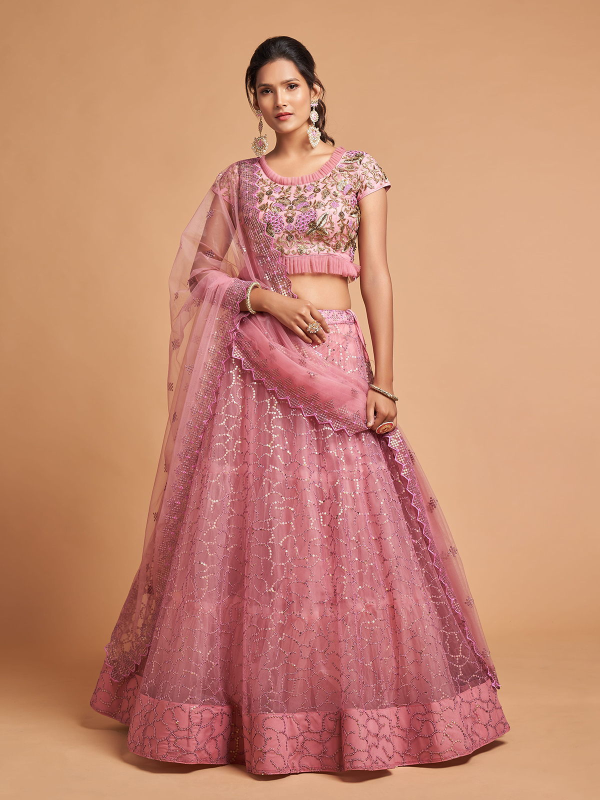 Bring soft feminine charm to your festive wardrobe with this lovely pink net unstitched lehenga choli designed for elegant celebrations. The ensemble is detailed with resham, thread, and sequin embellishments, creating a delicate and graceful look. Completed with a net dupatta, it is perfect for weddings and receptions.