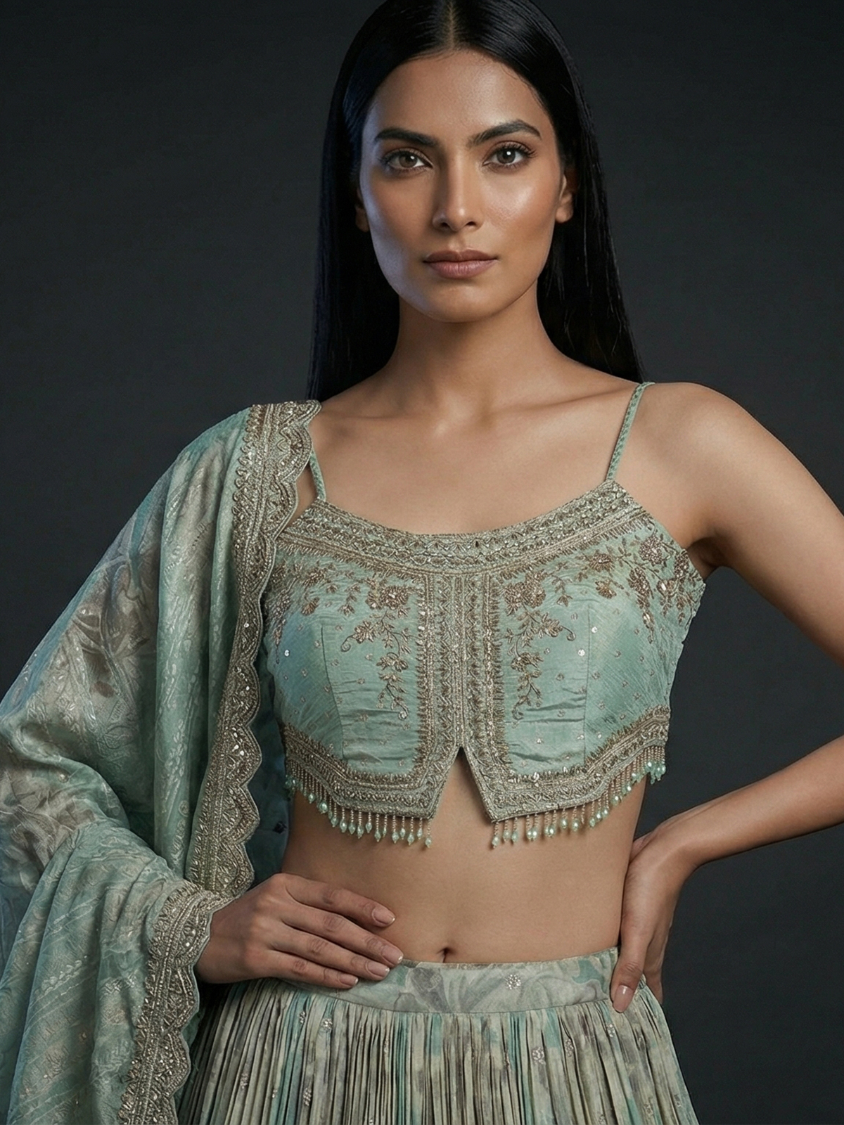 Fresh pista green tones highlight this silk lehenga choli crafted with delicate floral prints. Embellished with cutdana, zardosi, diamond, resham and sequin work. It radiates intricate elegance. The round neckline and sleeveless design create a soft silhouette. Paired with a dupatta. This ensemble is ideal for weddings, receptions and mehendi celebrations.