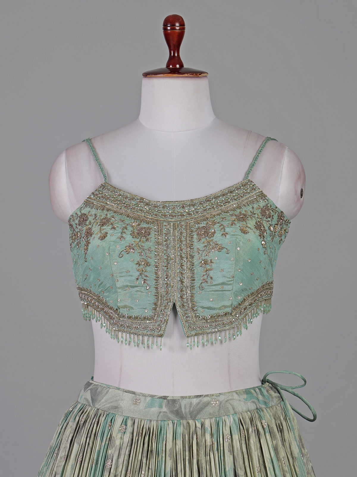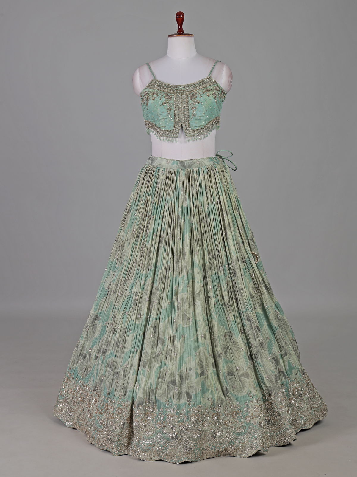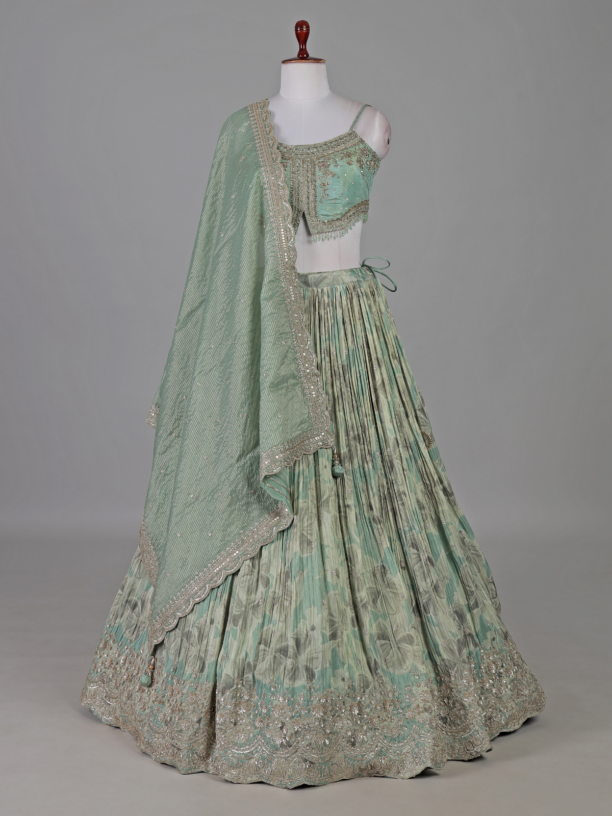 Pista Green Silk Floral Zardosi Designer Lehenga Choli