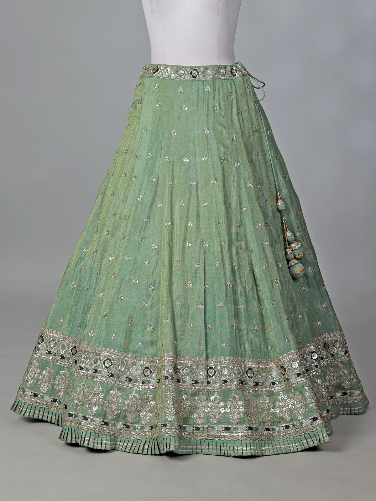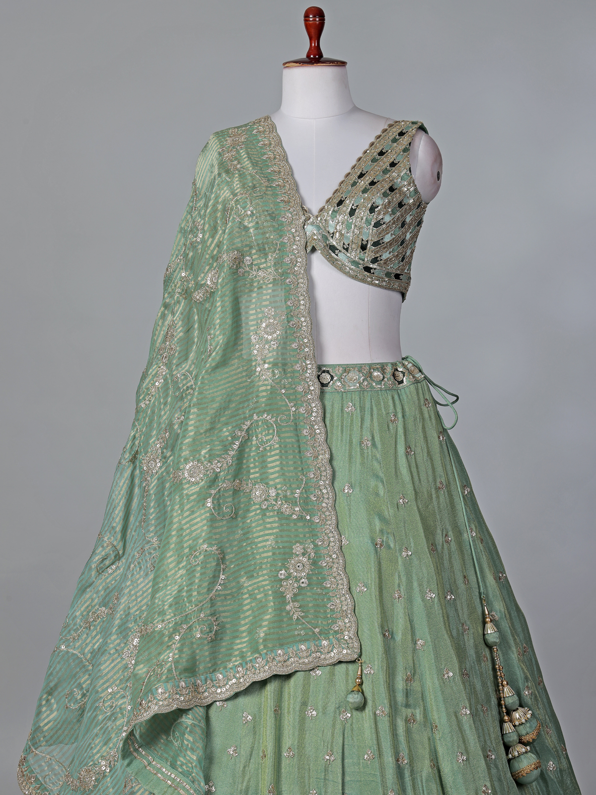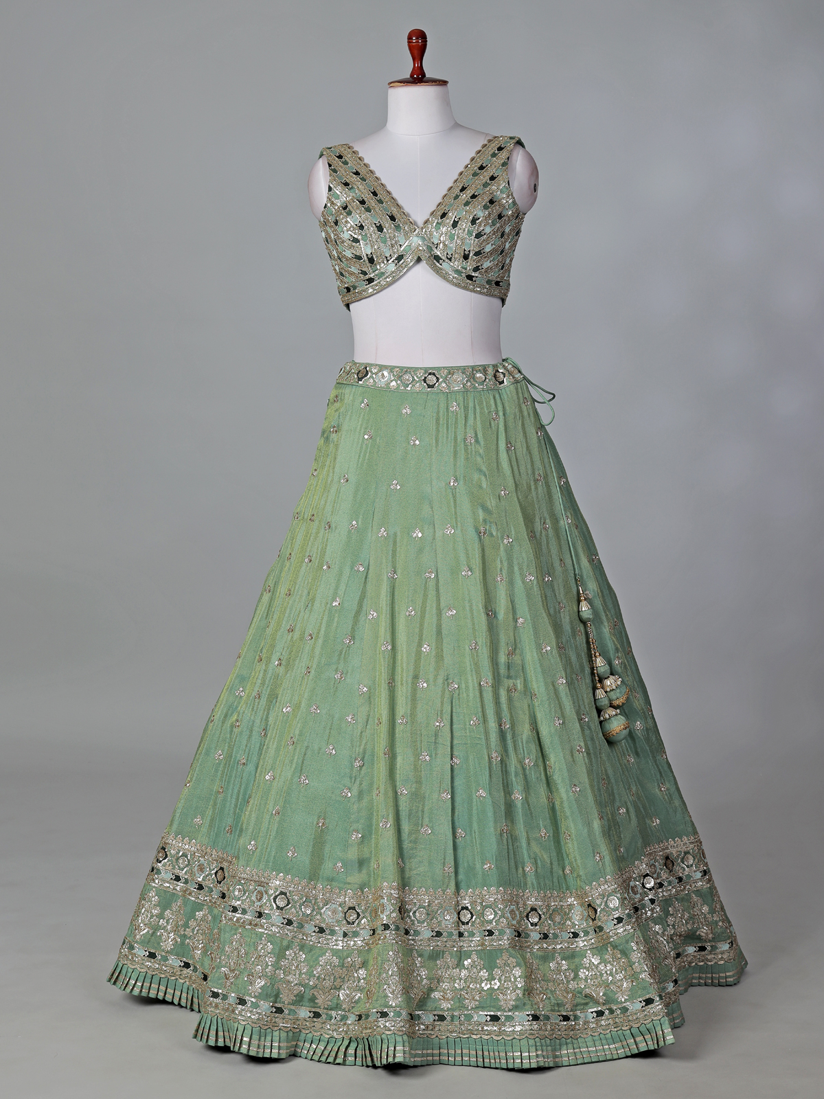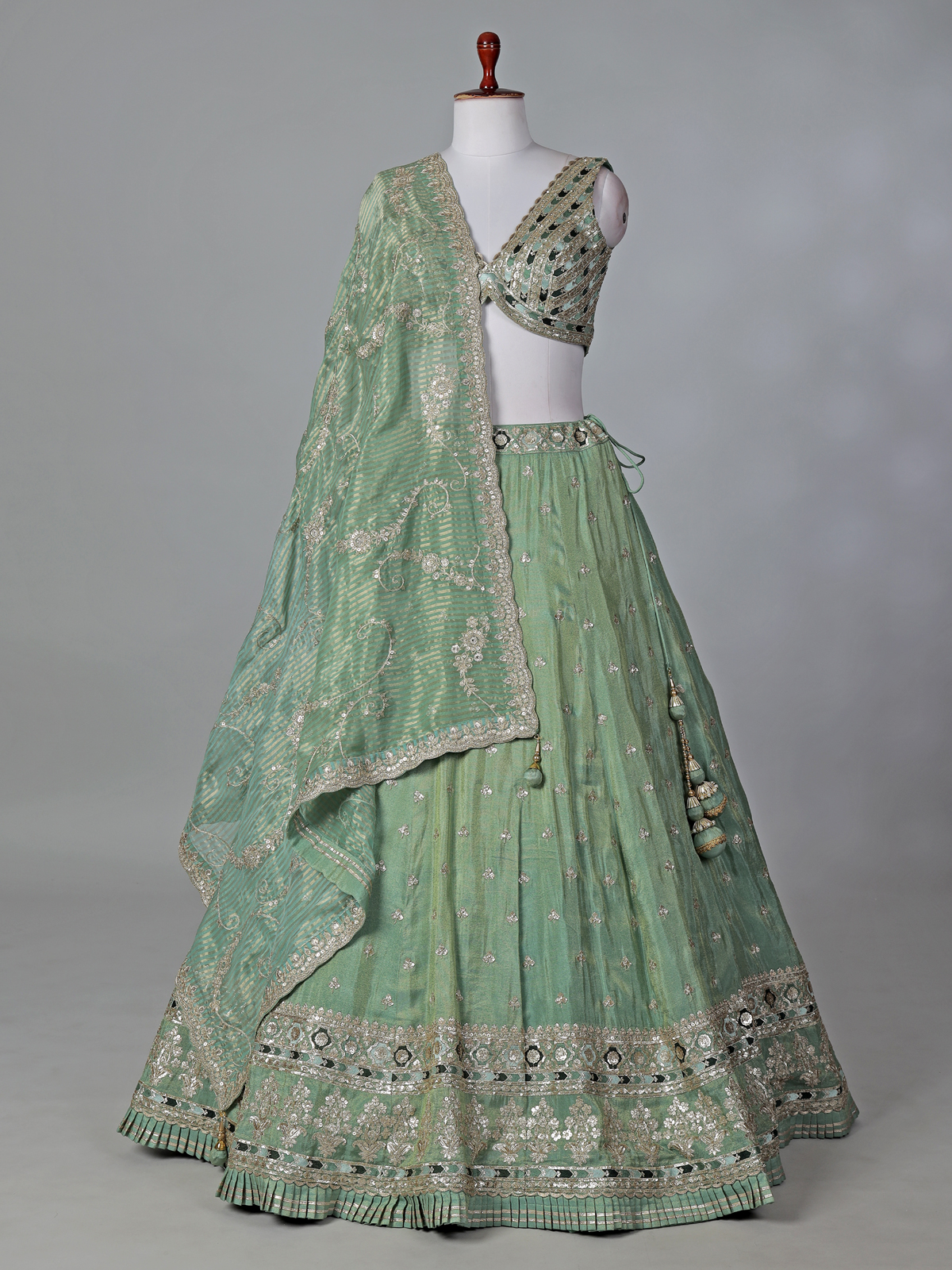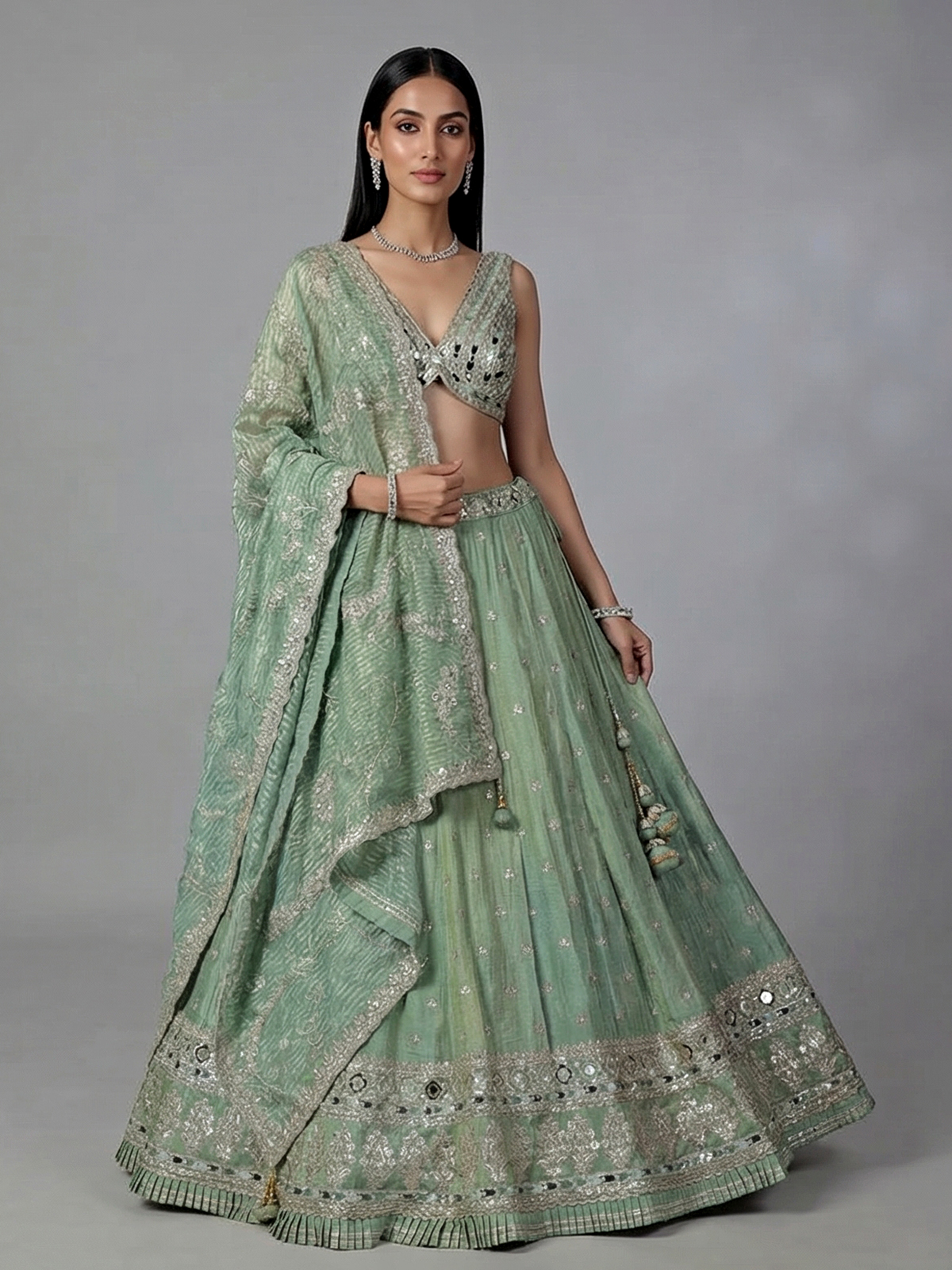 Bring refreshing charm to celebrations with this pista green silk lehenga choli. The sleeveless V-neck blouse is enhanced with thread, cutdana, resham, zardosi, and sequin work, adding luxurious sparkle. Paired with a dupatta, it is ideal for weddings, receptions, and vibrant festive gatherings.